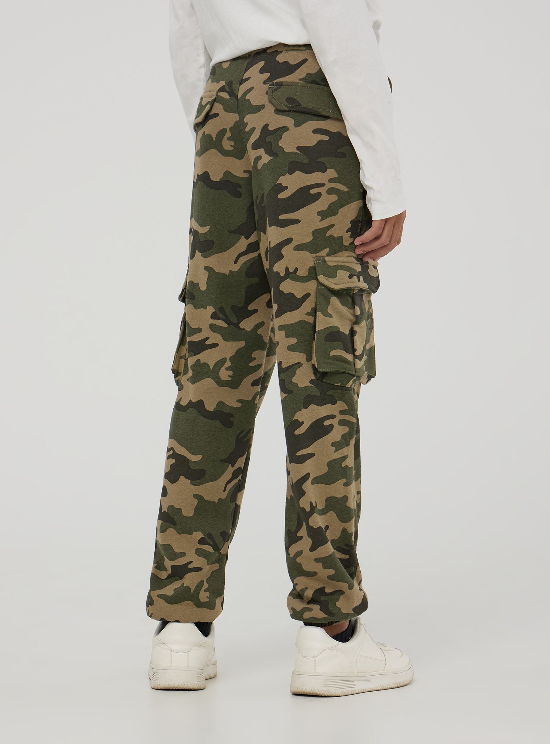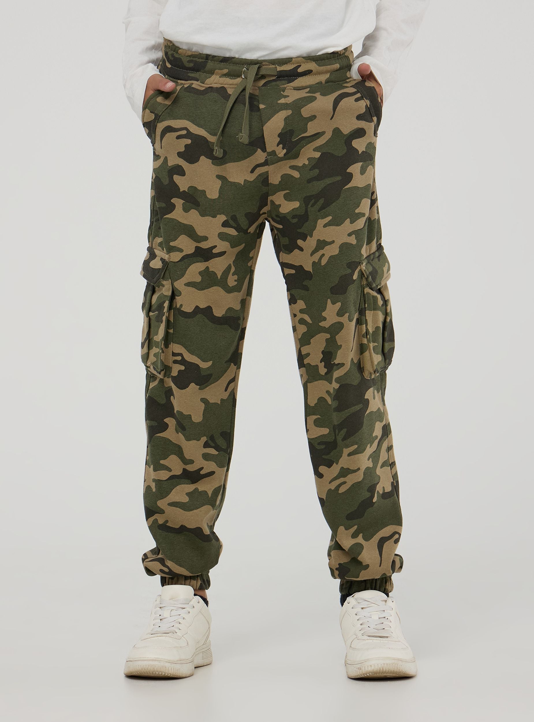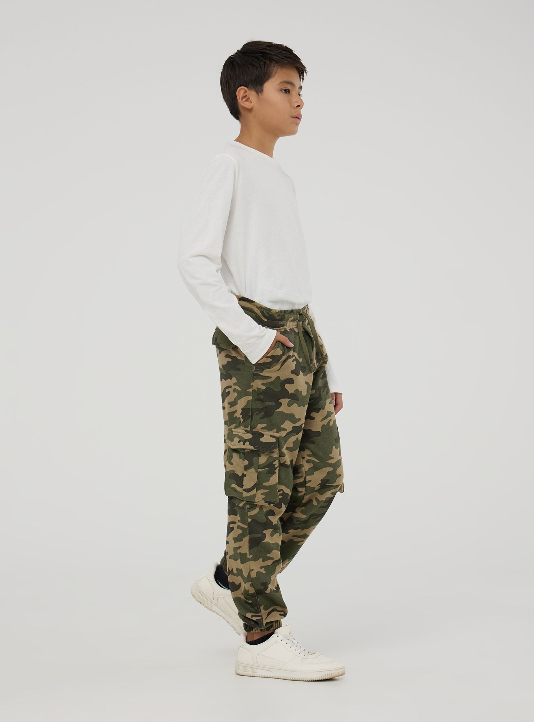 Pantaloni della tuta da bambino, realizzati in tessuto pesante mimetico. Modello cargo, dotato di coulisse in vita per regolarne la vestibilità. Comodi e perfetti per outfit casual.Podrobnosti