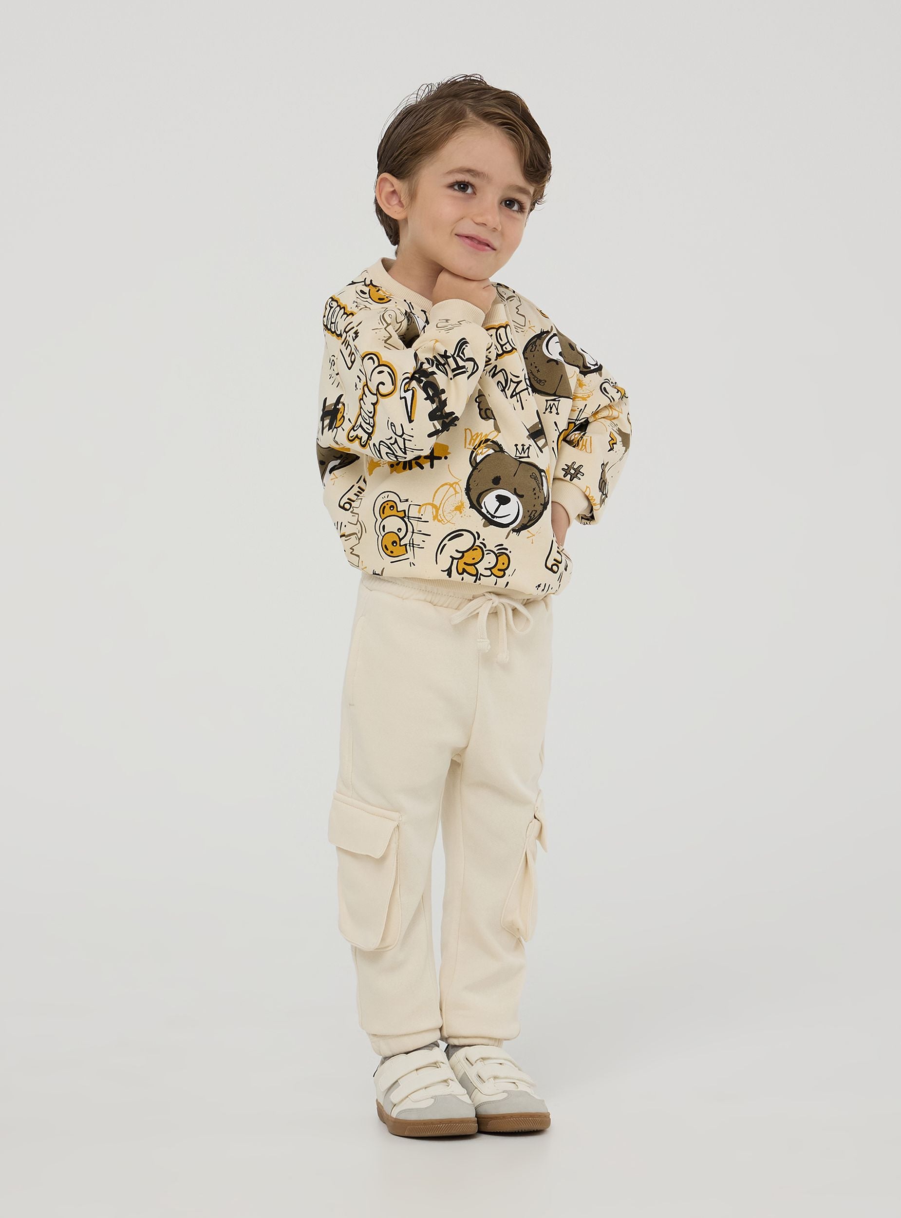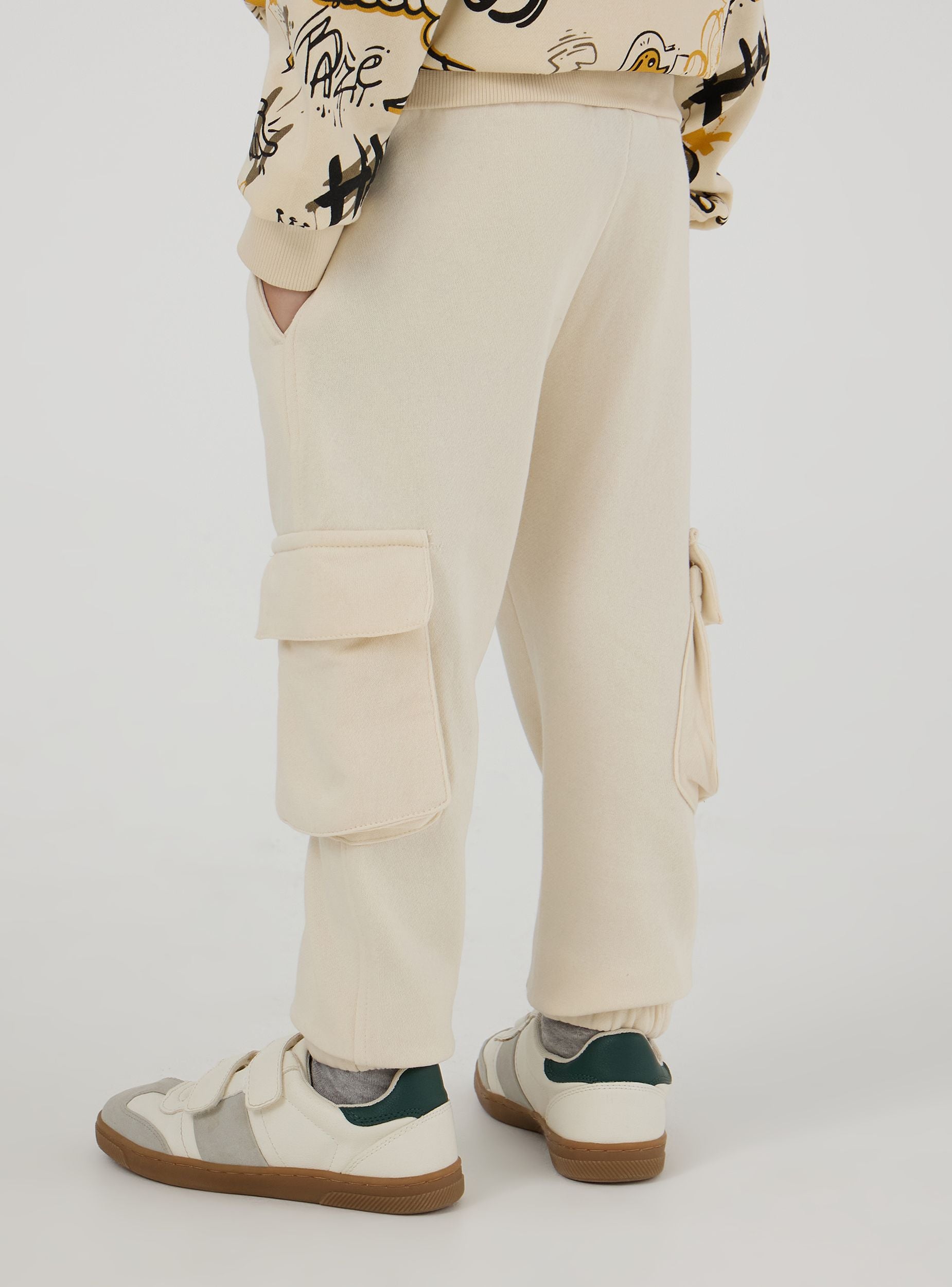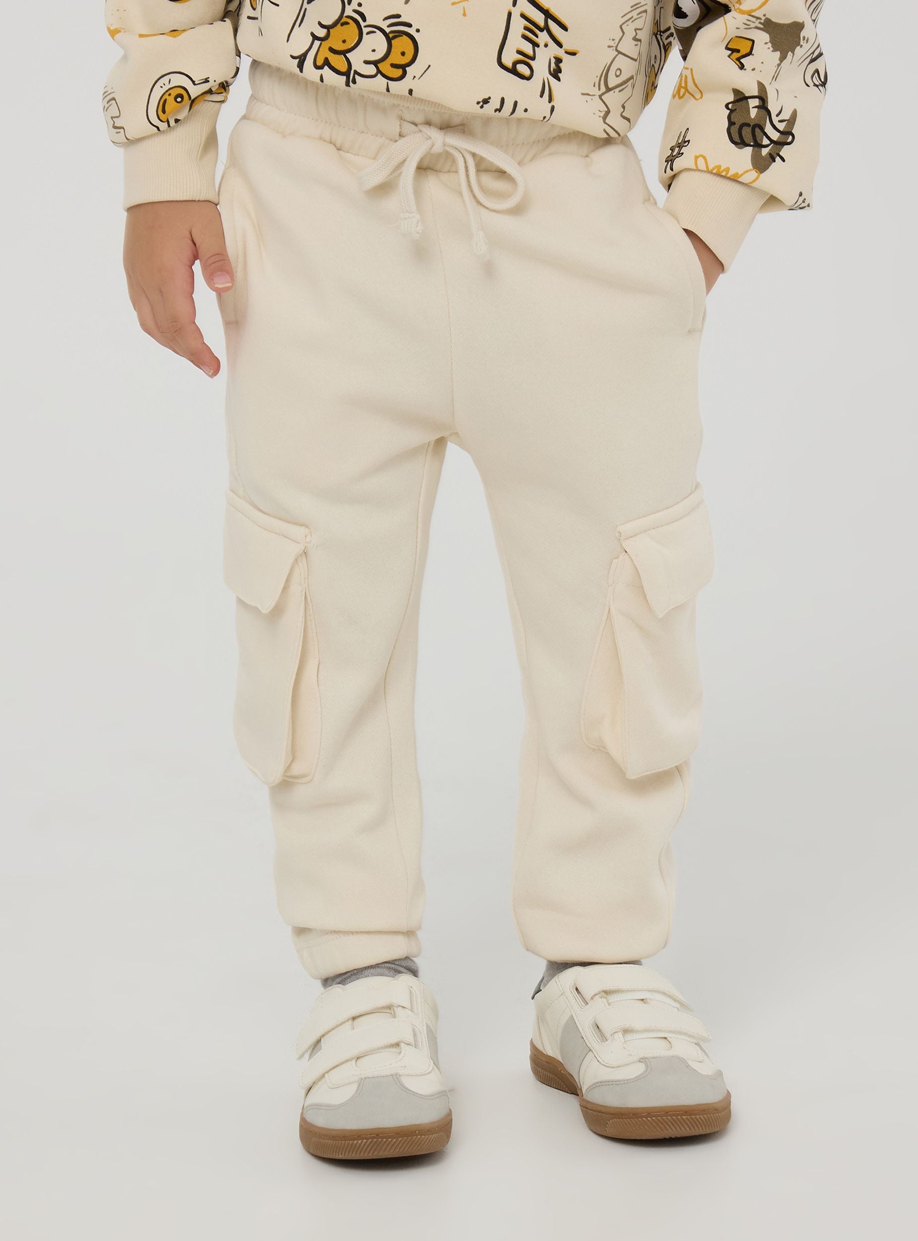 Pantaloni della tuta da bimbo realizzati in tessuto pesante a tinta unita, perfetti per le fredde giornate autunnali e invernali. Modello dotato di due tasche a filetto e due tasche cargo con patta. Presentato una vita elasticizzata con coulisse per regolarne la vestibilità e due polsini alle caviglie elasticizzati per un ottimo comfort.Podrobnosti