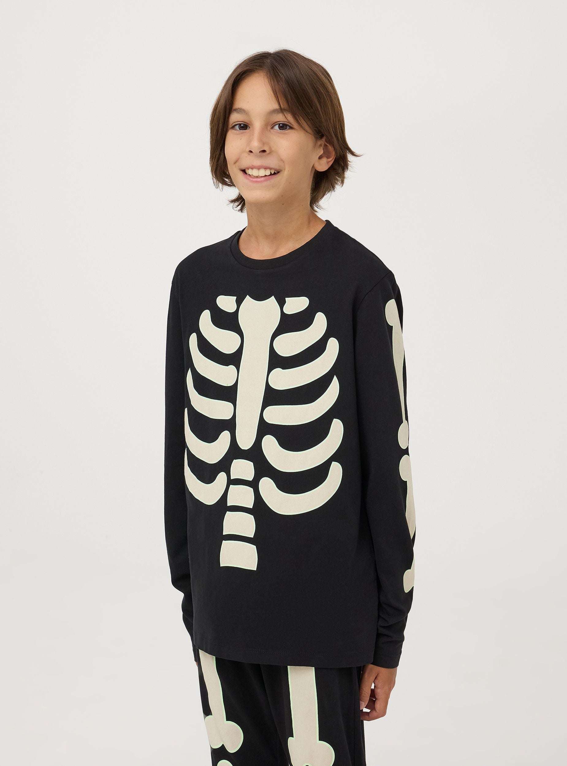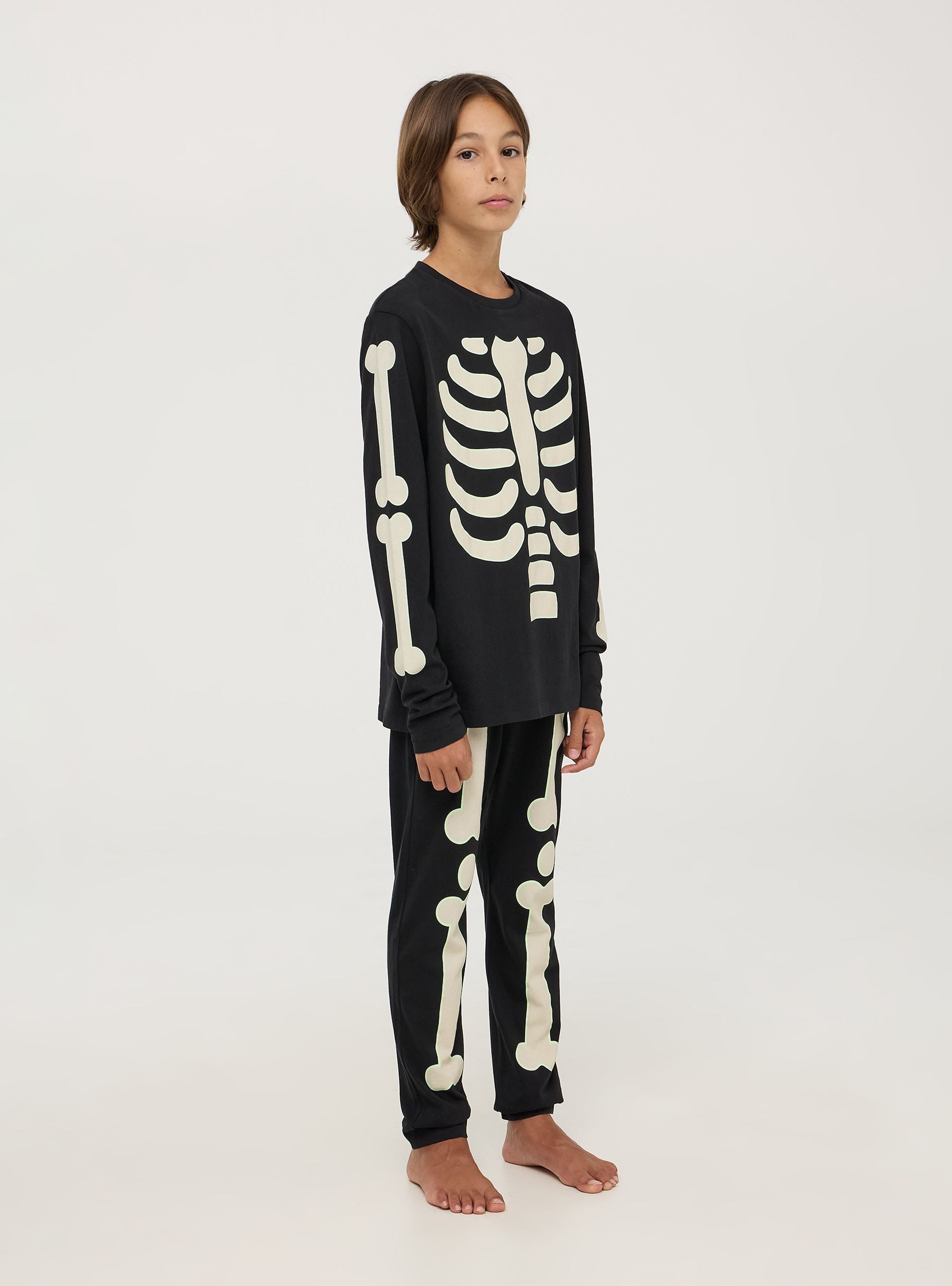 Pigiama da bambino a tema Halloween, composto da una maglia a maniche lunghe e pantaloni lunghi. Il design presenta una stampa scheletrica che si illumina al buio, perfetta per la notte di Halloween o per divertirsi con gli amici. La vestibilità è comoda, ideale per garantire il massimo comfort durante il sonno.Podrobnosti