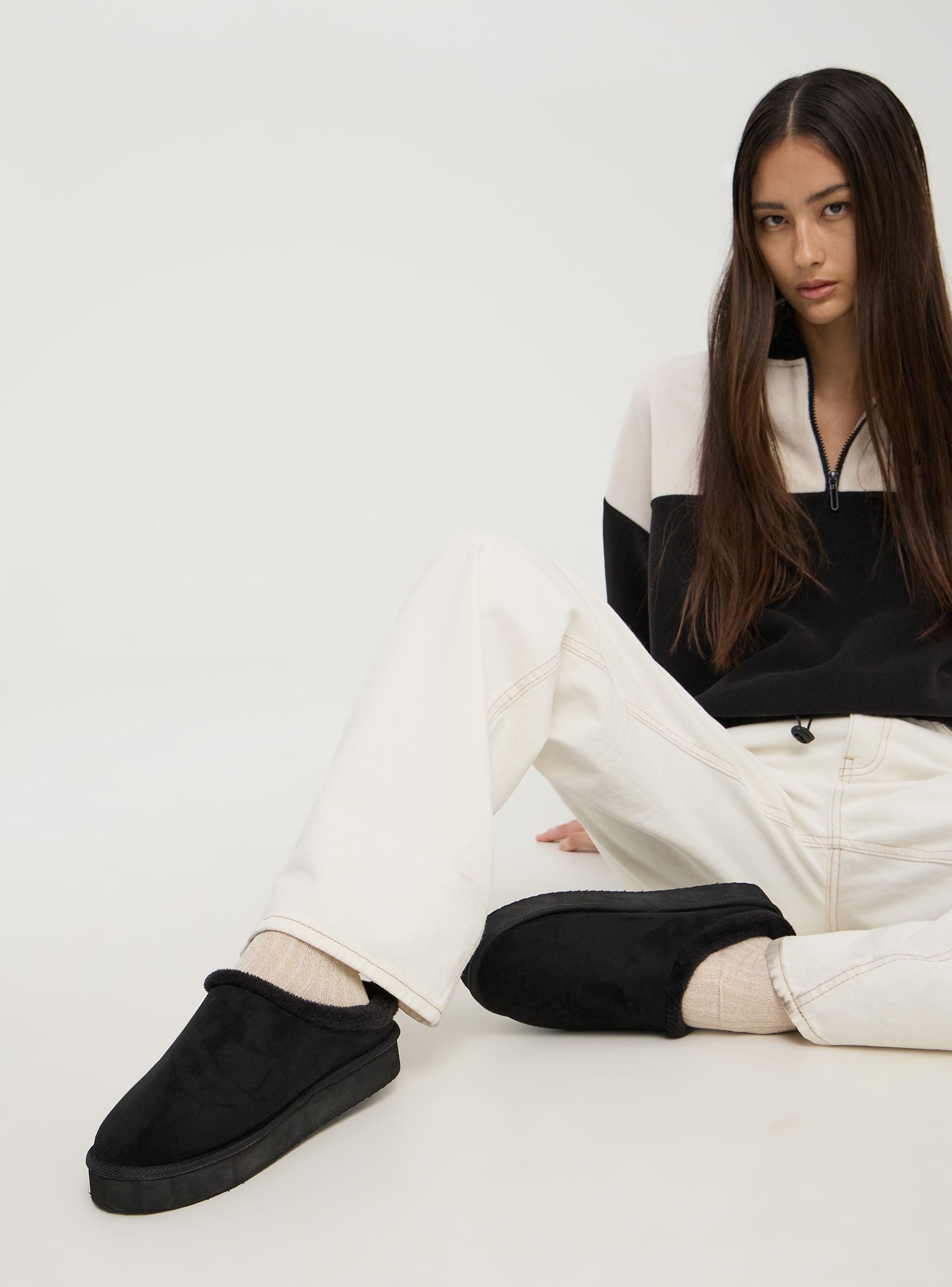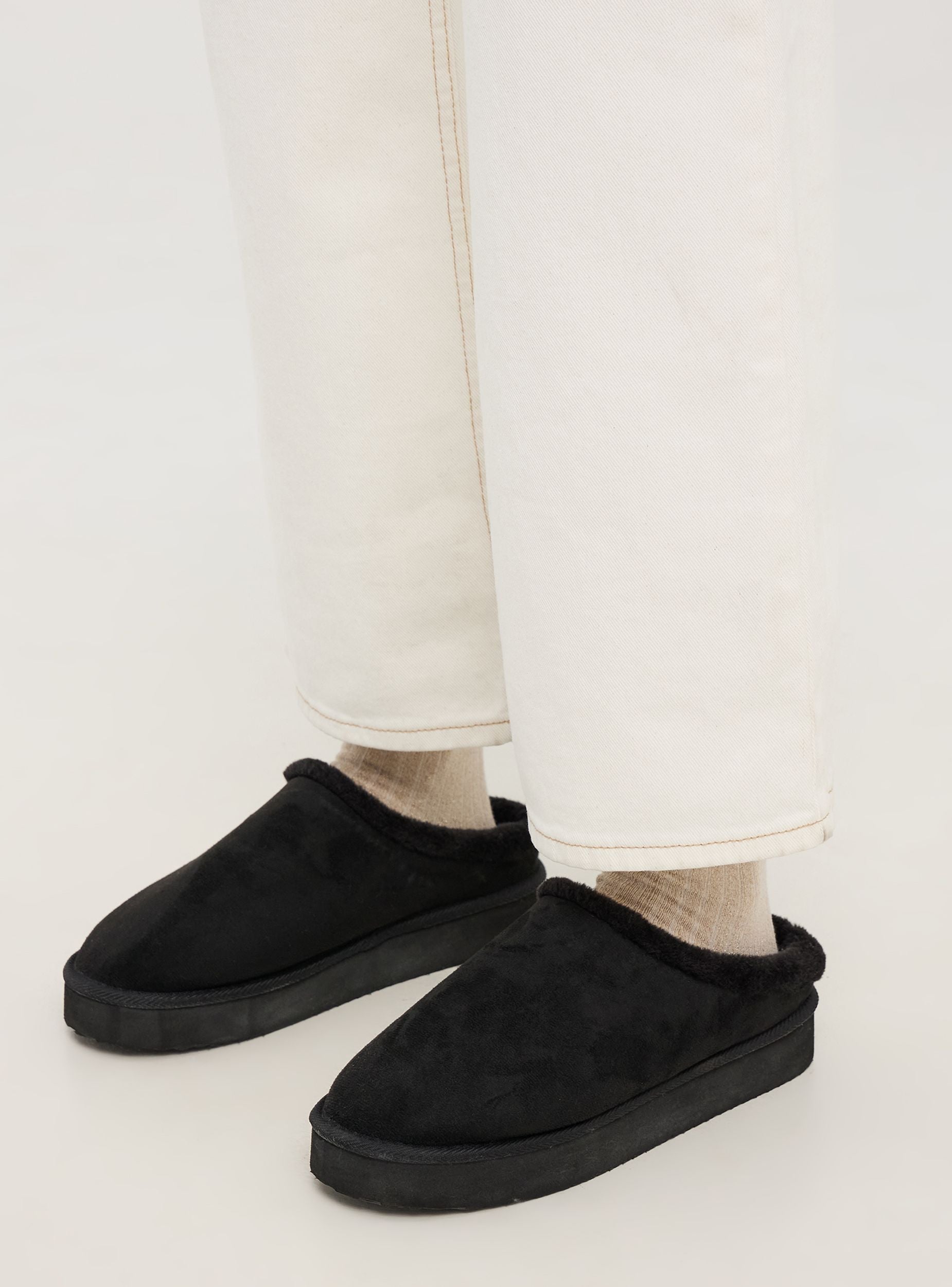 Sabot da donna con fodera interna in pelliccia sintetica che garantisce calore e morbidezza. Presentano un design confortevole e caldo, ideale per l'inverno. Sono dotati di una suola piatta e robusta che offre stabilità e supporto durante l'uso. La struttura del sabot permette una facile calzata e una buona vestibilità, rendendoli perfetti per l'uso quotidiano. Il tessuto effetto suede ha un trattamento idrorepellente che li rende resistenti all'acqua e garantisce un'ottima praticità nelle fredde giornate invernali.
