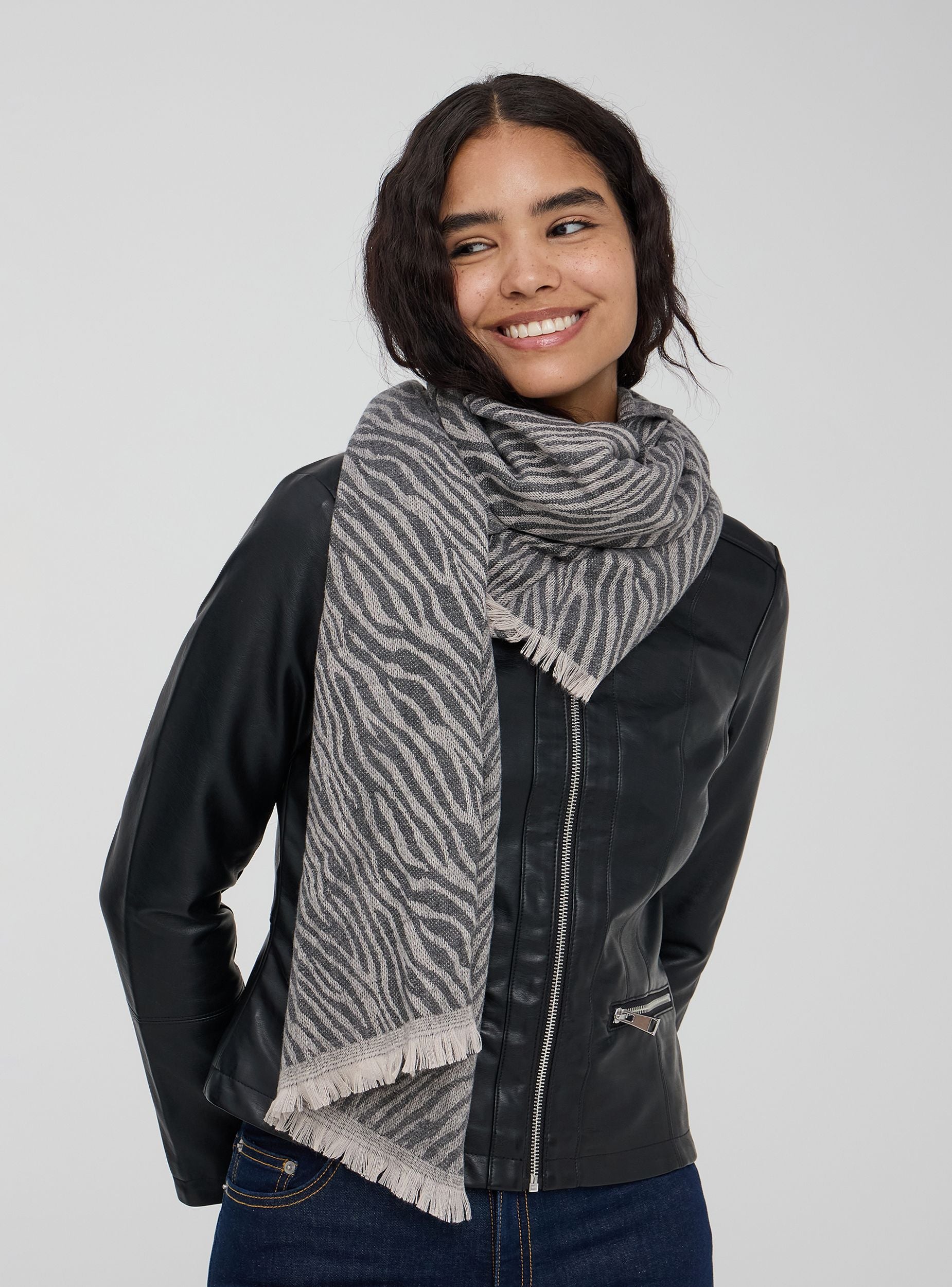 Sciarpa leggera da donna perfetta per garantire calore e comfort durante le giornate più fresche. Di colore grigio con un pattern a righe zebrato, aggiunge un tocco di stile selvaggio e contemporaneo al tuo abbigliamento. Rifinita con frange sottili alle estremità, offre una vestibilità avvolgente e chic. Ideale per occasioni casual e formali, è l'accessorio versatile perfetto per completare qualsiasi look.Podrobnosti