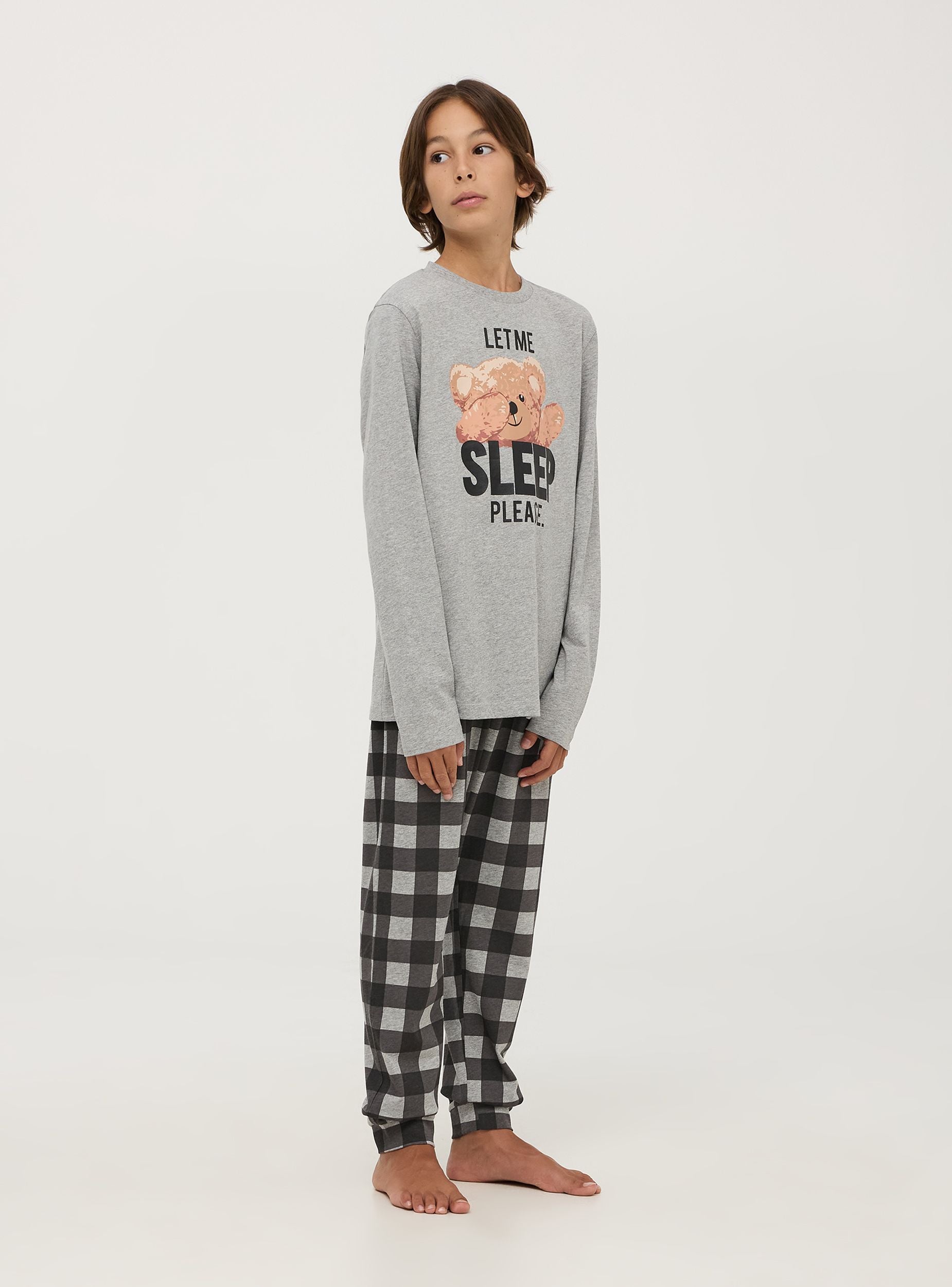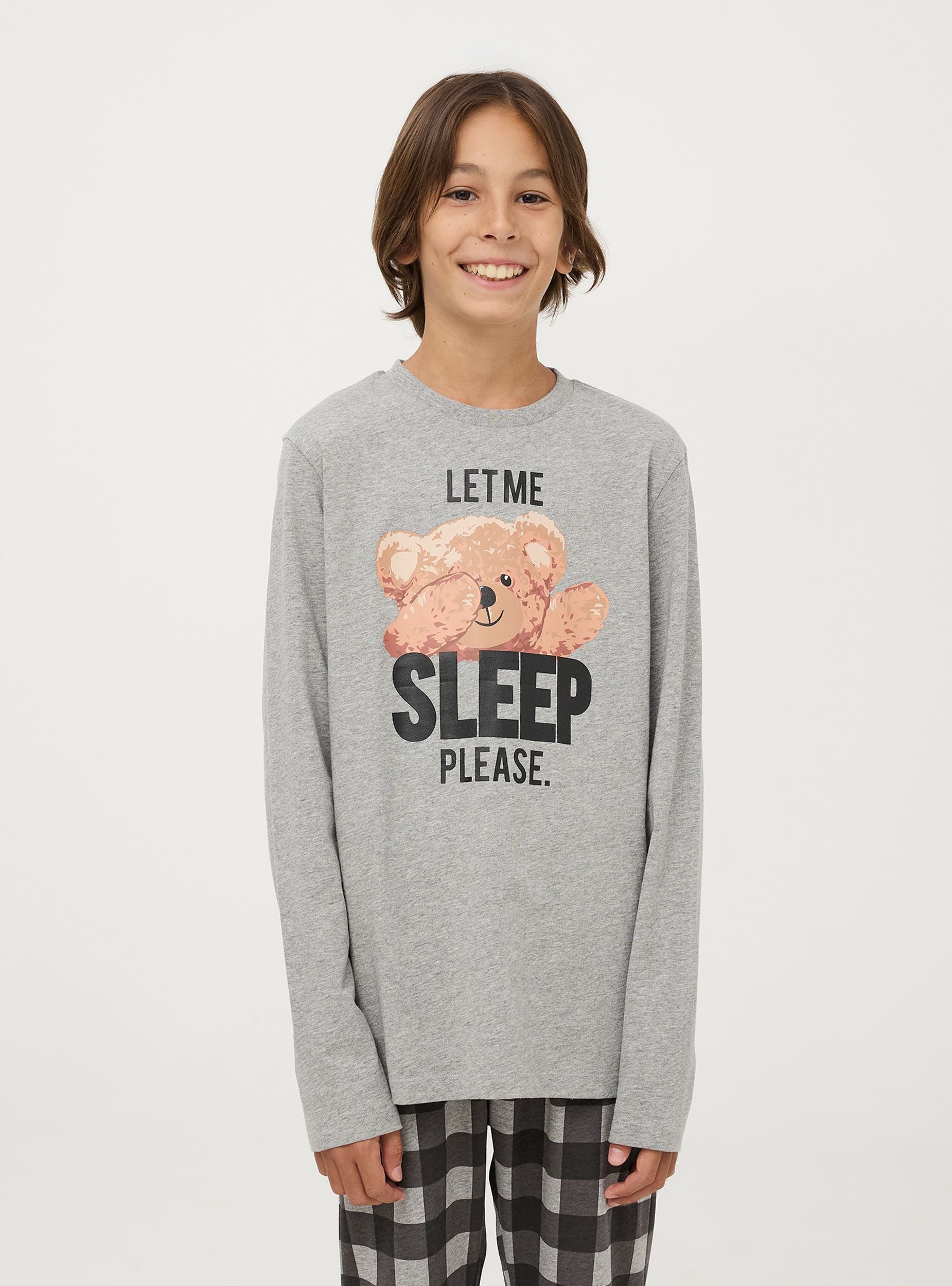 Pigiama da bambino composto da maglia a maniche lunghe e pantaloni lunghi. La maglia presenta una stampa frontale con un dolce orsetto e la scritta "Let me sleep, please." I pantaloni hanno un motivo a quadri, aggiungendo un tocco di stile al completo. Realizzato in tessuto morbido e confortevole, è ideale per garantire un riposo sereno e piacevole.
