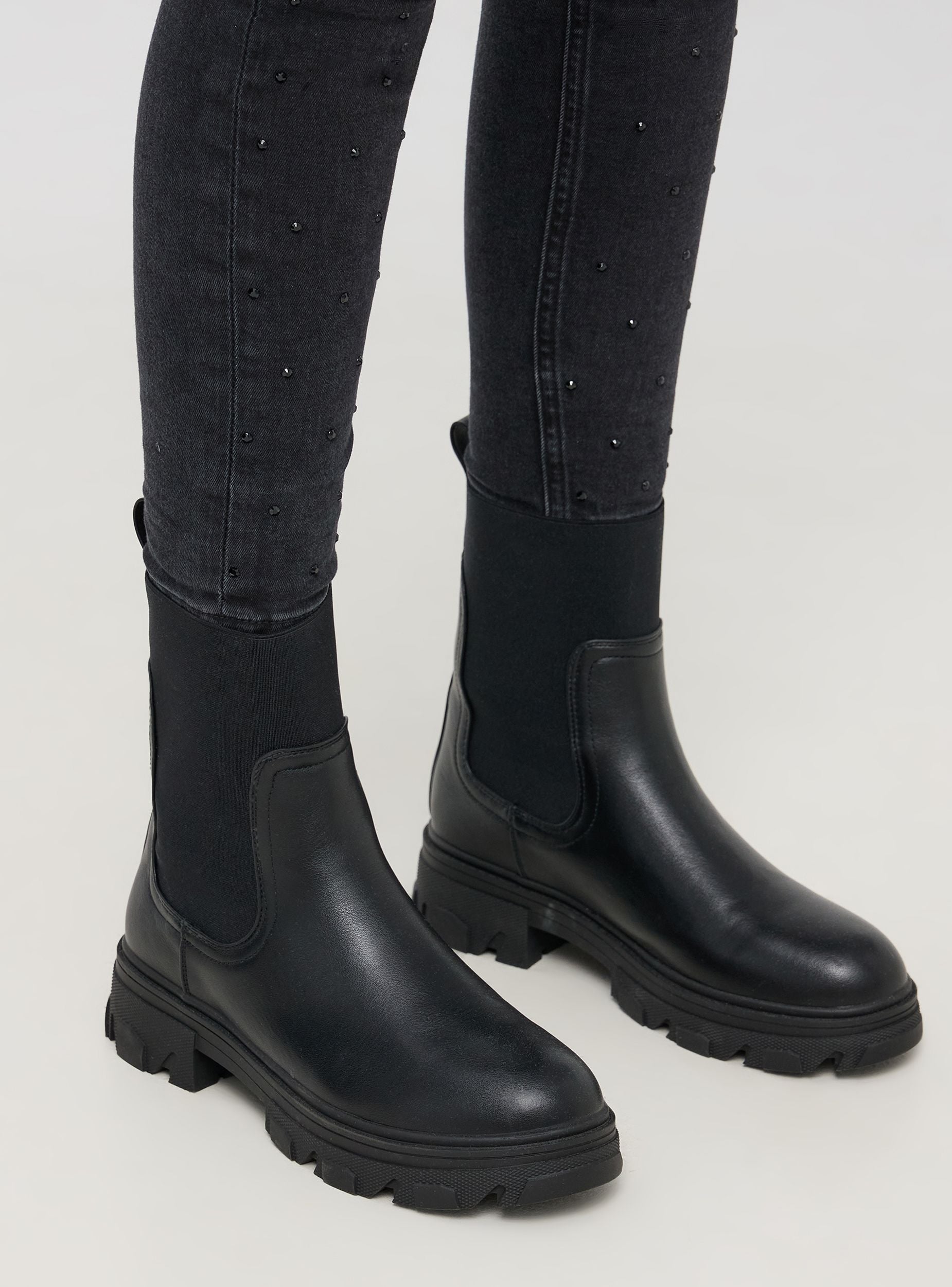 Stivaletto chelsea combat da donna realizzato in similpelle. Presenta un elastico laterale per una calzata comoda. Il design è reso unico dalle cuciture tono su tono e dalla suola carrarmato in gomma che garantisce stabilità e comfort. Ideale per un look casual o per un outfit da lavoro. Perfetto per le giornate fredde.