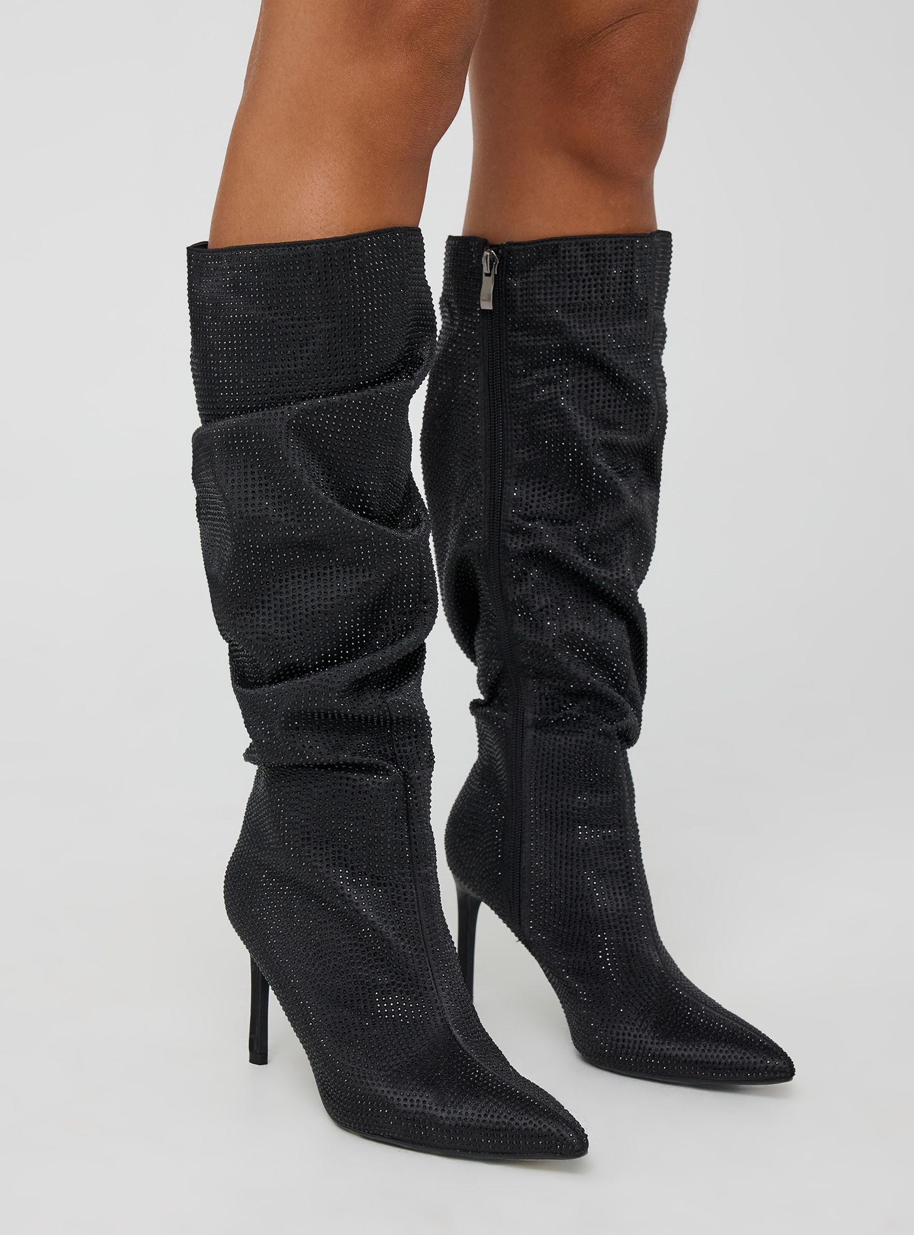 Stivali alti da donna con tacco caratterizzati da un design elegante e moderno. Hanno una punta affusolata che conferisce un aspetto sofisticato e slanciato. Decorati con piccoli strass scintillanti che donano un effetto brillante, rendendoli ideali per occasioni speciali o serate eleganti. La struttura degli stivali presenta un gambale alto e arricciato, che crea un effetto drappeggiato molto chic. Chiusura con cerniera sul lato interno. Il tacco a stiletto aggiunge ulteriore altezza e femminilità al design, mantenendo una linea pulita e raffinata. Questi stivali sono perfetti per chi desidera aggiungere un tocco di glamour al proprio outfit, senza rinunciare alla comodità e allo stile. Altezza tacco 10 cm.Podrobnosti