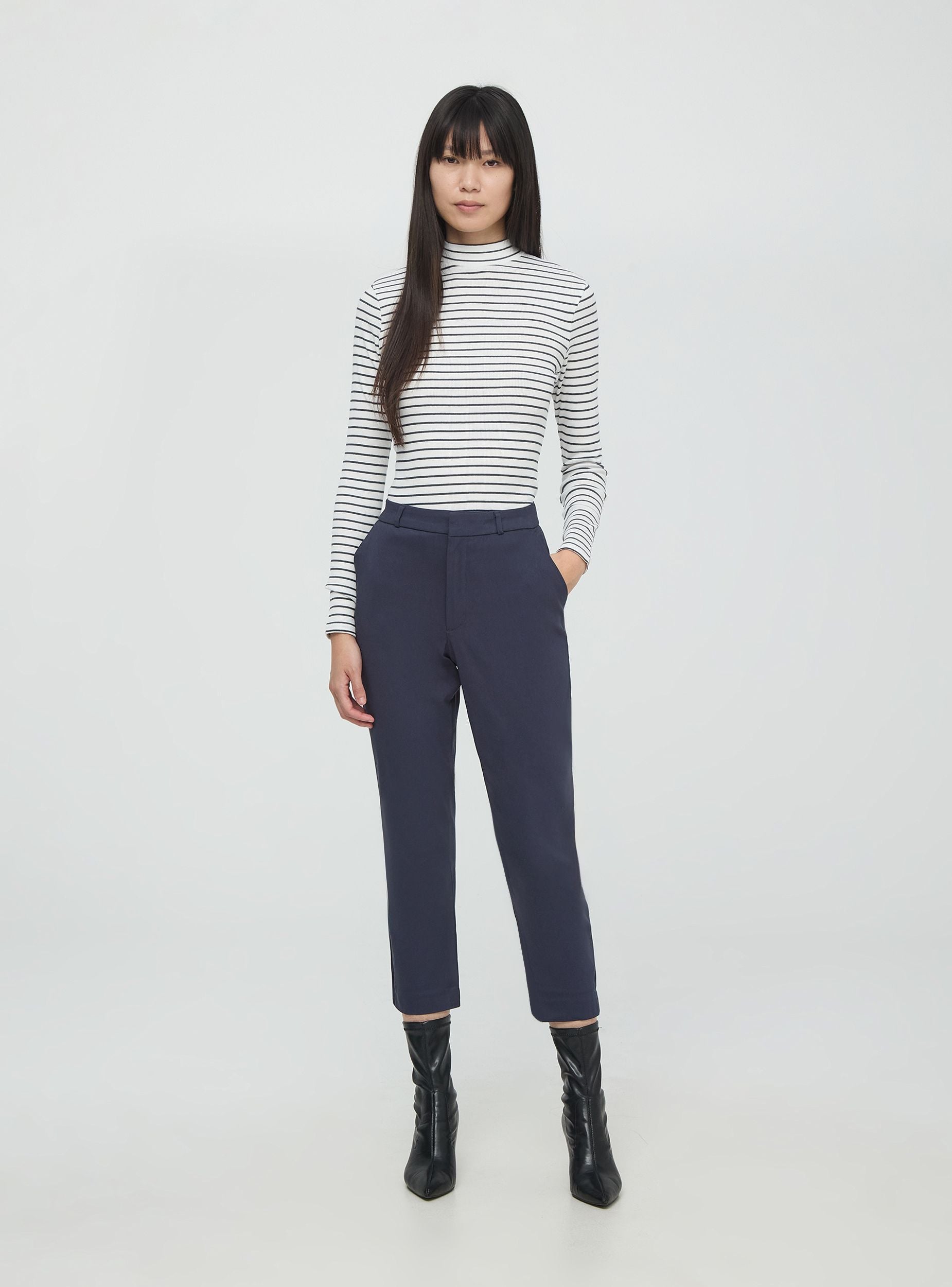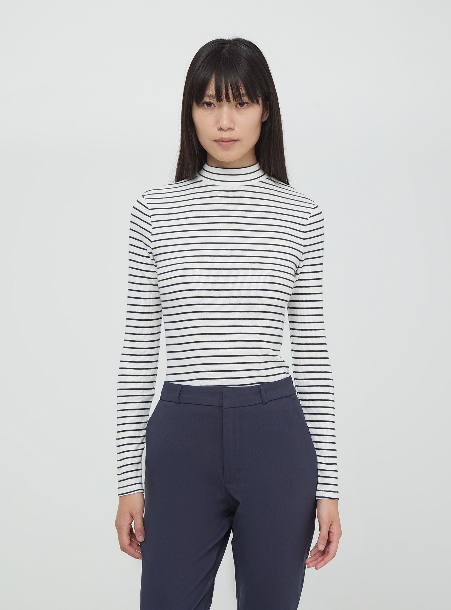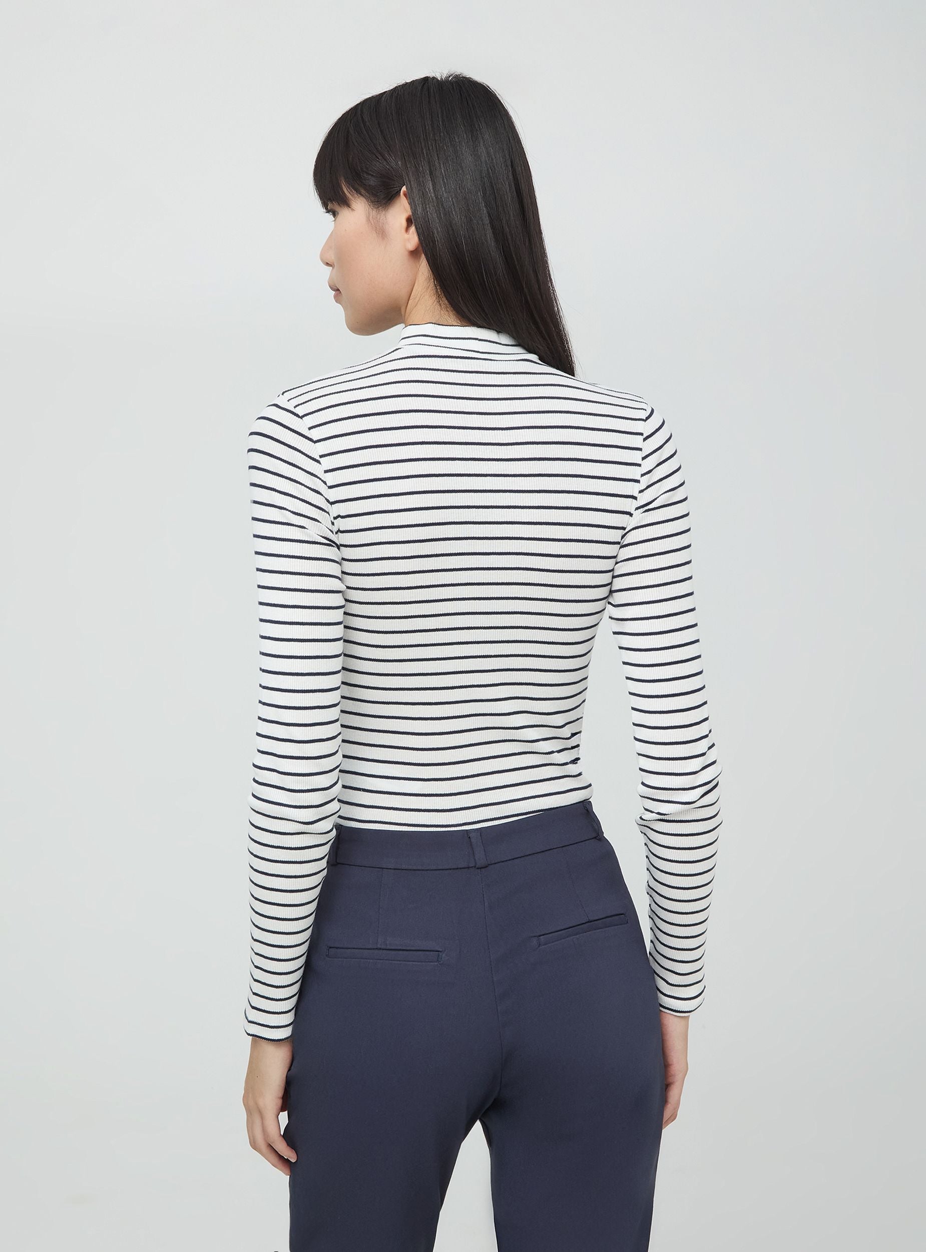 Bluzë me mëngë të gjata për gra në pambuk me motiv me vija, e përsosur për një pamje casual chic. Dizajni ka një jakë të lartë që shton një prekje elegance. Përshtatja është e rehatshme dhe e ngushtë, ideale për t'u veshur vetë ose nën një xhaketë. E përsosur për punë, kohë të lirë ose dalje casual.