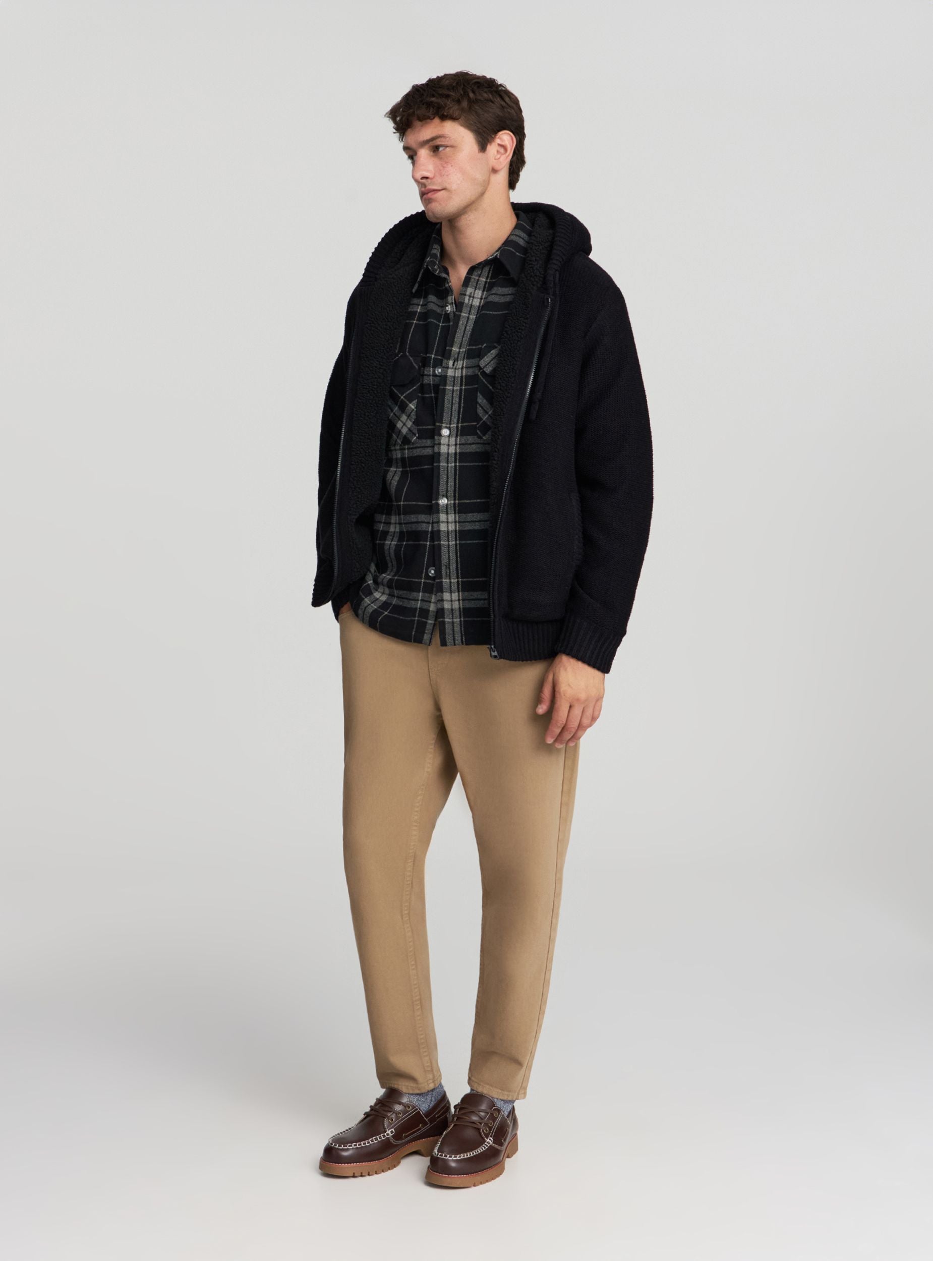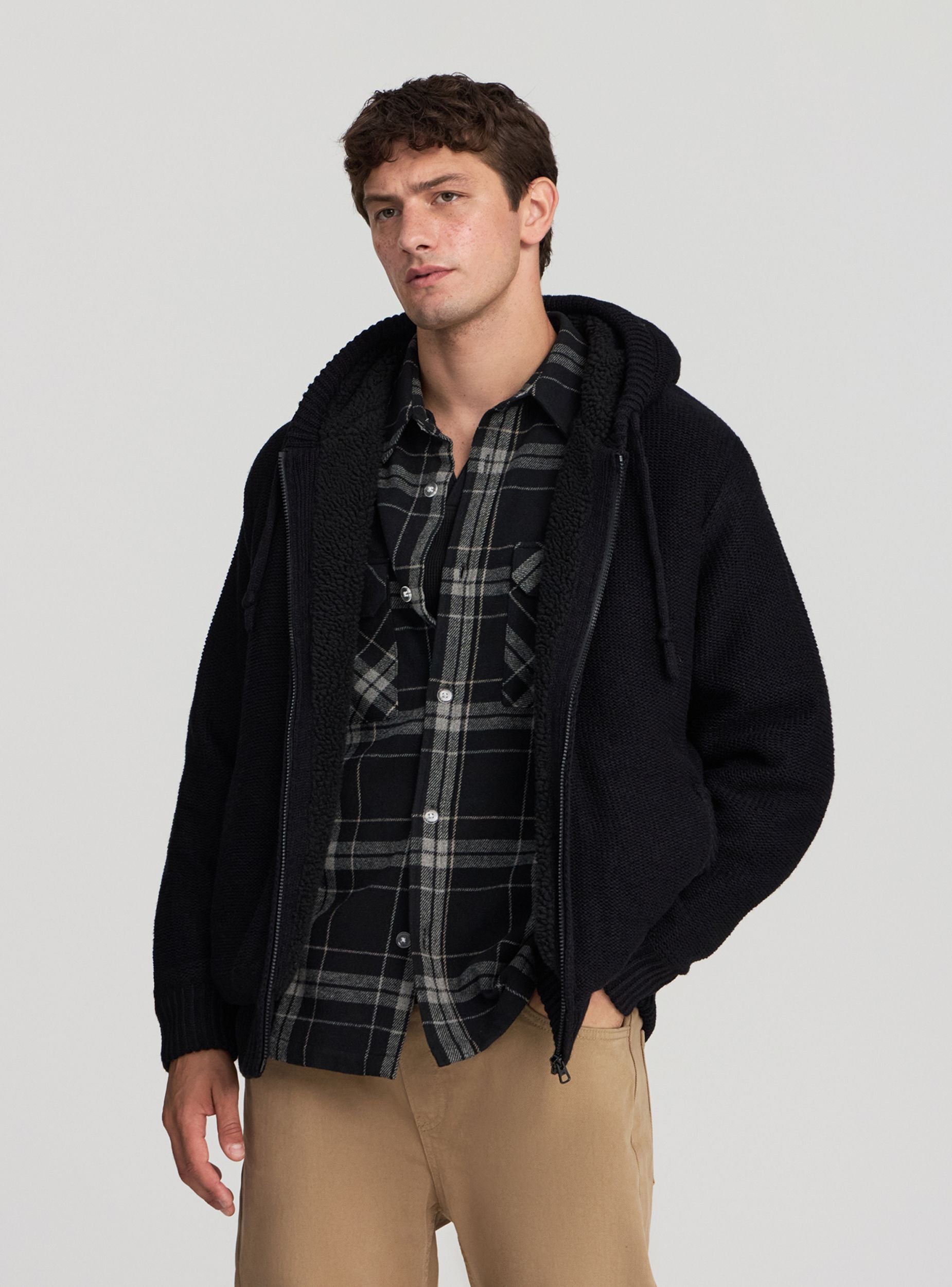 Pulovër e rëndë me mëndafsh për burra me kapuç dhe zip, ideale për një pamje casual dhe komode. E përsosur për ditët më të ftohta, ky pulovër me sherpa brenda trupit dhe kapuçit ofron ngrohtësi dhe komoditet. Përshtatet lehtësisht me xhinse ose pantallona sportive për një veshje të relaksuar. Dizajni me kapuç dhe zip e bën atë praktike dhe të shumëanshme, e përshtatshme për kohën e lirë ose për veshje informale.
