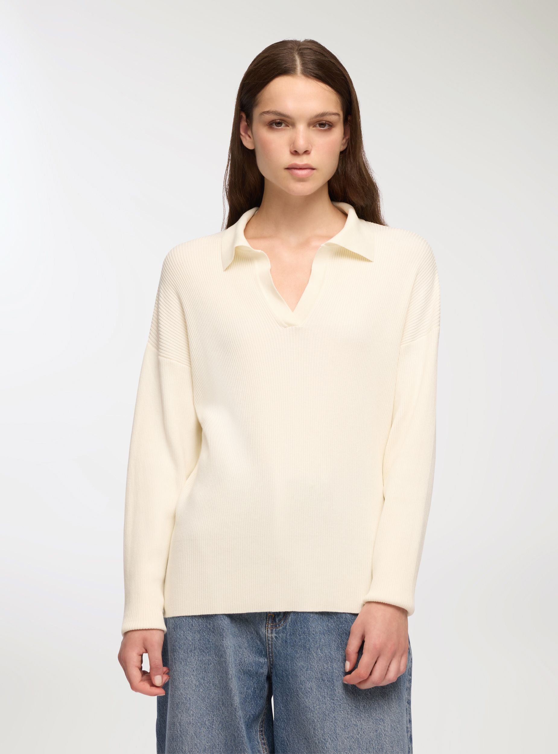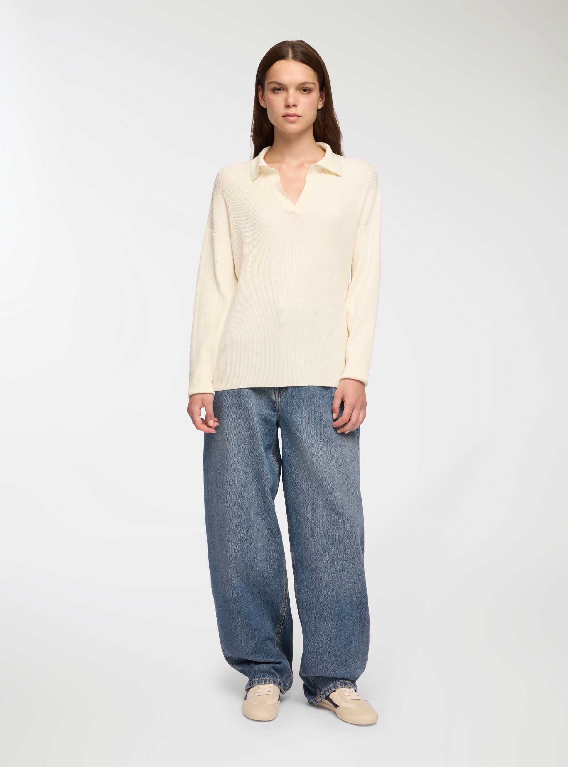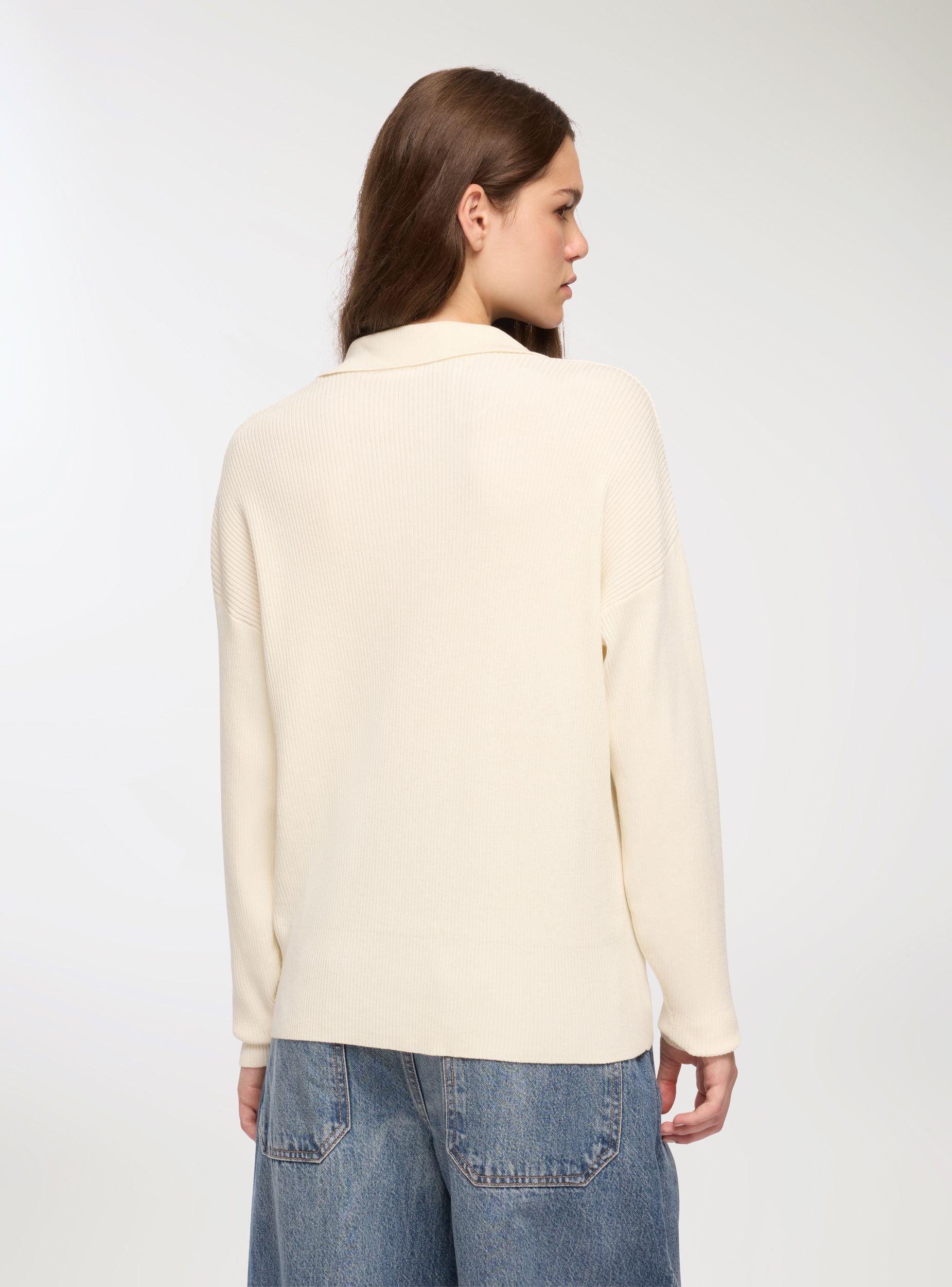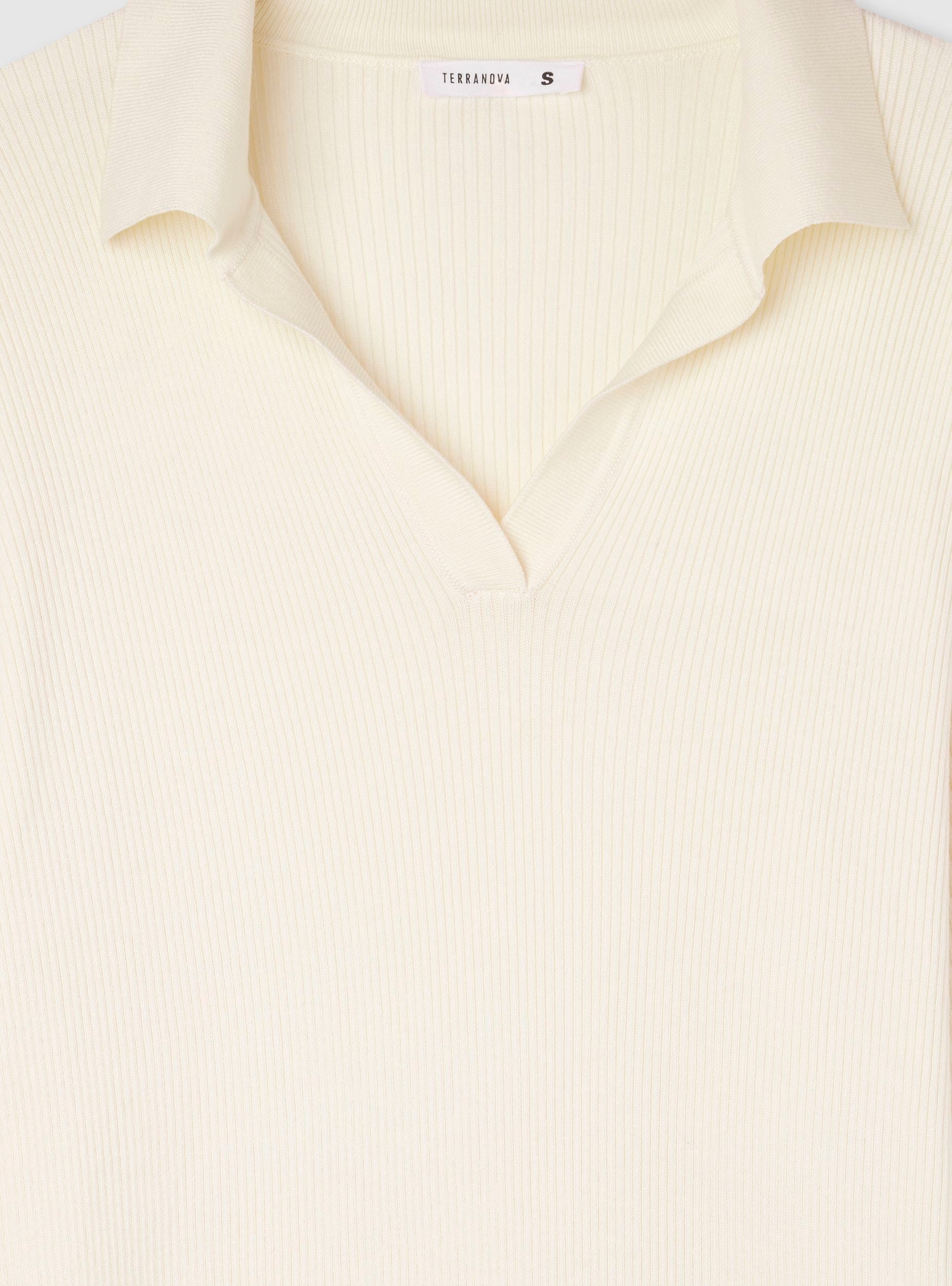 Bluzë femërore me jakë dhe dekolte V, ideale për një pamje të rastësishme dhe shumëpërdorimshme. Përshtatja e butë dhe dizajni i thjeshtë e bëjnë të përshtatshme për kombinime me xhinse ose pantallona elegantë. E përshtatshme për ditë pushimi ose raste joformale, kjo bluzë ofron rehati dhe stil në çdo situatë.Detajet