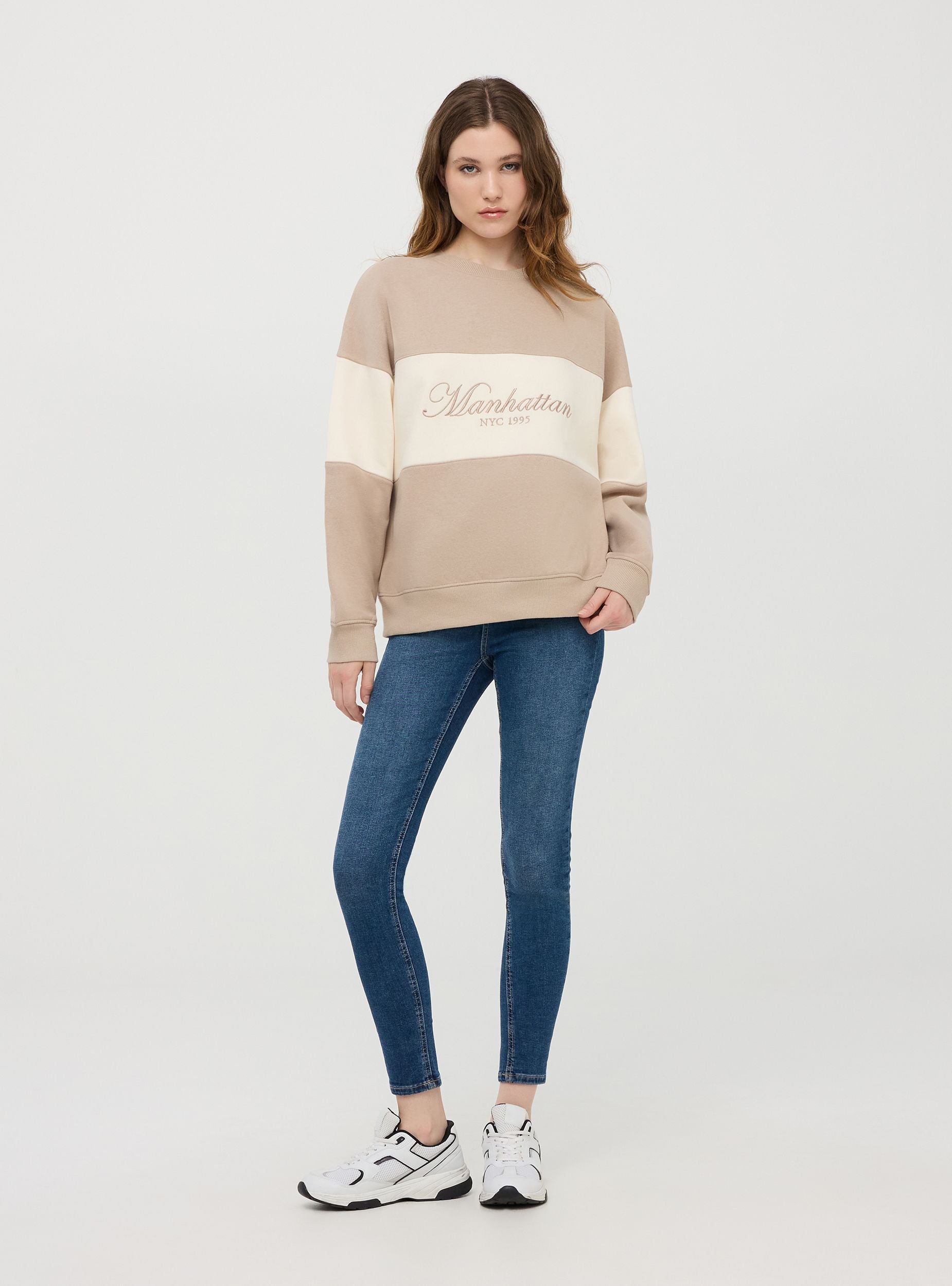 Felpa për gra pa kapuç, në stof të rëndë me ngjyrë të bllokuar dhe shkrim në ballë në stilin kolegjial. Përshtatje normale.