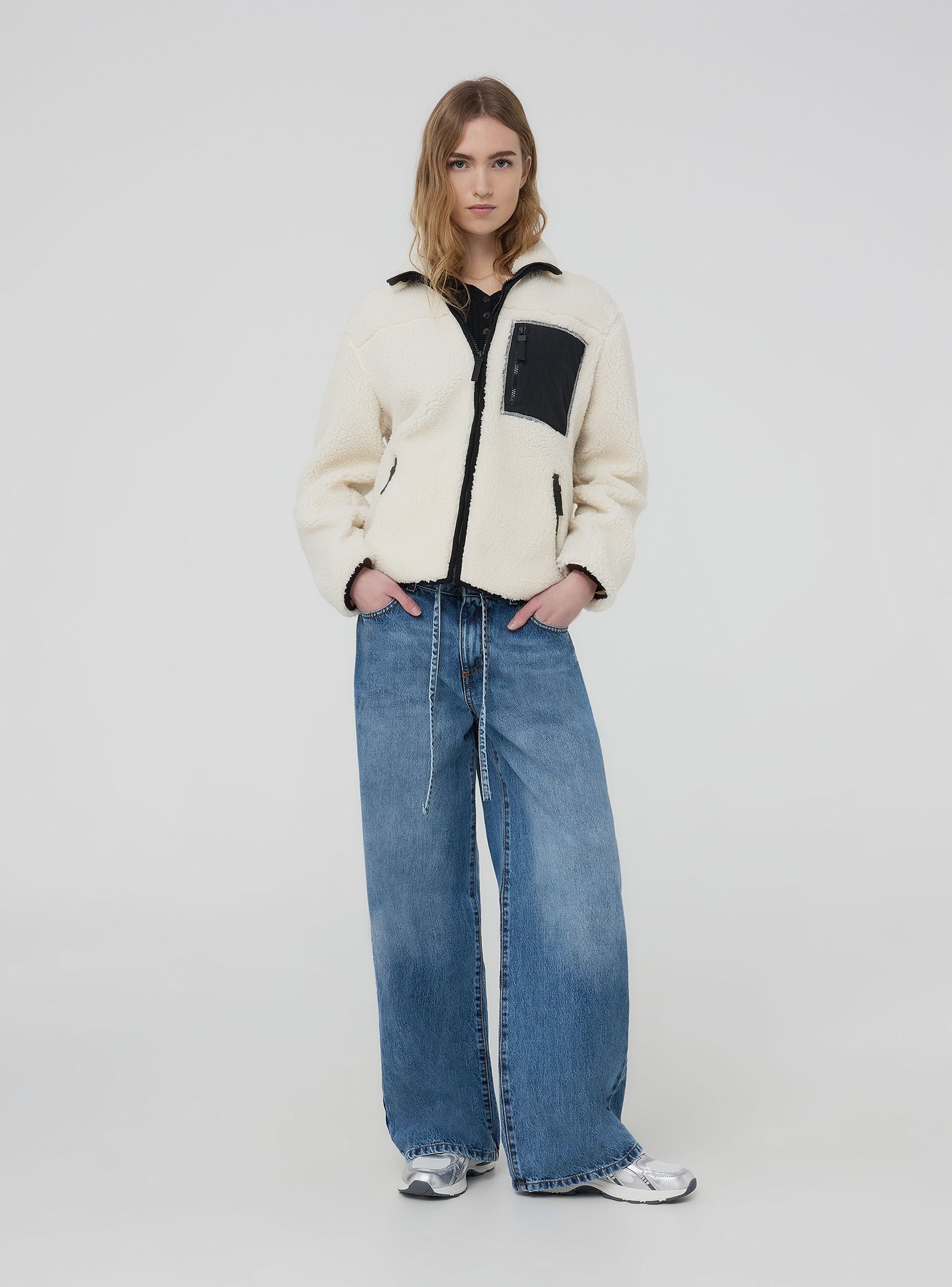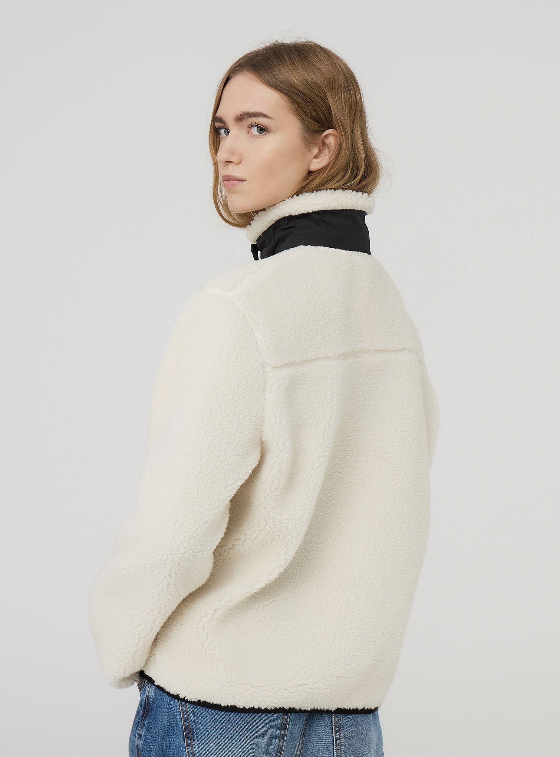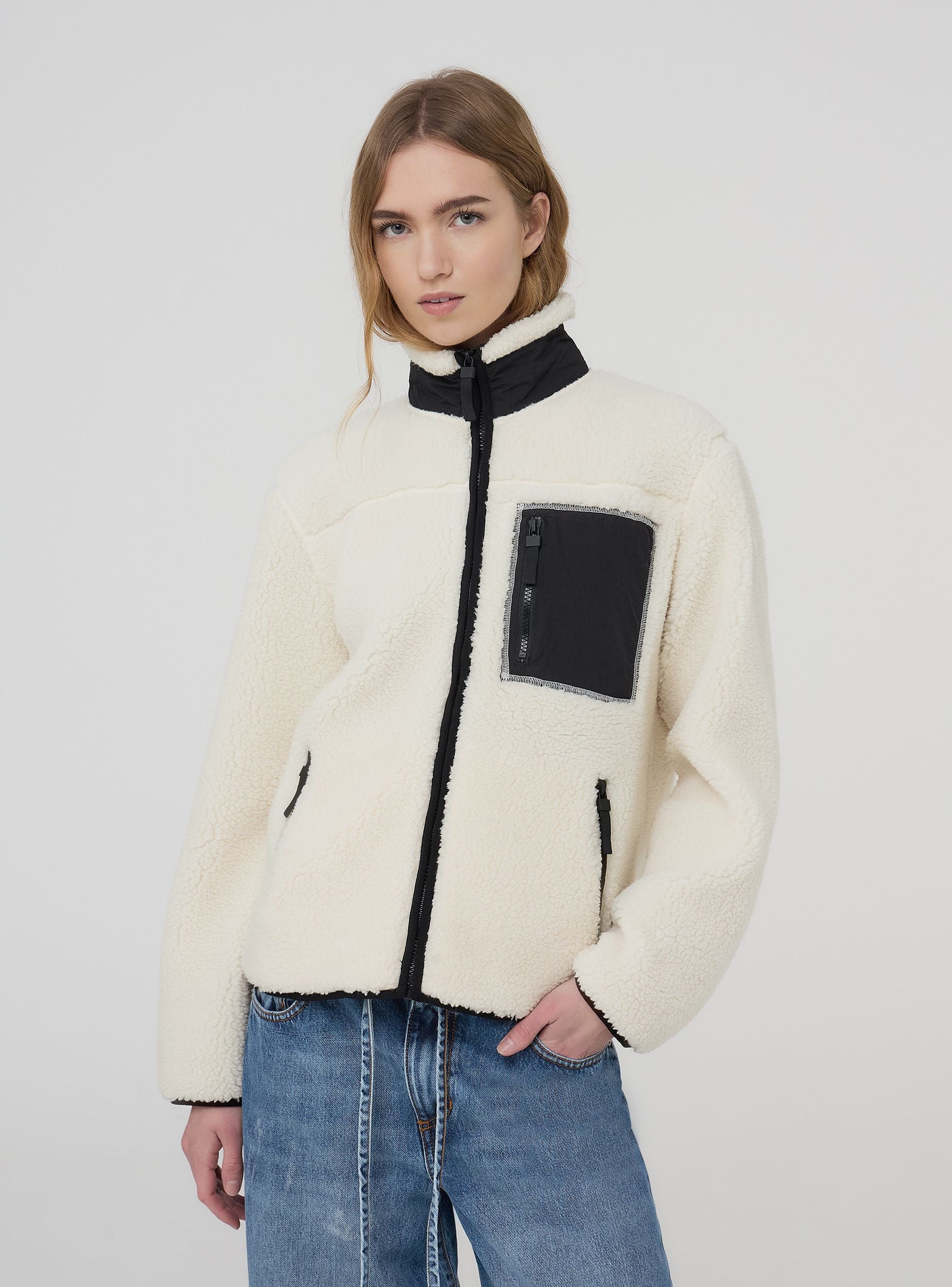 Felpa në sherpa për gra me mbyllje të përparme me zip, ideale për aktivitetet në natyrë gjatë sezonit të dimrit. Kjo veshje ka një dizajn funksional me një jakë të lartë për mbrojtje shtesë nga ftohti. Në pjesën e përparme ka dy xhepa anësorë me zip dhe një xhep në gjoks, gjithashtu me mbyllje me zip, që shton një prekje praktikë dhe stil. Pjesa e prapme e felpës është e thjeshtë, pa detaje dekorative, duke ruajtur një pamje të pastër dhe minimaliste. Pjesët e dorës dhe fundi janë të forcuara për të garantuar një përshtatje të sigurt dhe të rehatshme.Detajet