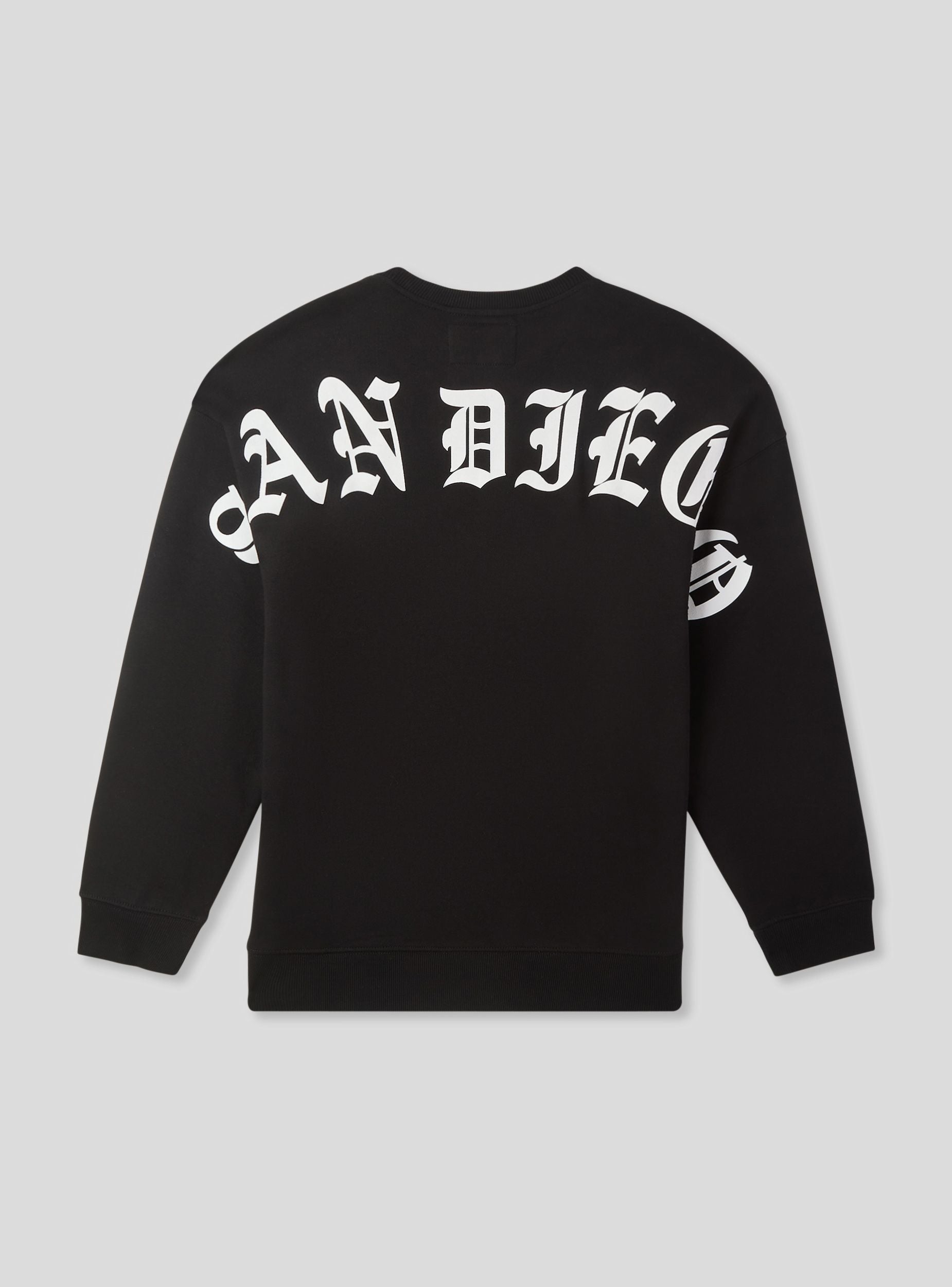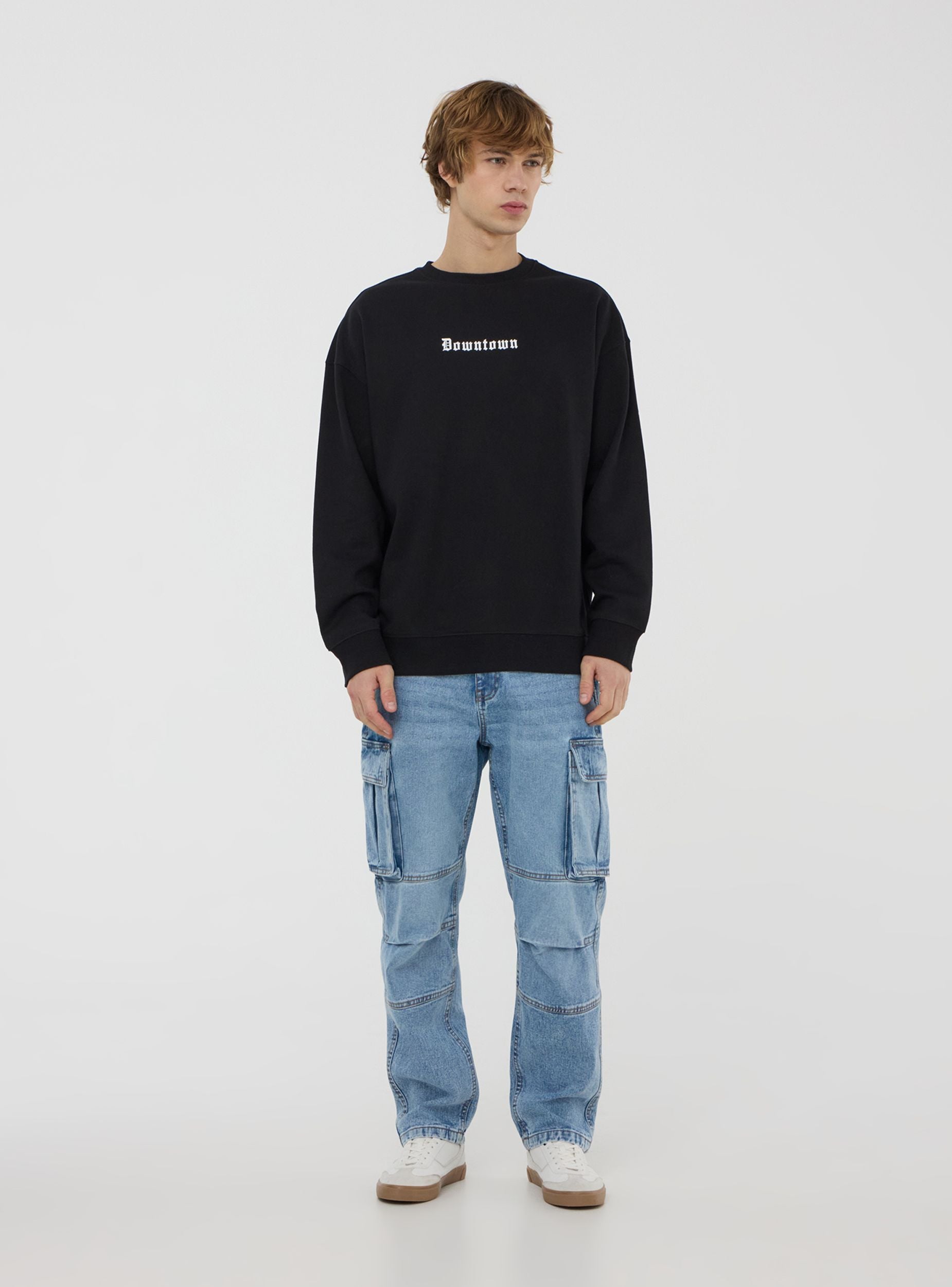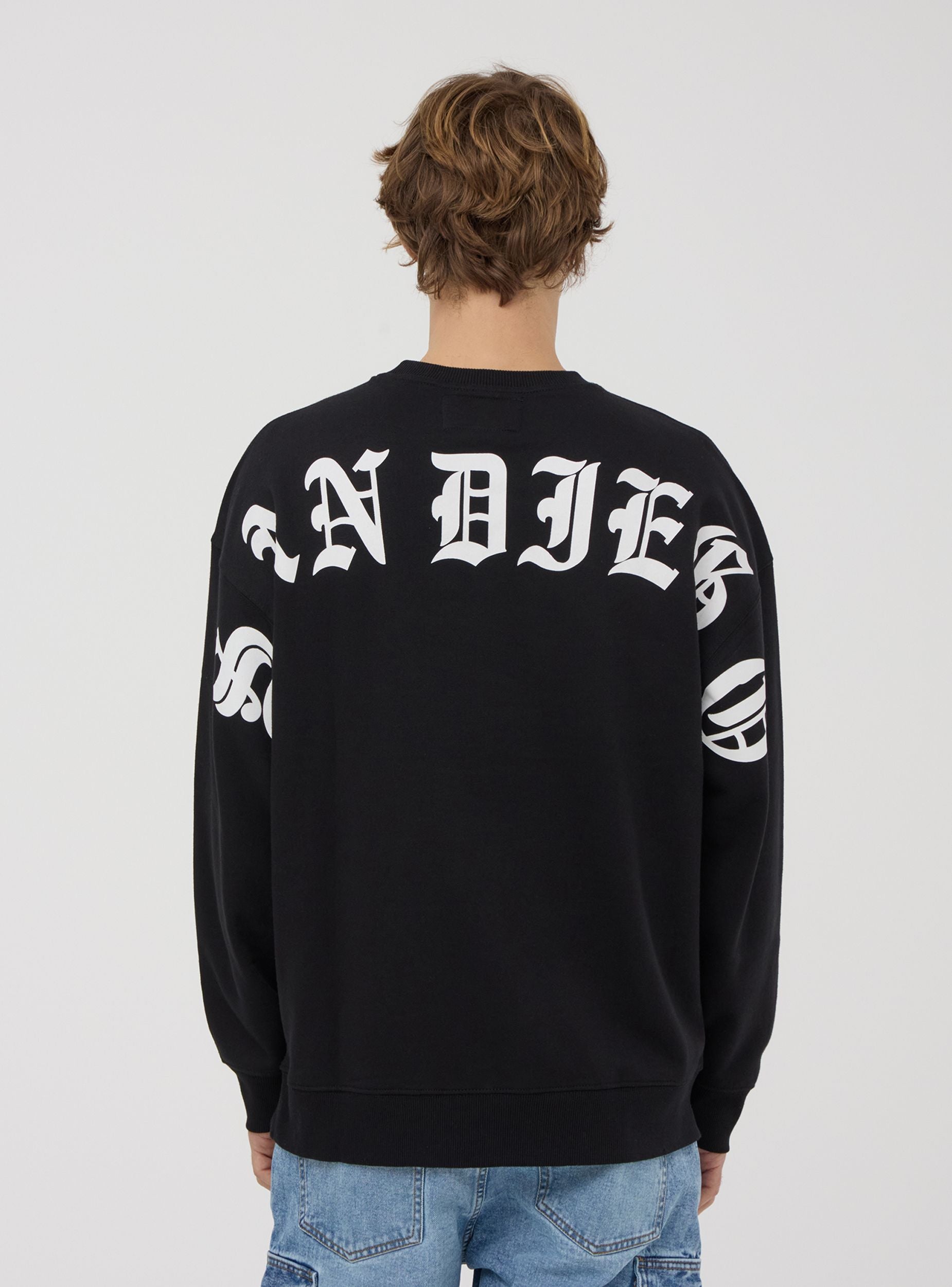 Pulovër oversize i lehtë për burra me mëngë të gjata, pa kapuç dhe model të mbyllur pa zinxhir, i karakterizuar nga printime me shkronja në stilin gotik në pjesën e përparme dhe një printim të gjerë në pjesën e prapme. I përsosur për një pamje urbane të rafinuar, kombinon lehtësisht me xhinse dhe këpucë sportive për kohën e lirë ose veshje casual. Ideale për t'u dalluar në raste informale me një prekje personaliteti.