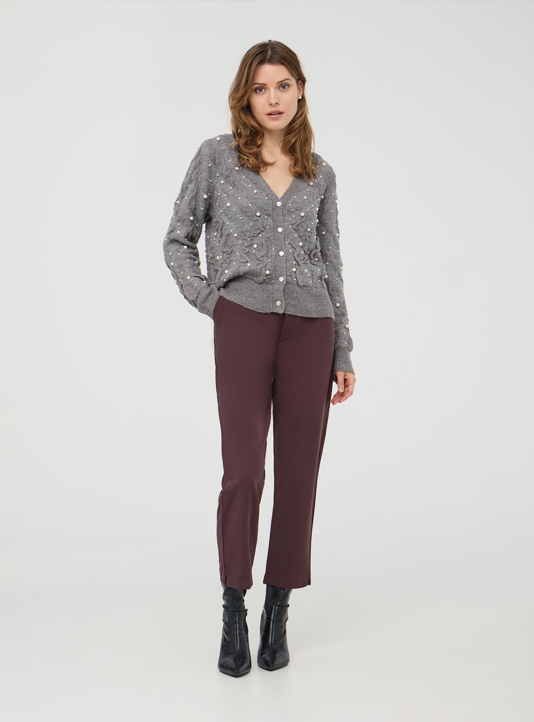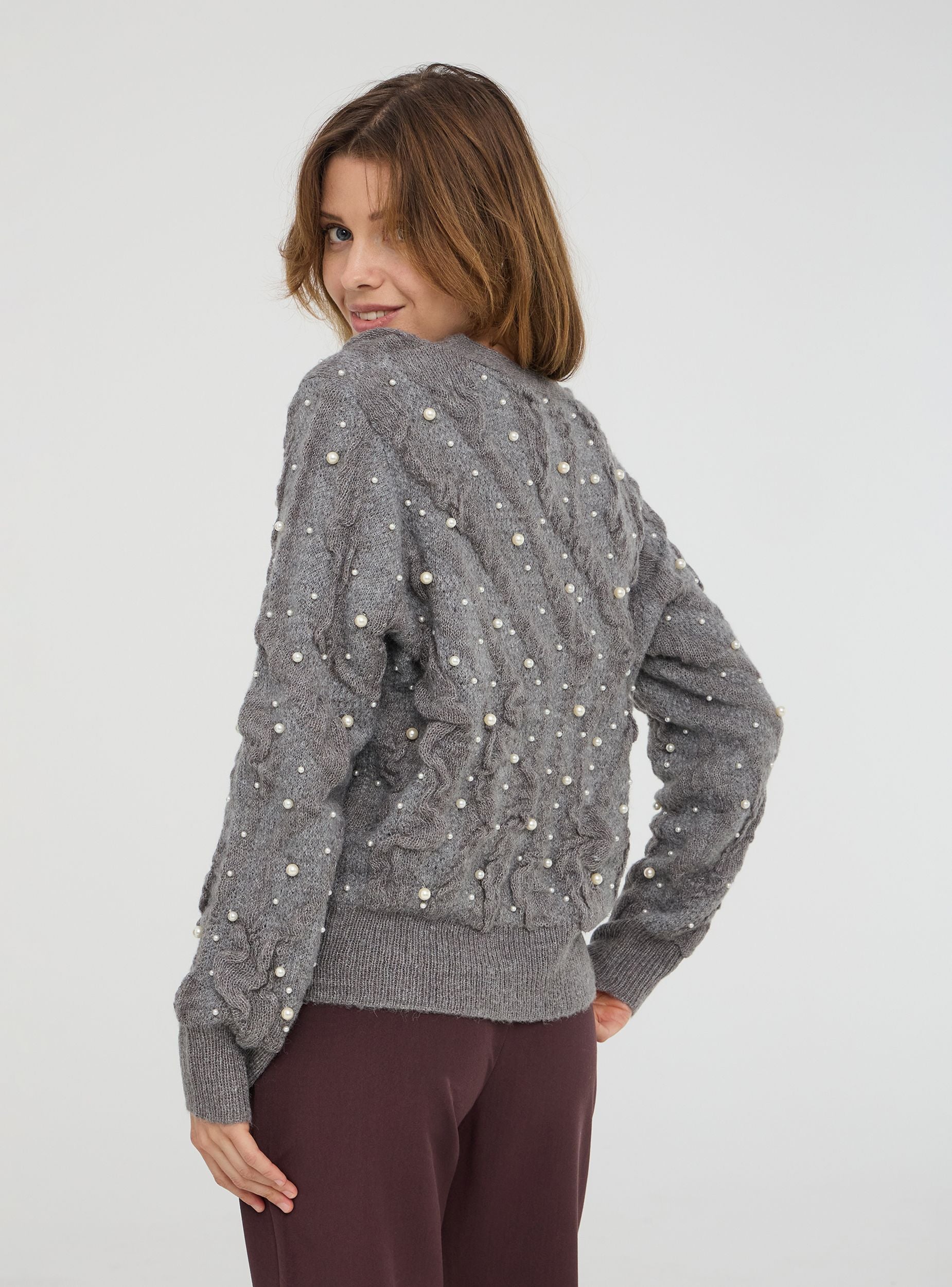 Cardigan për gra me dekolte në formë V, me mëngë të gjata dhe detaje perlash të aplikuara, i përshtatshëm për një pamje të rafinuar dhe femërore. Mbyllja me düshka e bën atë të shumëanshëm, ideal për zyrën me pantallona elegante dhe këpucë me takë ose për kohën e lirë me xhinse dhe sneakers. Dizajni i rafinuar shton një prekje sofistikuese, i përshtatshëm për të theksuar çdo veshje me elegancë.Detajet