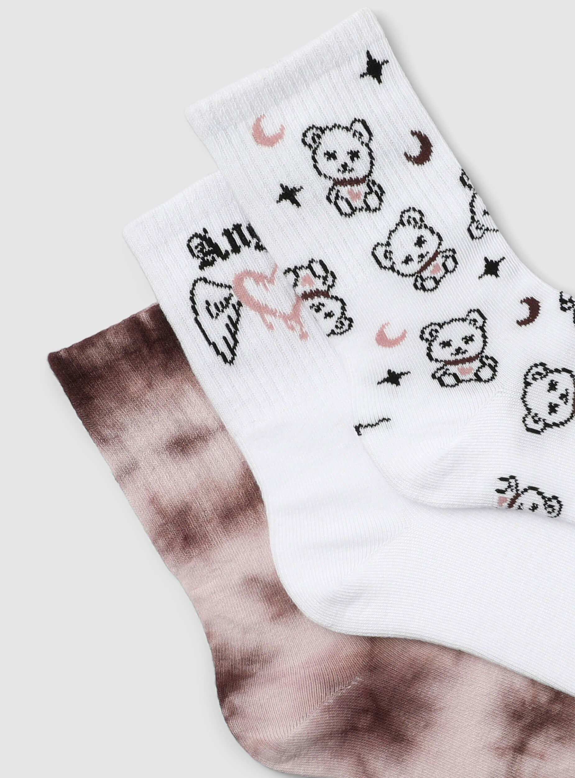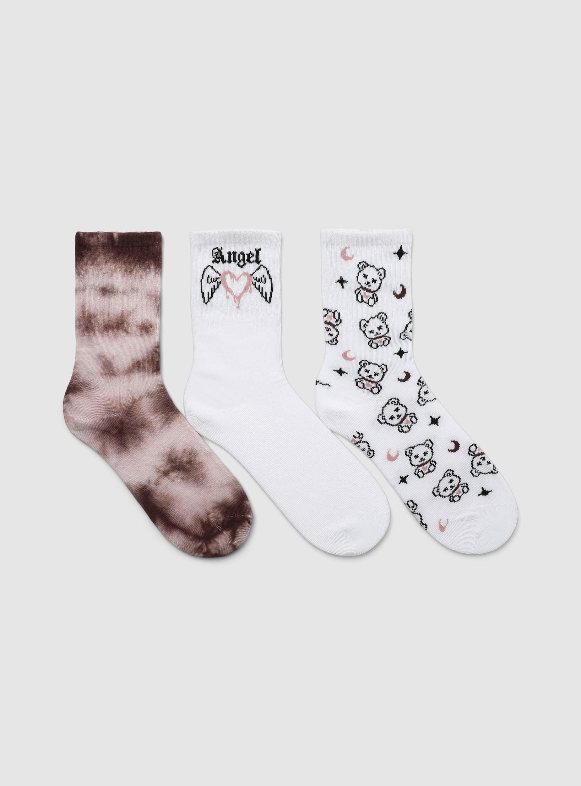 Çorape për gra perfekte për të shtuar një prekje origjinale në pamjet tuaja të përditshme. Paketa përmban tre palë me fantazi të ndryshme: një me shkrim dhe zemër me krahë, një me arushë dhe simbole, dhe një me efekt tie-dye. Ideale për t'u veshur me sneakers ose këpucë të ulëta, ofrojnë komoditet dhe përshtatje të rregullt, duke u përshtatur me raste të ndryshme informale dhe veshje krijuese.