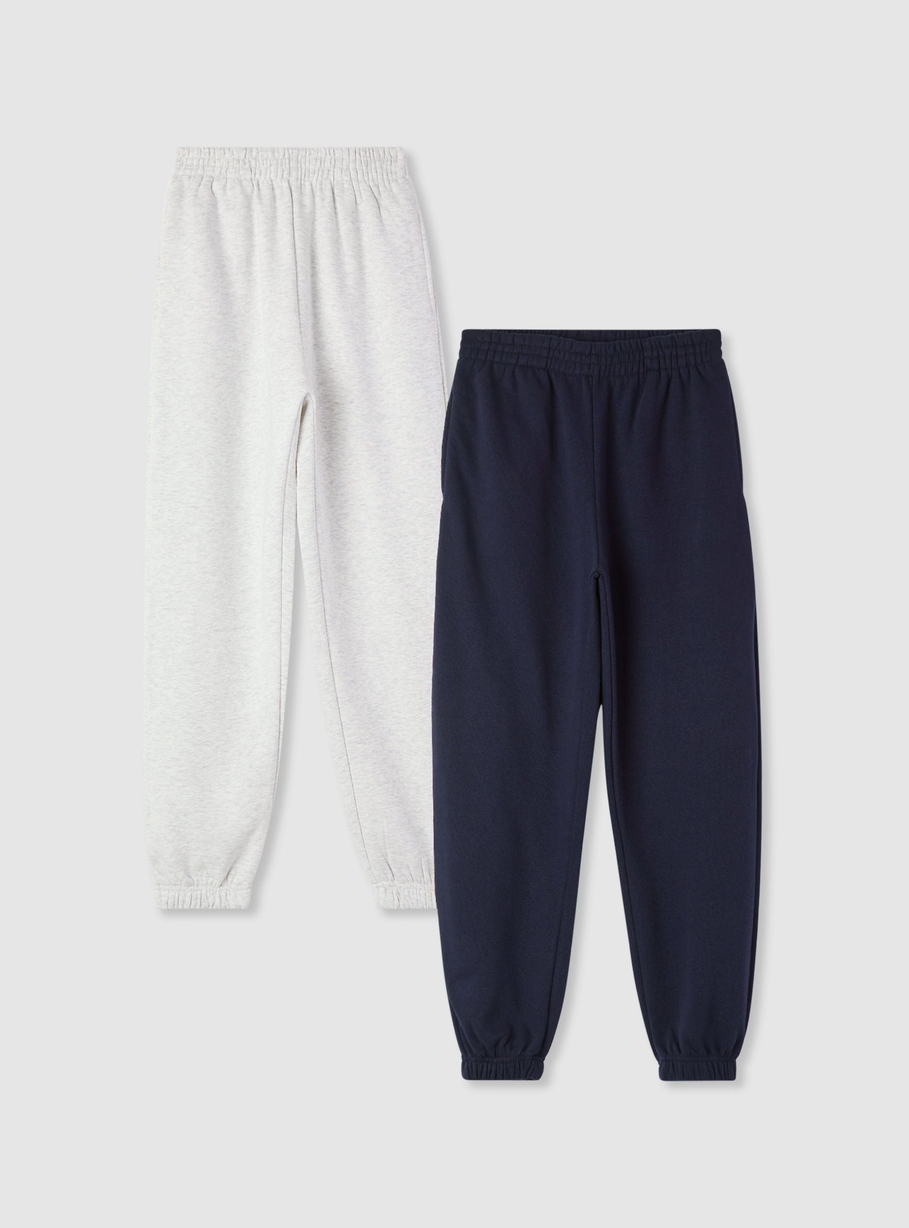 Paketë përbërë nga 2 palë pantallona sportive për gra me ngjyrë të njëtrajtshme. Model i gjatë me bel të lartë dhe elastik në bel për rehati ditore. Fund me manshetë elastike që përcjell këmbën dhe thekson siluetën. Xhepa anësorë të futur për sende të vogla. Të përshtatshme për kohën e lirë, relaks në shtëpi ose aktivitete të lehta; kombinohen me triko me kapuç ose pa, ose me një bluzë dhe atlete.