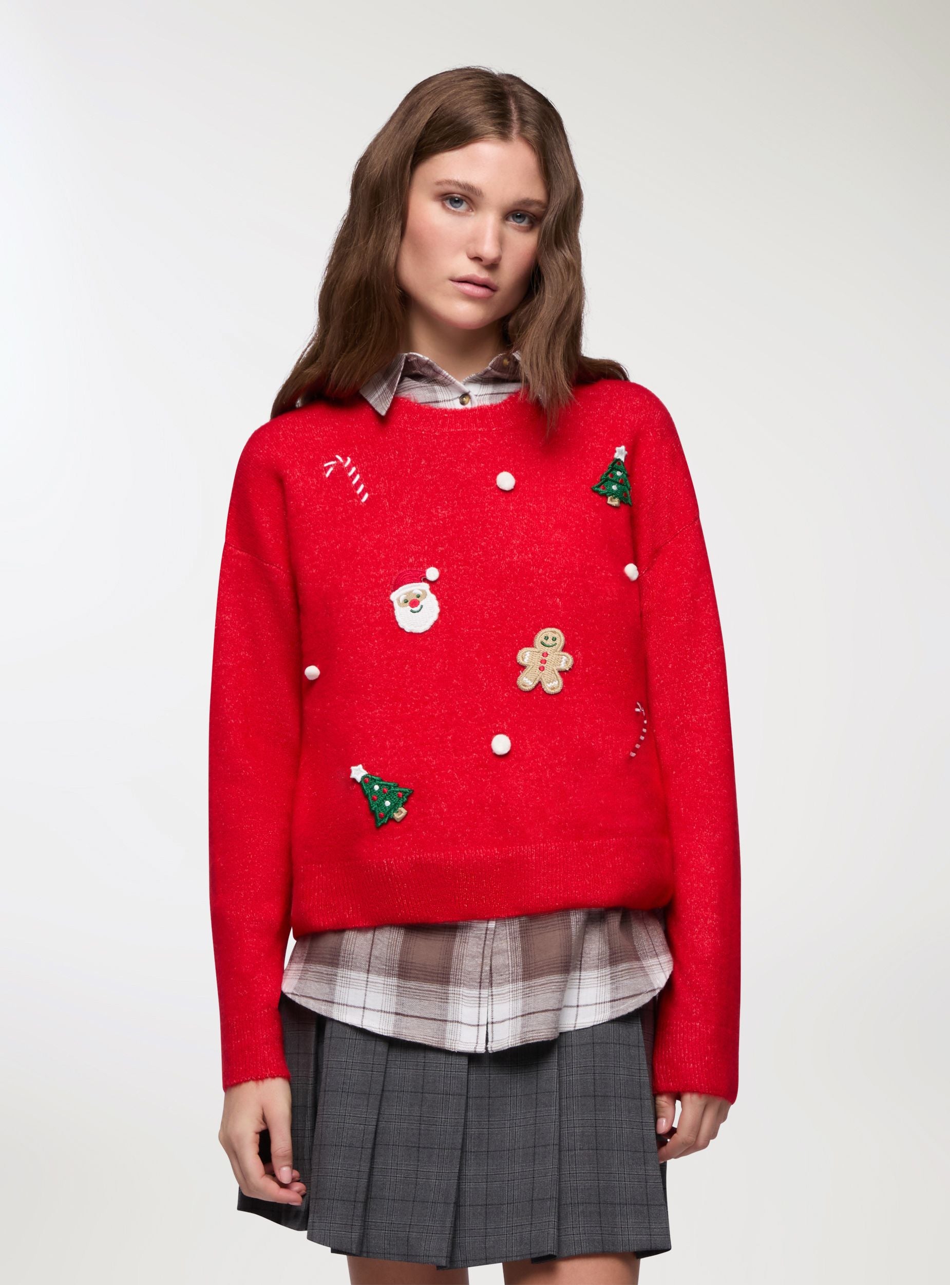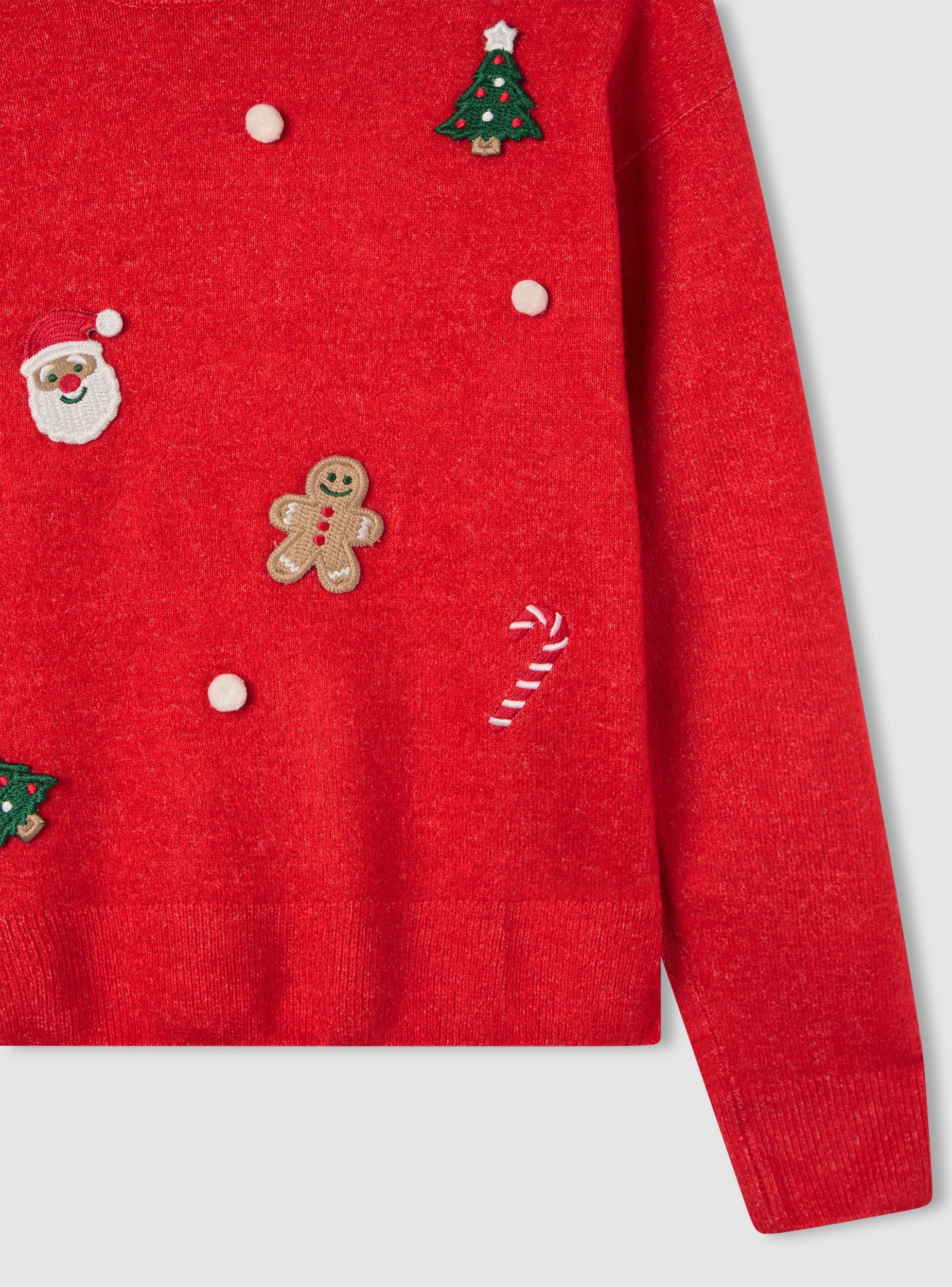 Pulovër për gra me mëngë të gjata për Krishtlindje me qafë të rrumbullakët dhe aplikacione dekorative në pjesën e përparme. Dizajni i gëzuar dhe i ngjyrosur përfshin patch-e të qëndisura dhe pom pome me figura festive si pemë, shkopinj sheqeri dhe biskota zenzero. Perfekt për të krijuar një pamje argëtuese dhe tërheqëse gjatë periudhës së festave. Përshtatje e rregullt. Vishni me xhinse ose leggins për një veshje të rehatshme dhe origjinale me temë.Detajet