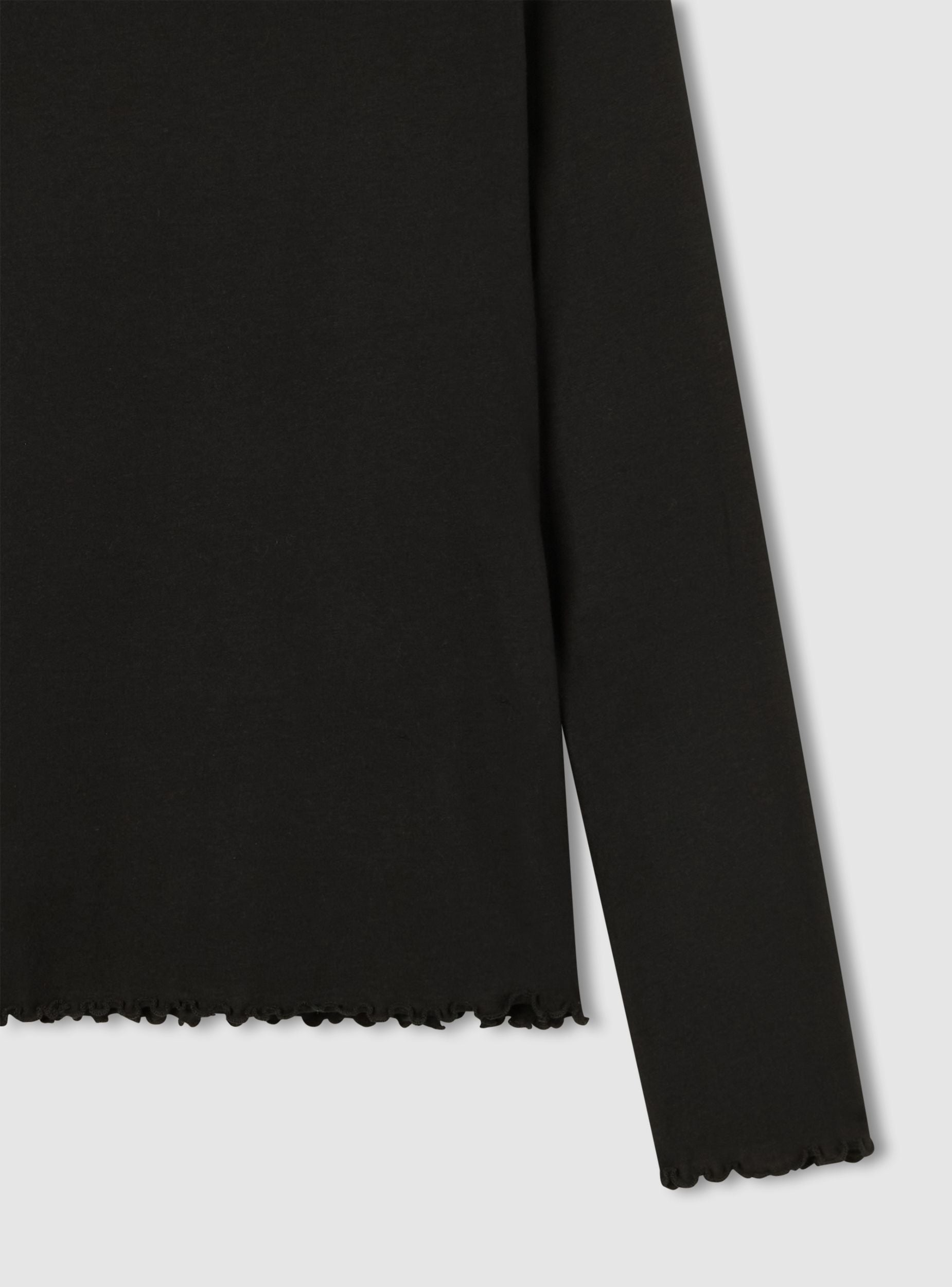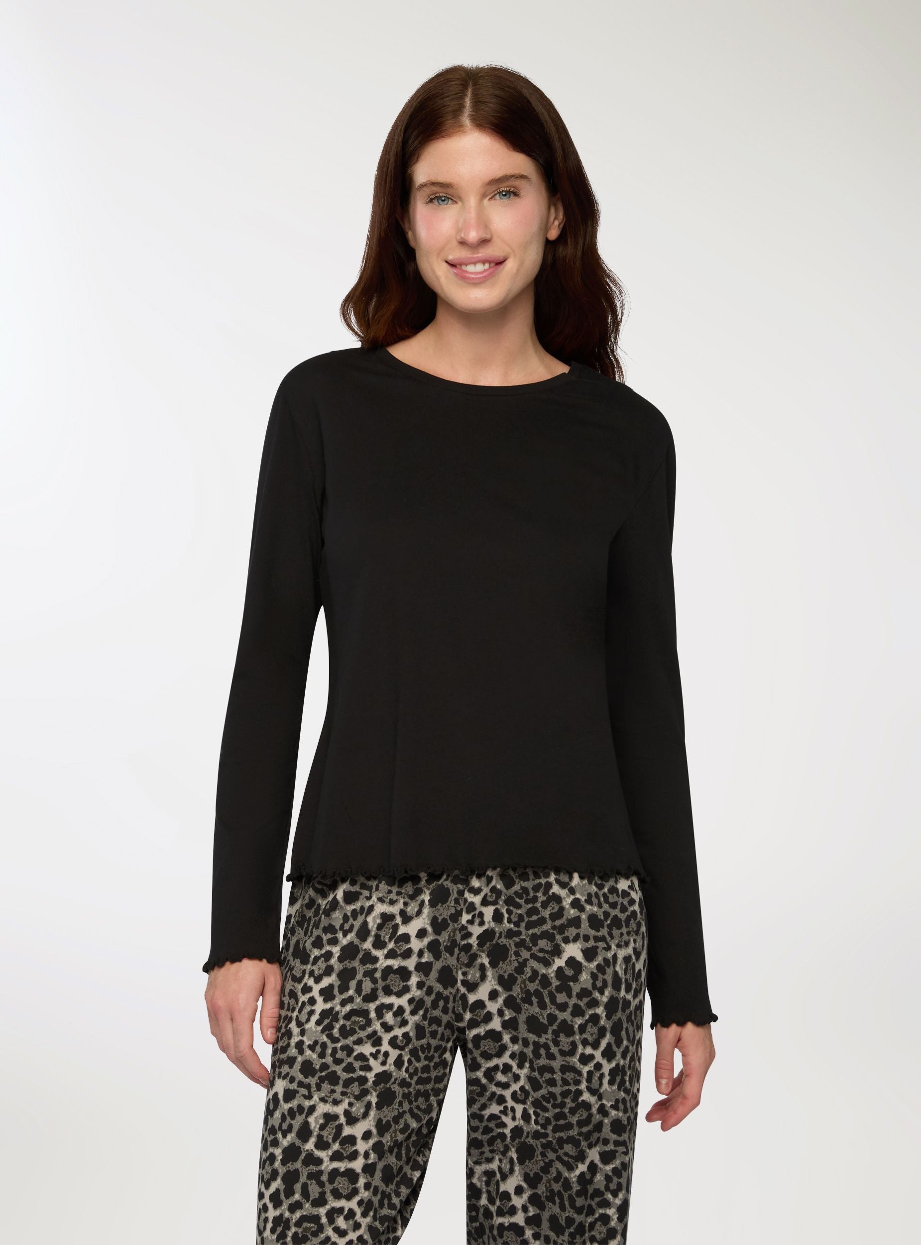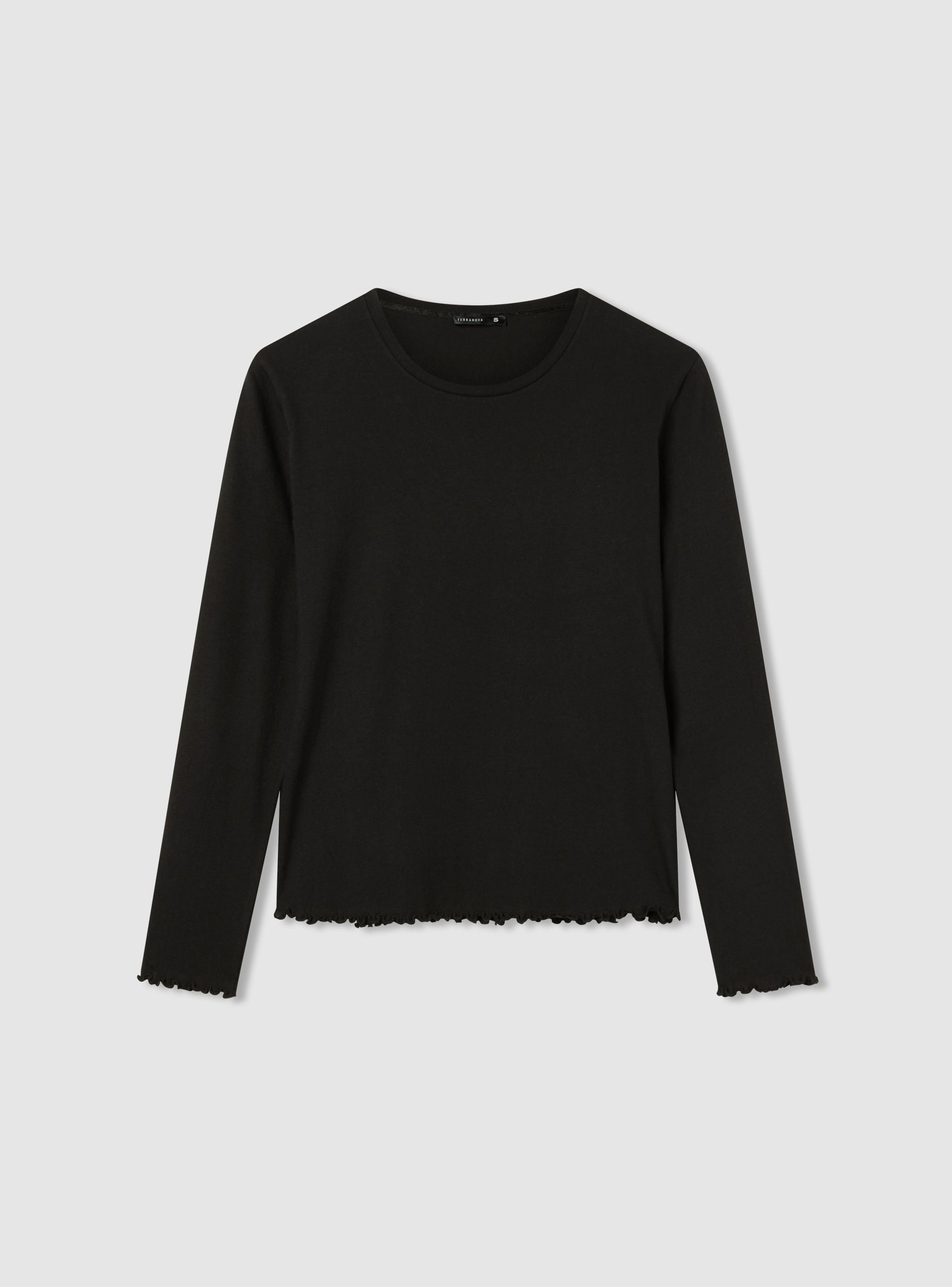 Bluze me mëngë të gjata për gra, ideale për një stil casual dhe shumëpërdorimshëm. Ka një dizajn me ngjyrë të vetme dhe skaje valëzuese që i japin një prekje origjinaliteti. E përsosur për t'u kombinuar me xhinse ose pantallona për një veshje moderne dhe të rehatshme. Përshtatja e rregullt dhe qafa e rrumbullakët e bëjnë të përshtatshme për shumë raste, nga koha e lirë deri te dalje informale.