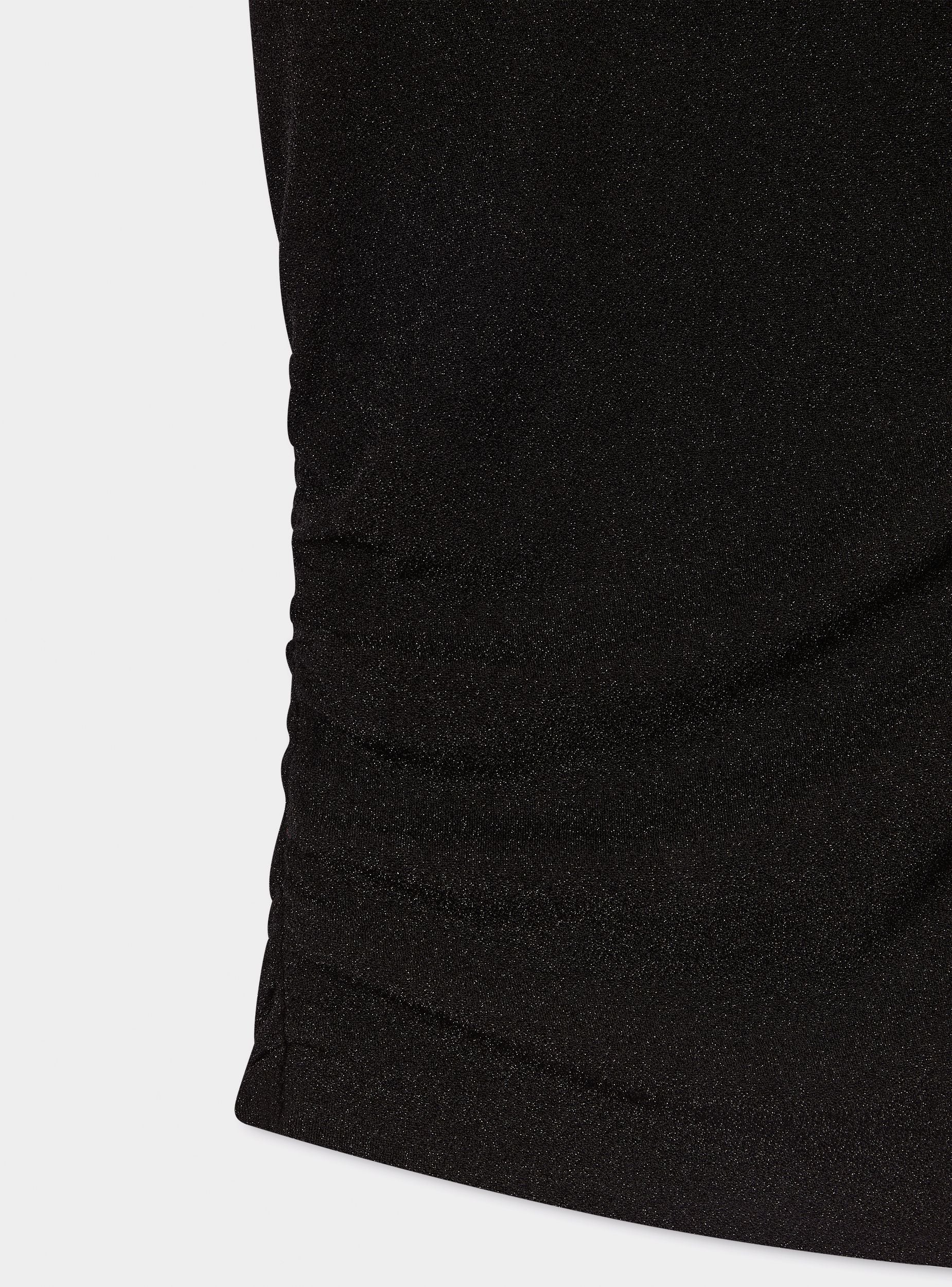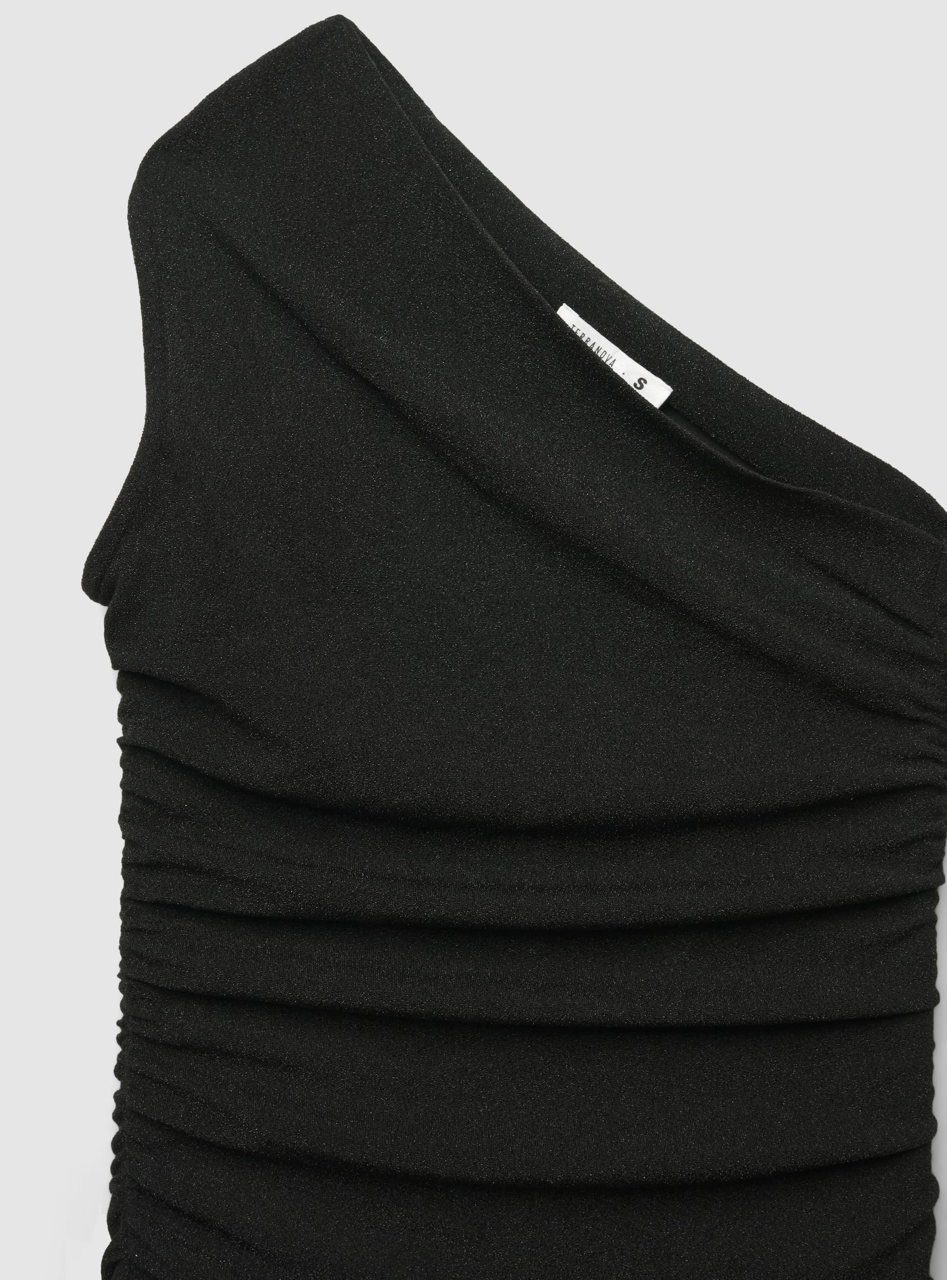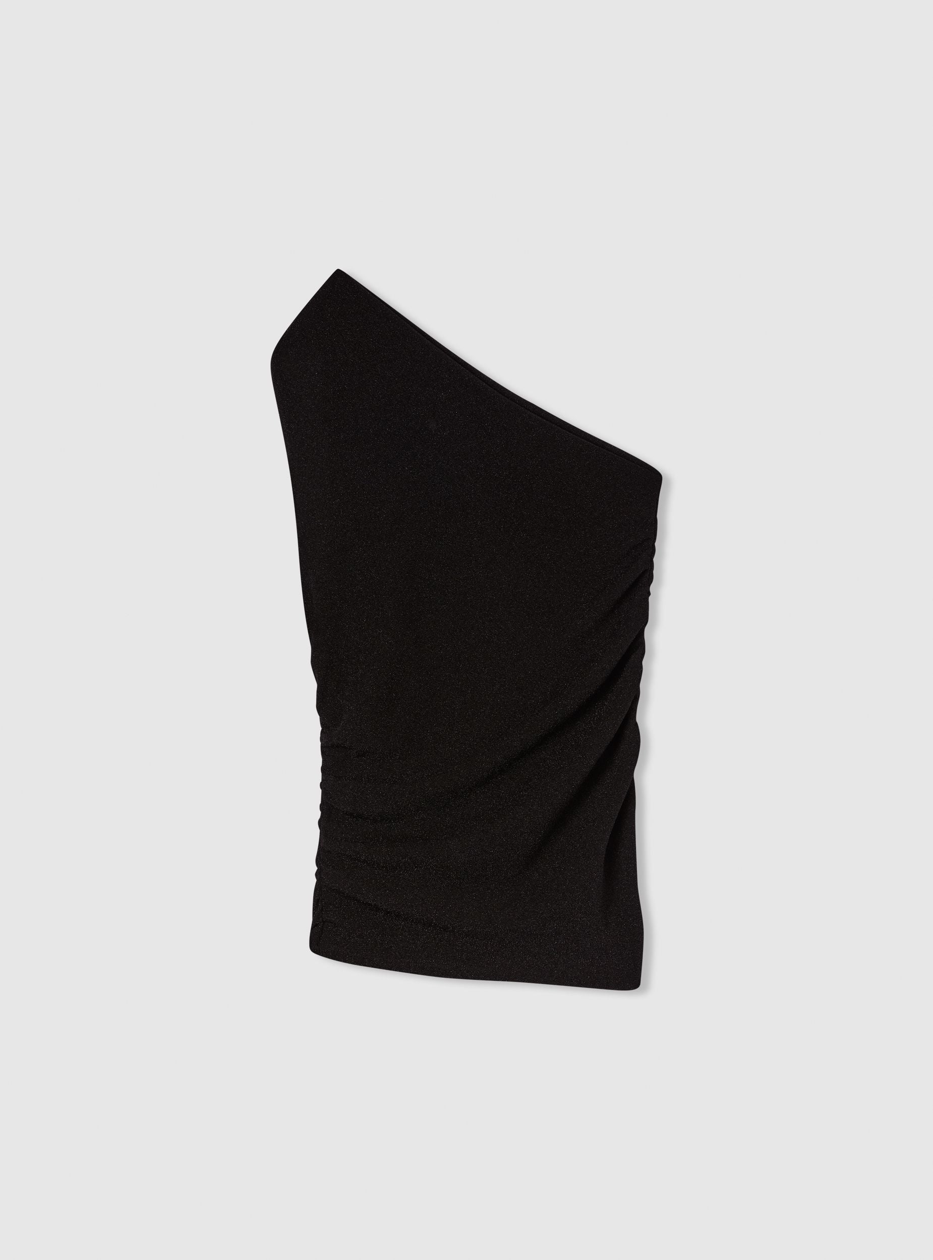 Top femëror me një shpatull, me përshtatje të ngushtë dhe grumbullime anësore që theksojnë figurën. Dizajn asimetrik ideal për mbrëmje dhe dalje elegante, i lehtë për t’u kombinuar me pantallona me bel të lartë ose funde tubino. Ngjyrë e vetme me efekt shkëlqyes.