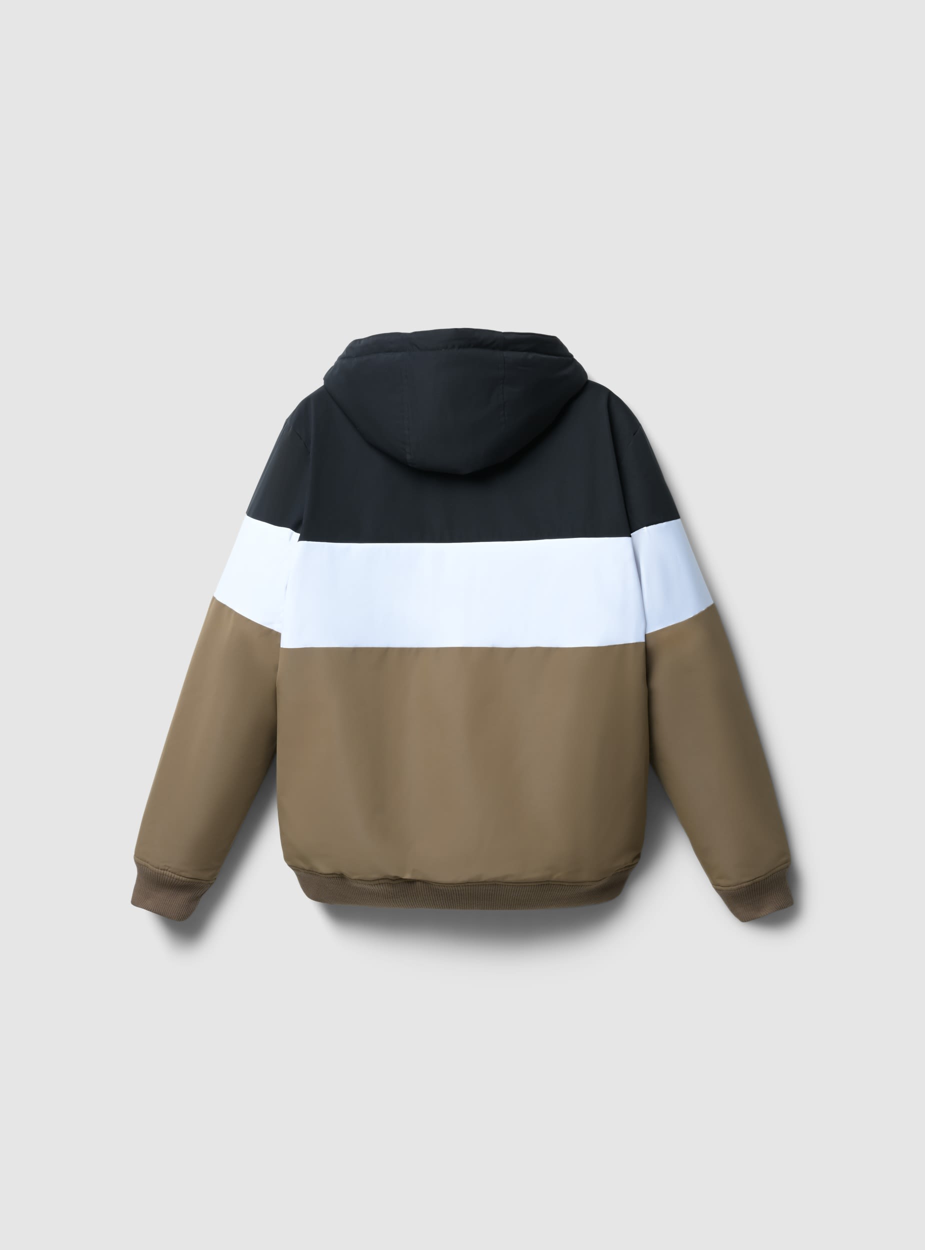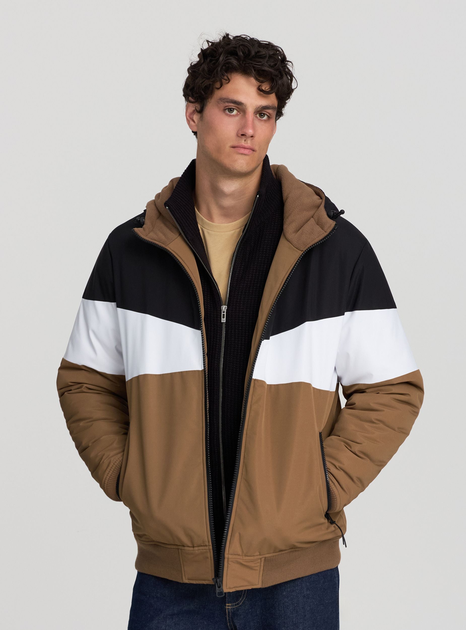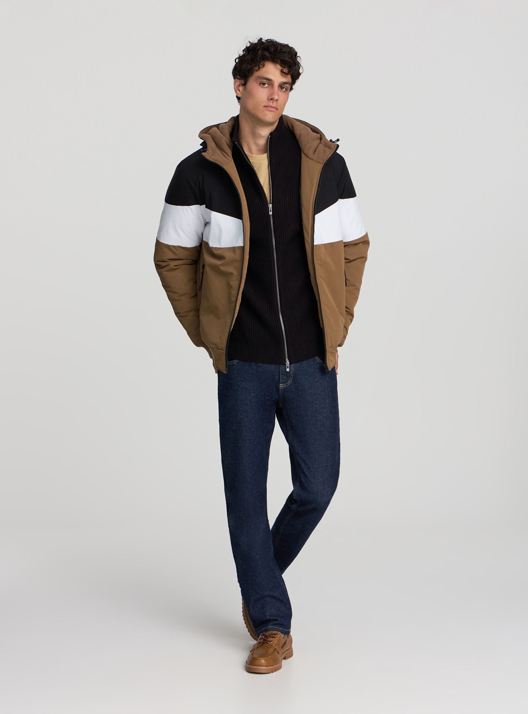 Xhaketë e mbushur për burrat, ideale për një pamje casual dhe moderne. E pajisur me kapuç të rregullueshëm dhe mbyllje me zinxhir, ofron një përshtatje të rehatshme dhe praktike. Ka një dizajn me blloqe ngjyrash që i jep një prekje stili unike. Xhepat anësorë me zinxhir sigurojnë funksionalitet dhe siguri për sendet personale. E përshtatshme për ditët e freskëta, kombinohet lehtësisht me xhinse dhe atlete për një look të ndryshueshëm dhe modern.