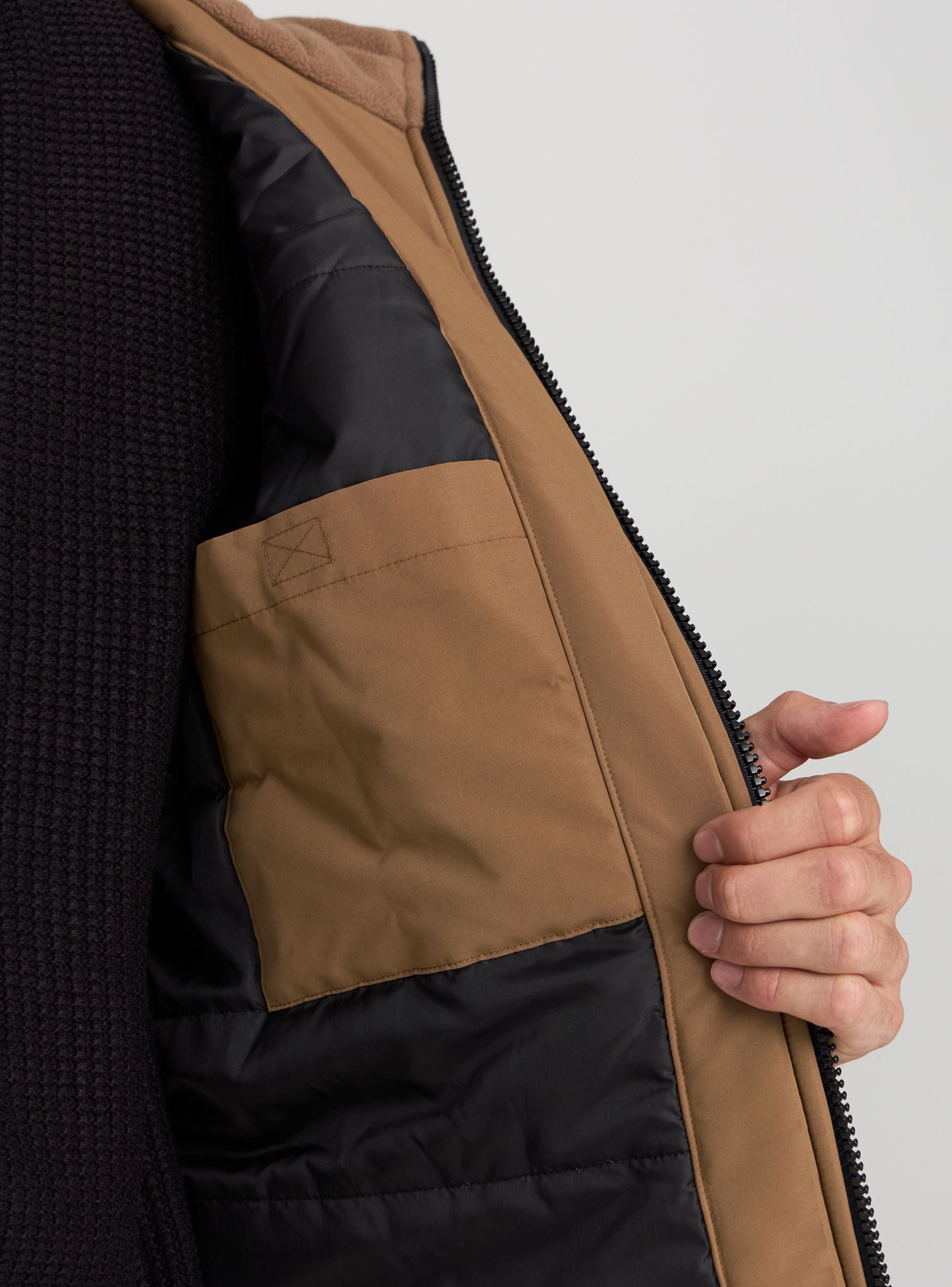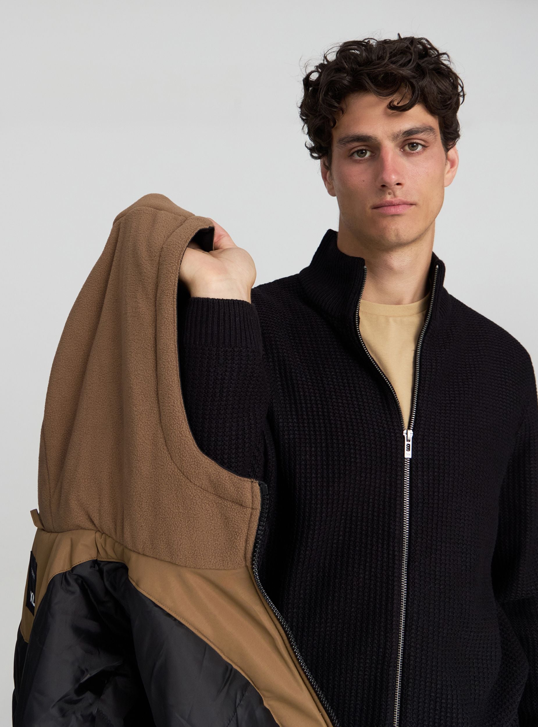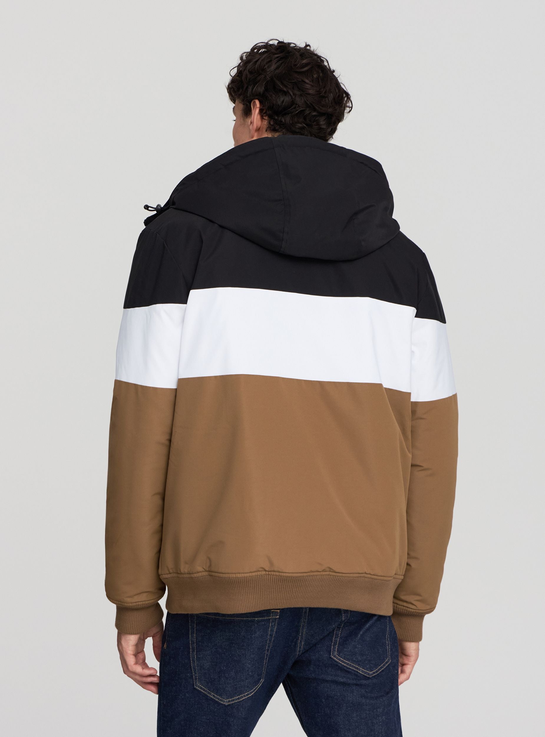 Xhaketë e mbushur për burrat, ideale për një pamje casual dhe moderne. E pajisur me kapuç të rregullueshëm dhe mbyllje me zinxhir, ofron një përshtatje të rehatshme dhe praktike. Ka një dizajn me blloqe ngjyrash që i jep një prekje stili unike. Xhepat anësorë me zinxhir sigurojnë funksionalitet dhe siguri për sendet personale. E përshtatshme për ditët e freskëta, kombinohet lehtësisht me xhinse dhe atlete për një look të ndryshueshëm dhe modern.