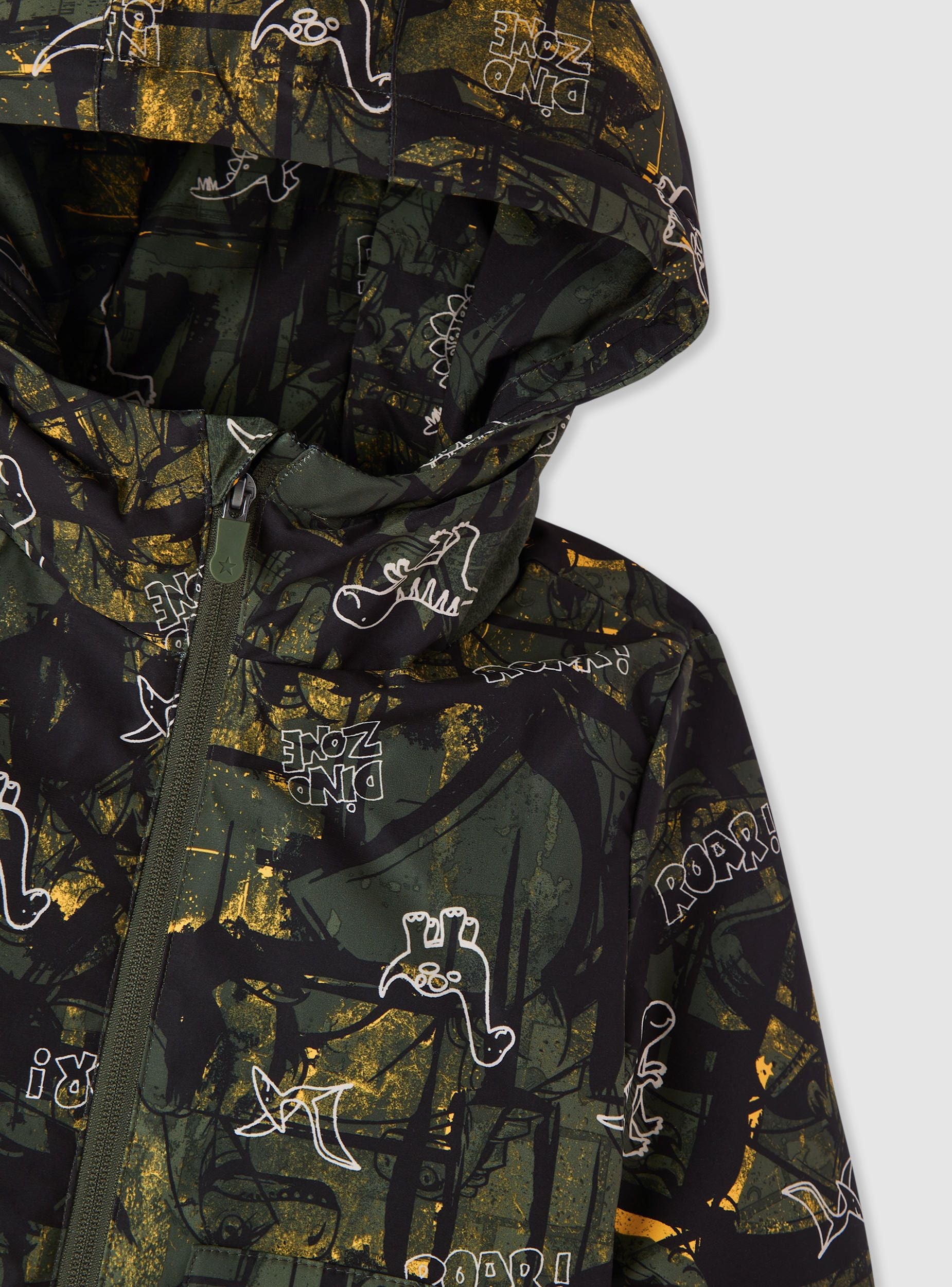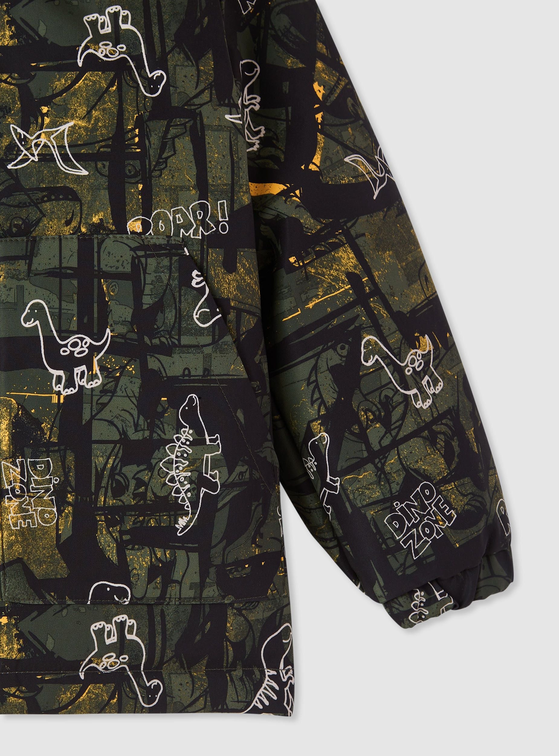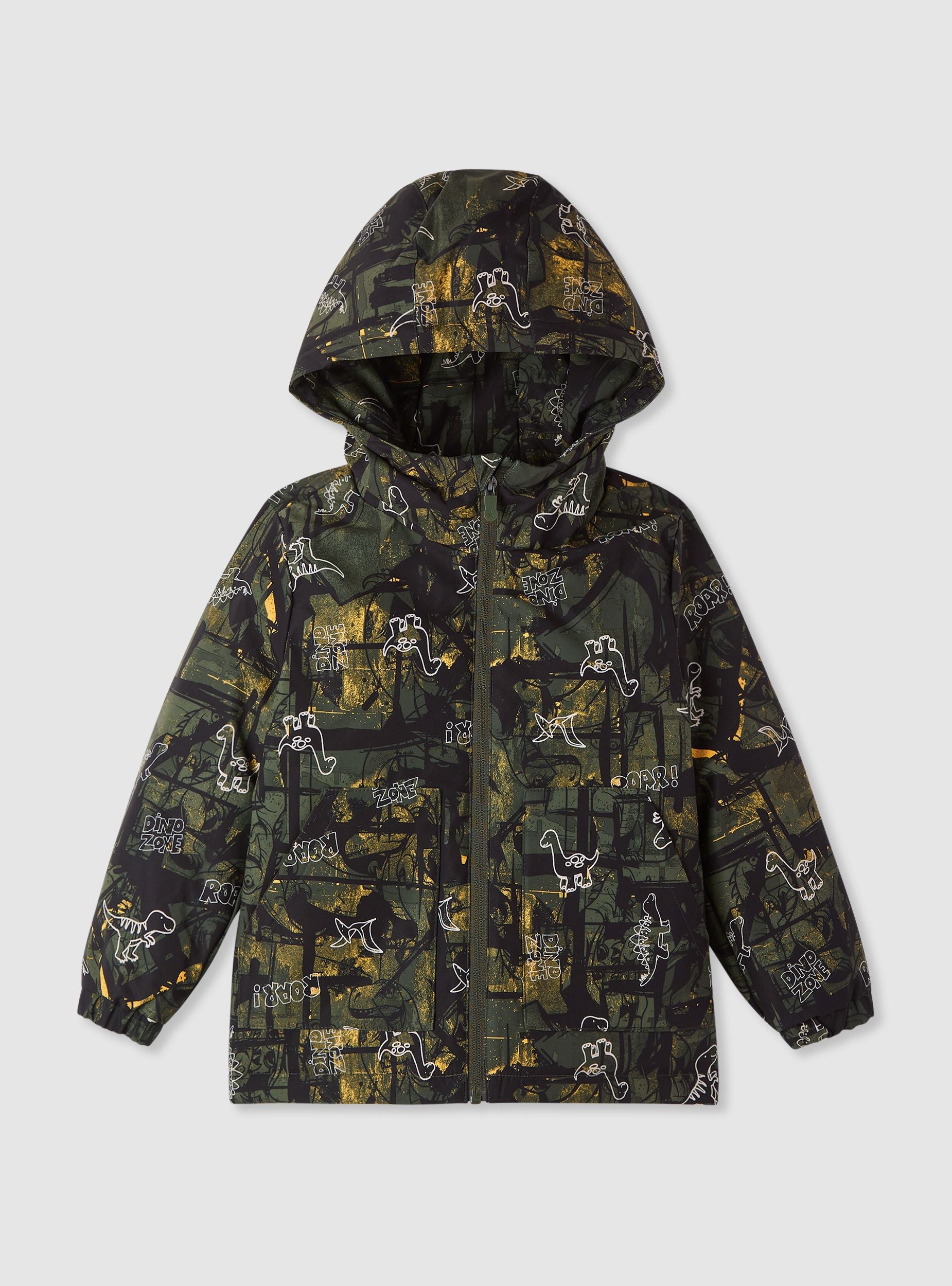 Jaket për fëmijë me kapuç, ideale për ditët e zakonshme. I pajisur me një mbyllje me zinxhir, ky veshje ka një print të gjallë me temë dinosaurrësh që e bën unik dhe argëtues. Perfekt për t'u mbrojtur nga era dhe shiu, ofron një dizajn praktik me xhepa funksionalë dhe manikë elastikë. Një opsion shumëpërdorues për të kompletuar veshje të rehatshme dhe moderne.