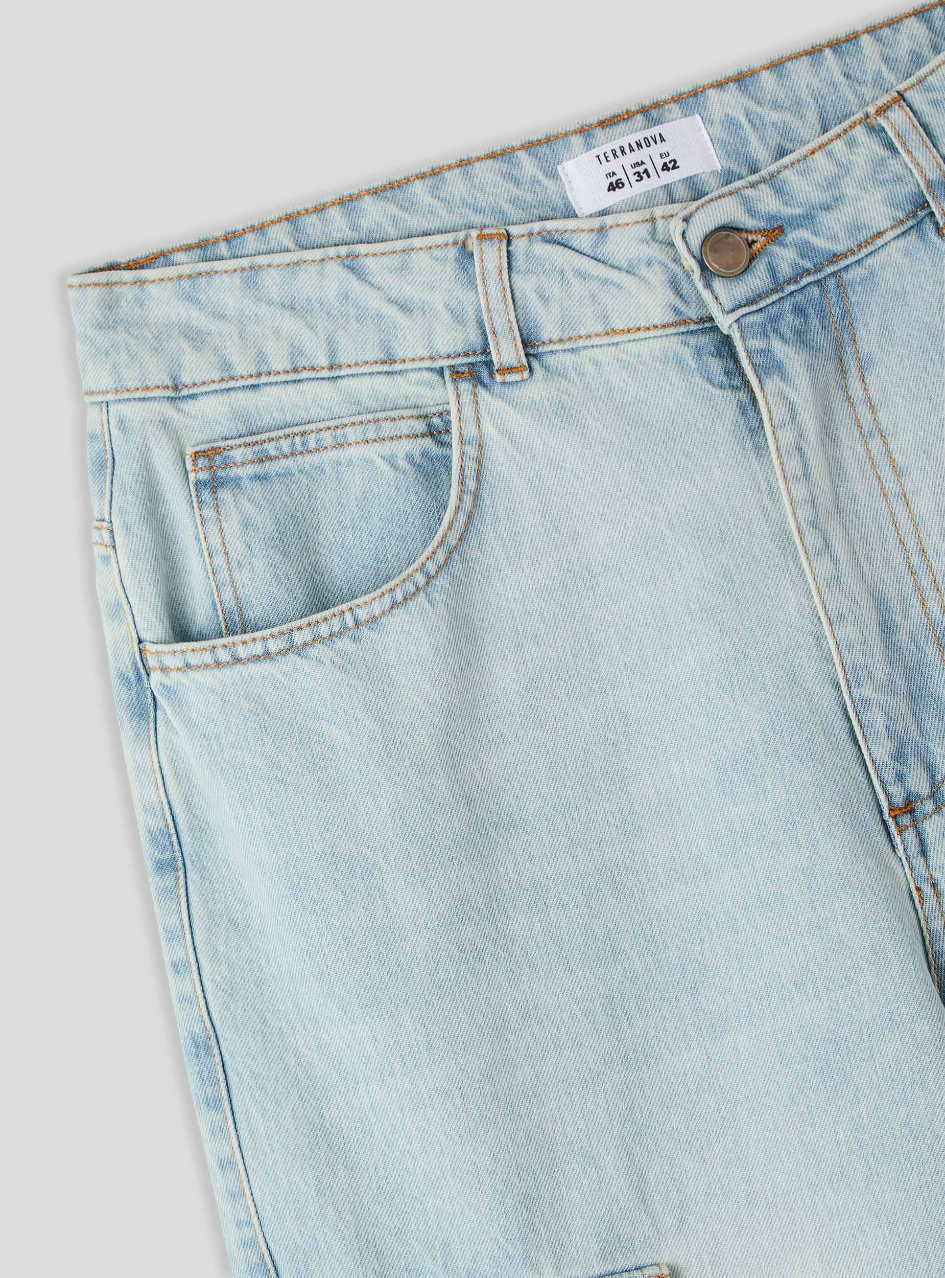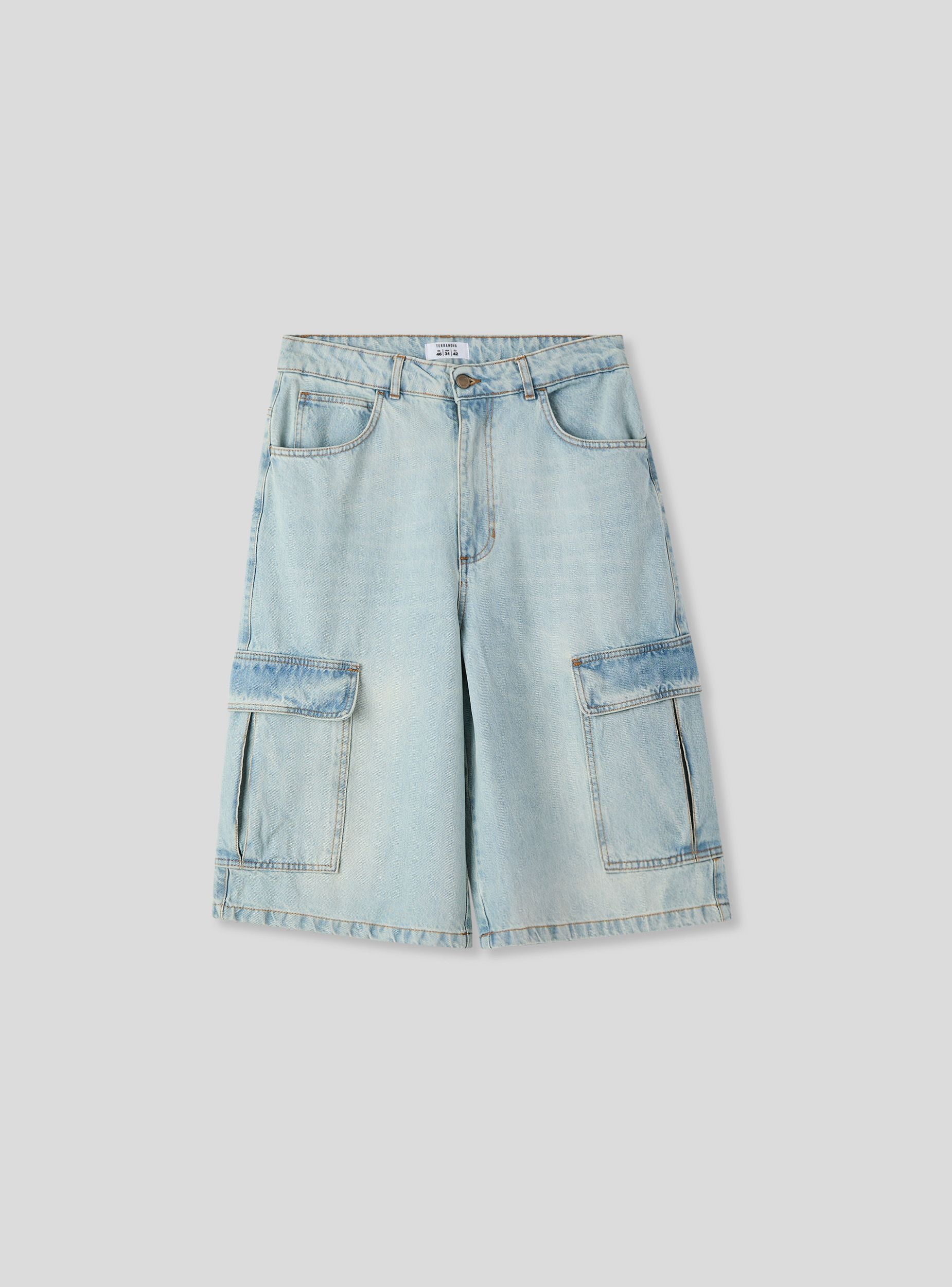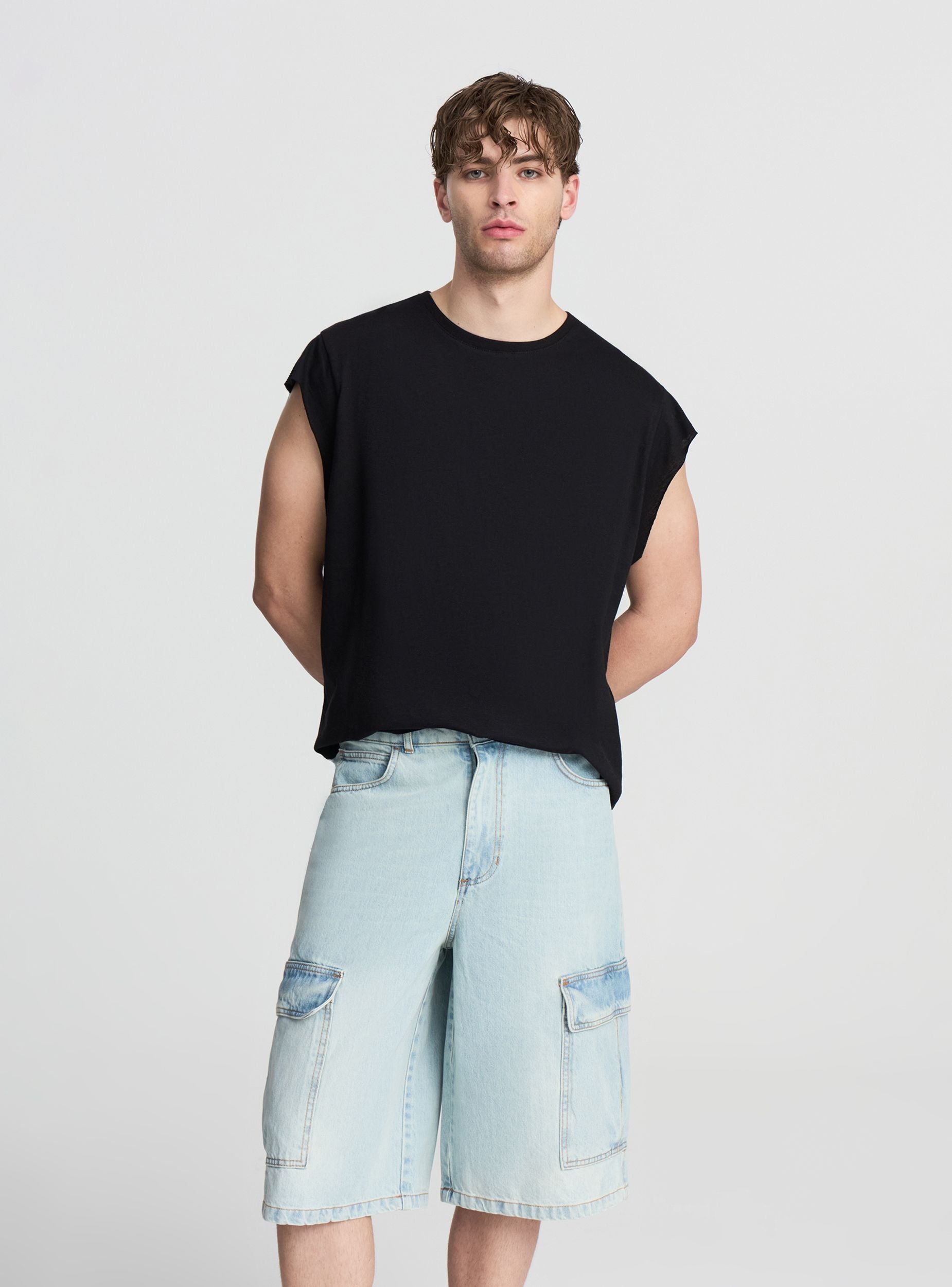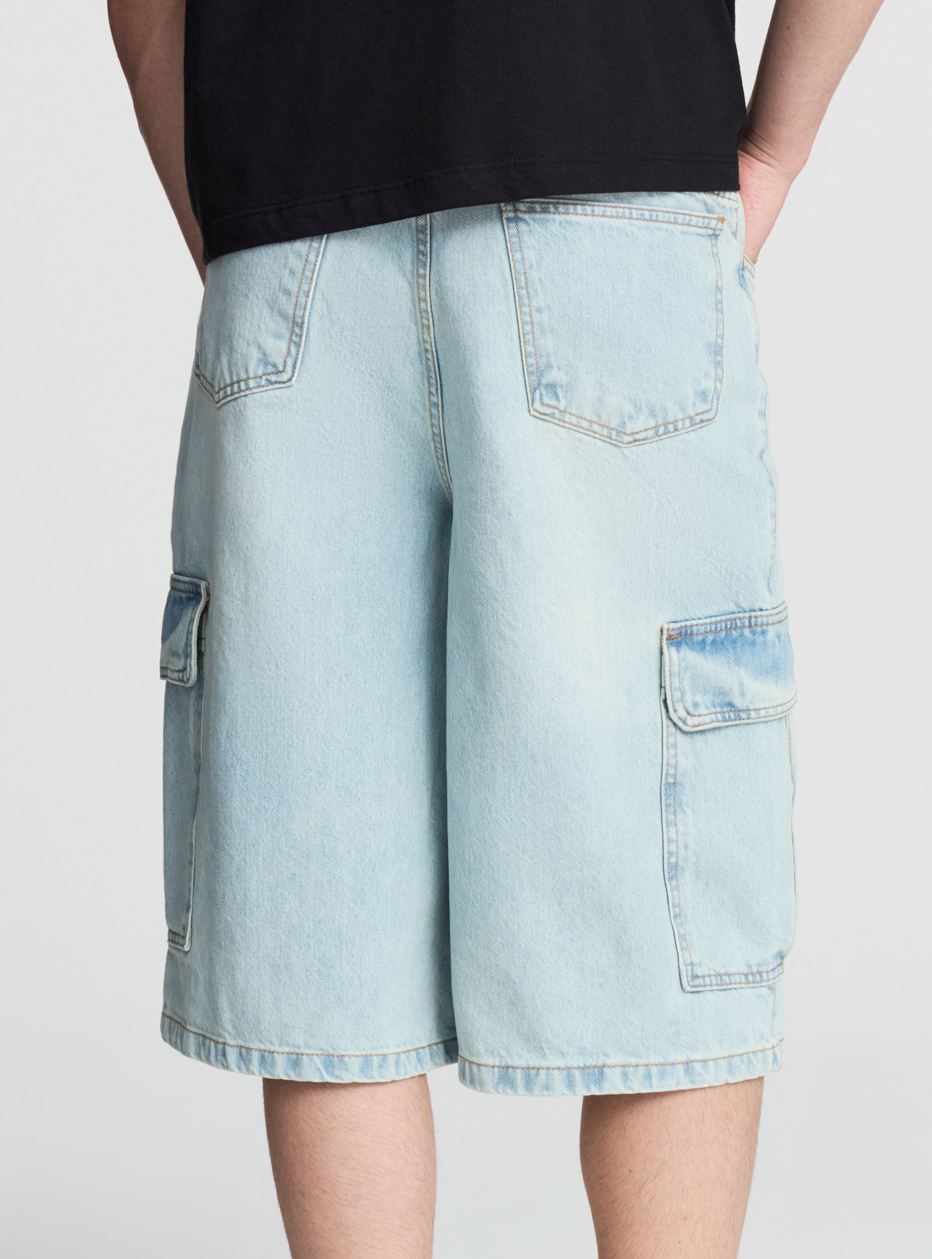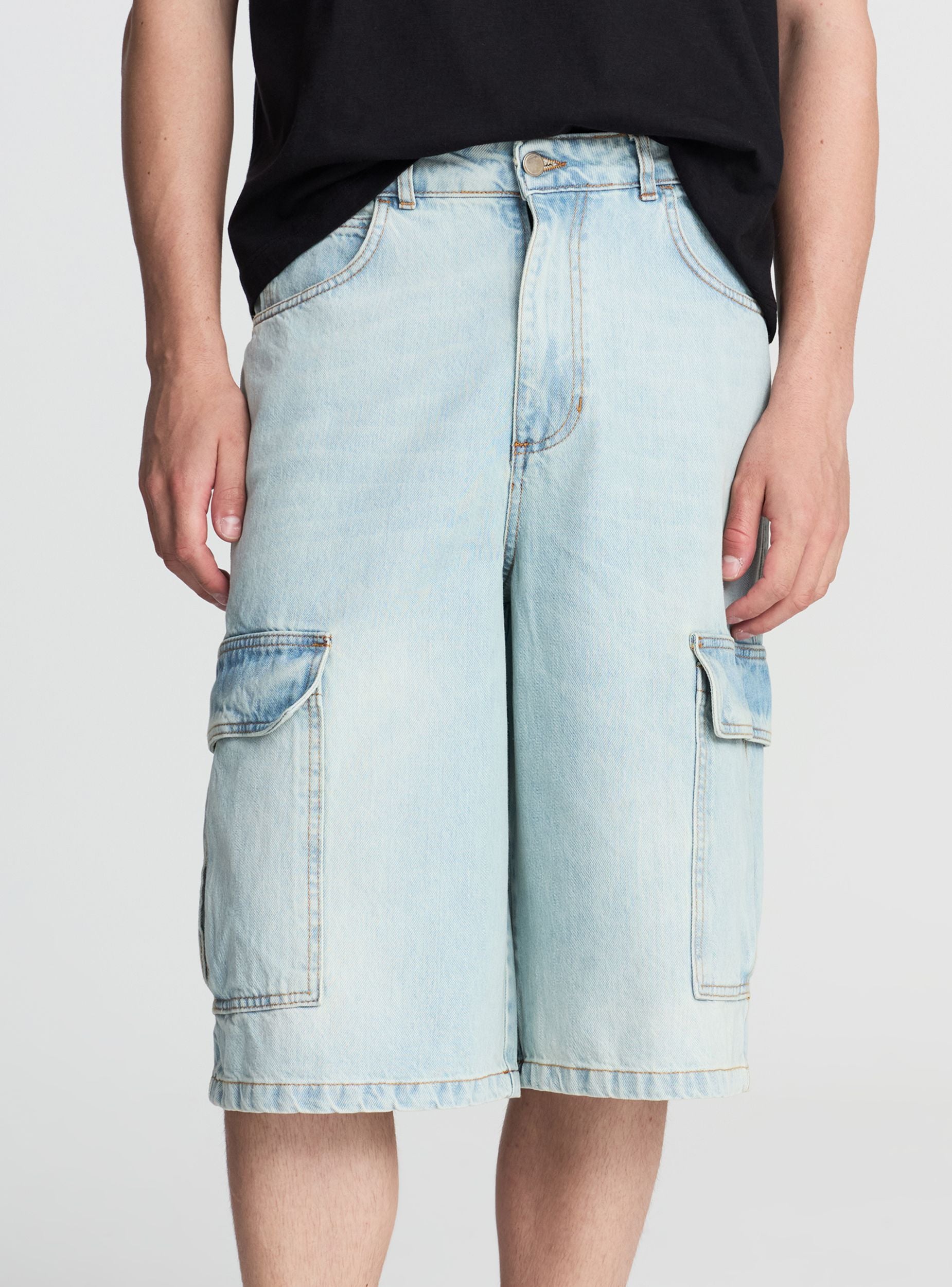 Bermuda për burra të përsosur për një pamje të zakonshme dhe praktike. Kanë një dizajn shumë i lirshëm me xhepa cargo të mëdhenj dhe funksionalë, perfekt për të mbajtur objekte të vogla. Mbyllja me buton dhe zinxhir siguron një përshtatje të rehatshme dhe të sigurt. Realizuar në denim, janë të përshtatshëm dhe të përshtaten për shumë raste, kombinuar me T-shirt dhe këpucë sportive për një veshje të thjeshtë.