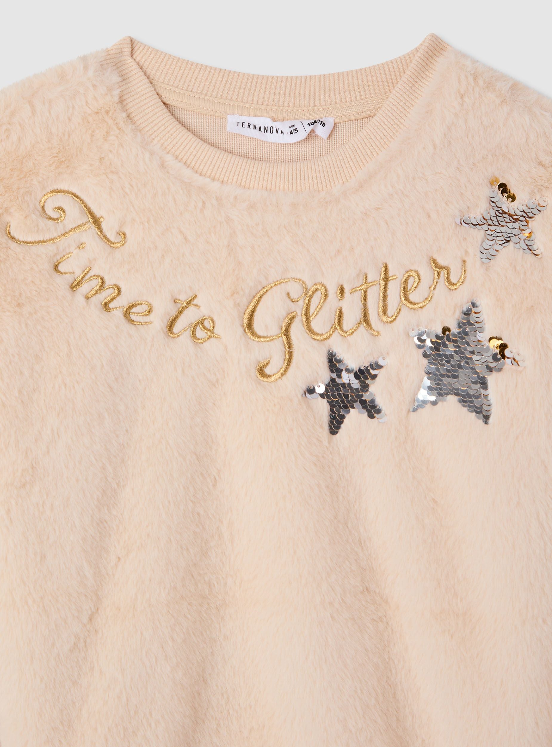 Bluza për vajza me qafë rrethore dhe mëngë të gjata, plotësisht me një pamje të butë dhe të këndshme. Dizajni me ngjyrë të vetme është pasuruar me aplikime me paljeta dhe një shkrim dekorativ në pjesën e përparme, për një efekt shkëlqyes që ndriçon çdo veshje. Fundi dhe manshetat me rripa të elastikë sigurojnë përshtatje të rehatshme. E përshtatshme për shkollë, kohë të lirë dhe kombinime me xhinse ose legjinga.Detajet