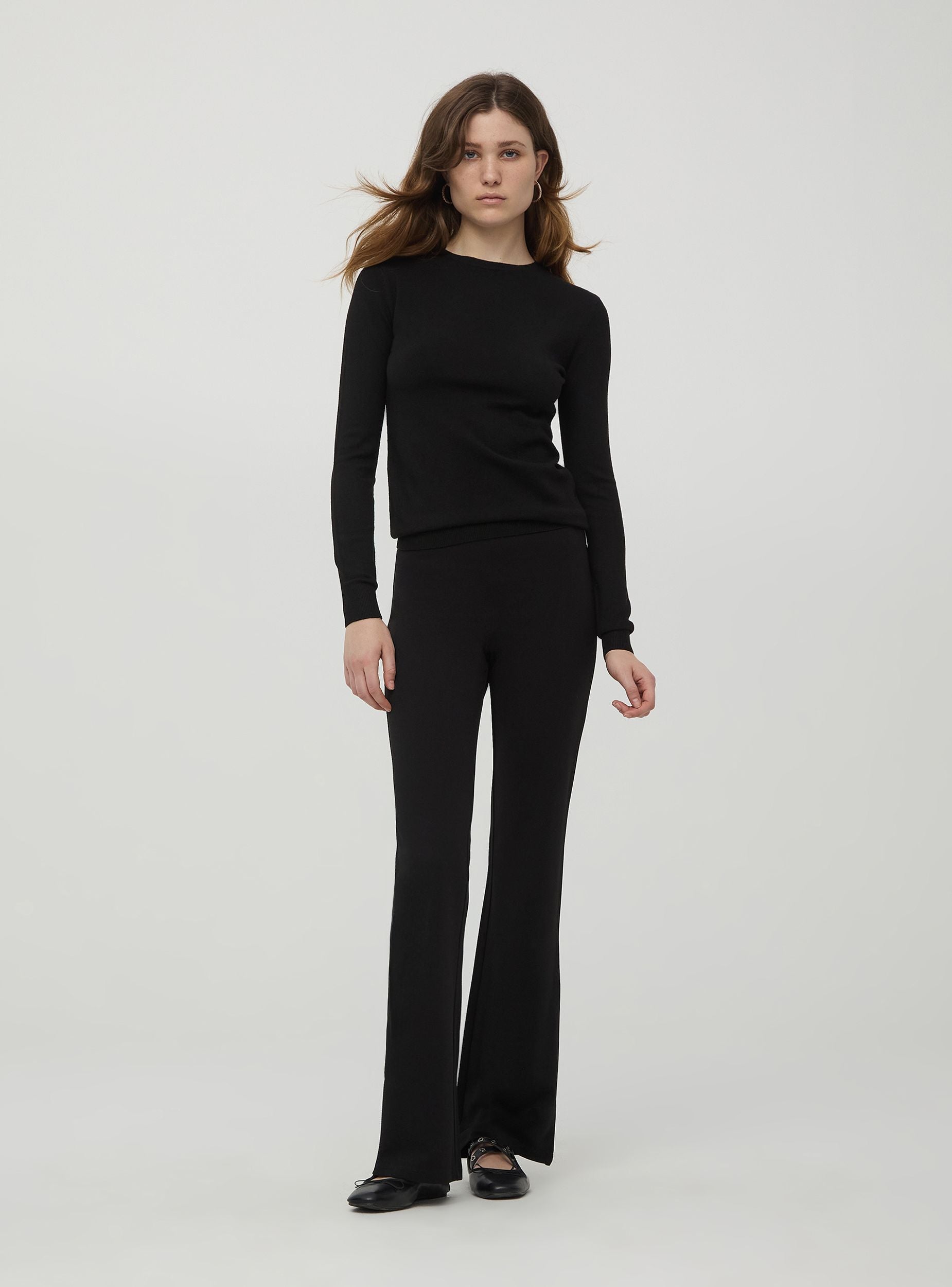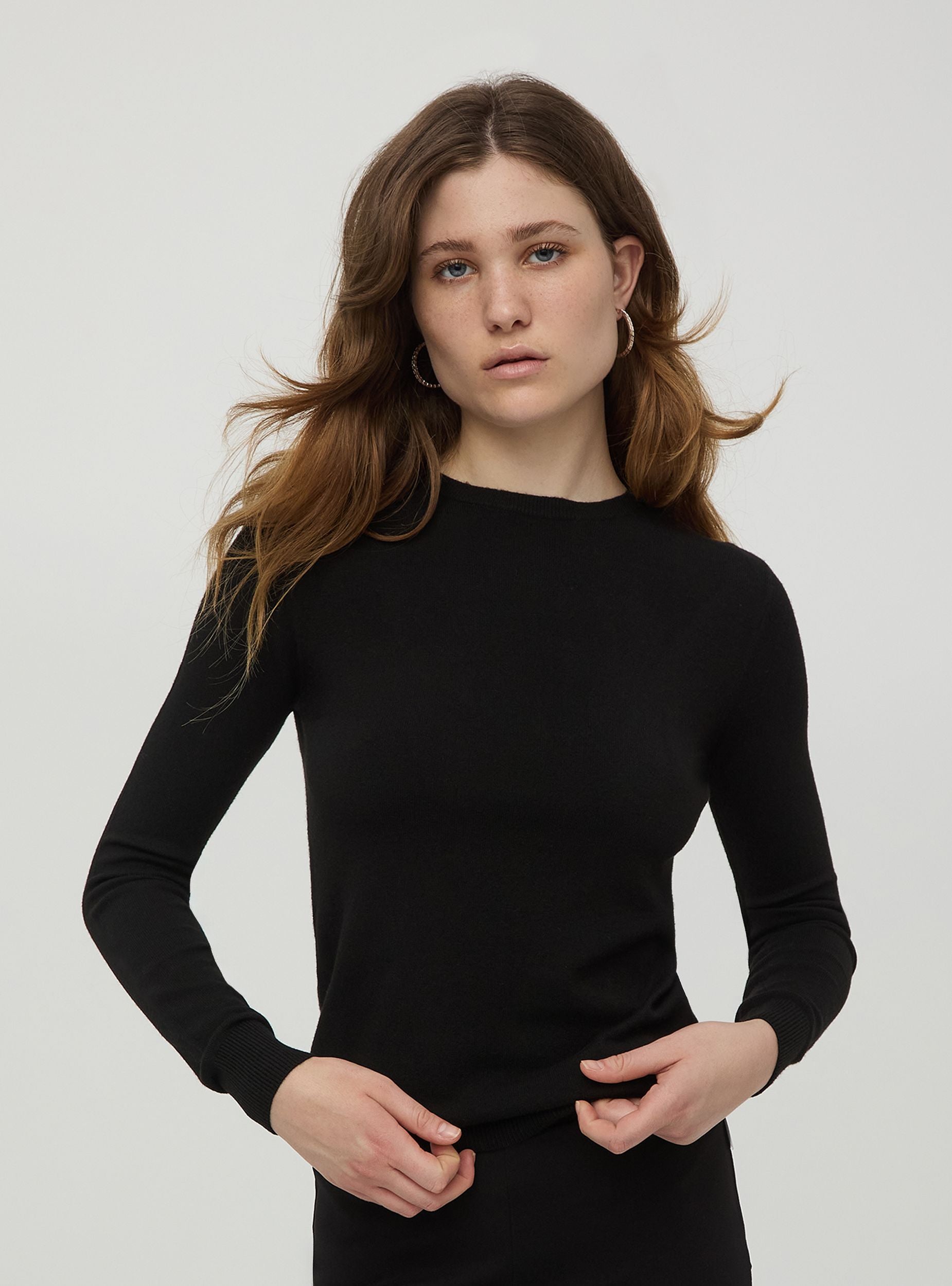 Bluzë për gra me mëngë të gjata e bërë nga një material të butë me ngjyrë të njëtrajtshme. Model me qafë të rrumbullakët me përfundime me rripa. Përshtatje normale. Një pjesë bazike e lehtë për t'u kombinuar, e përsosur për rastet rastësore dhe të përditshme.