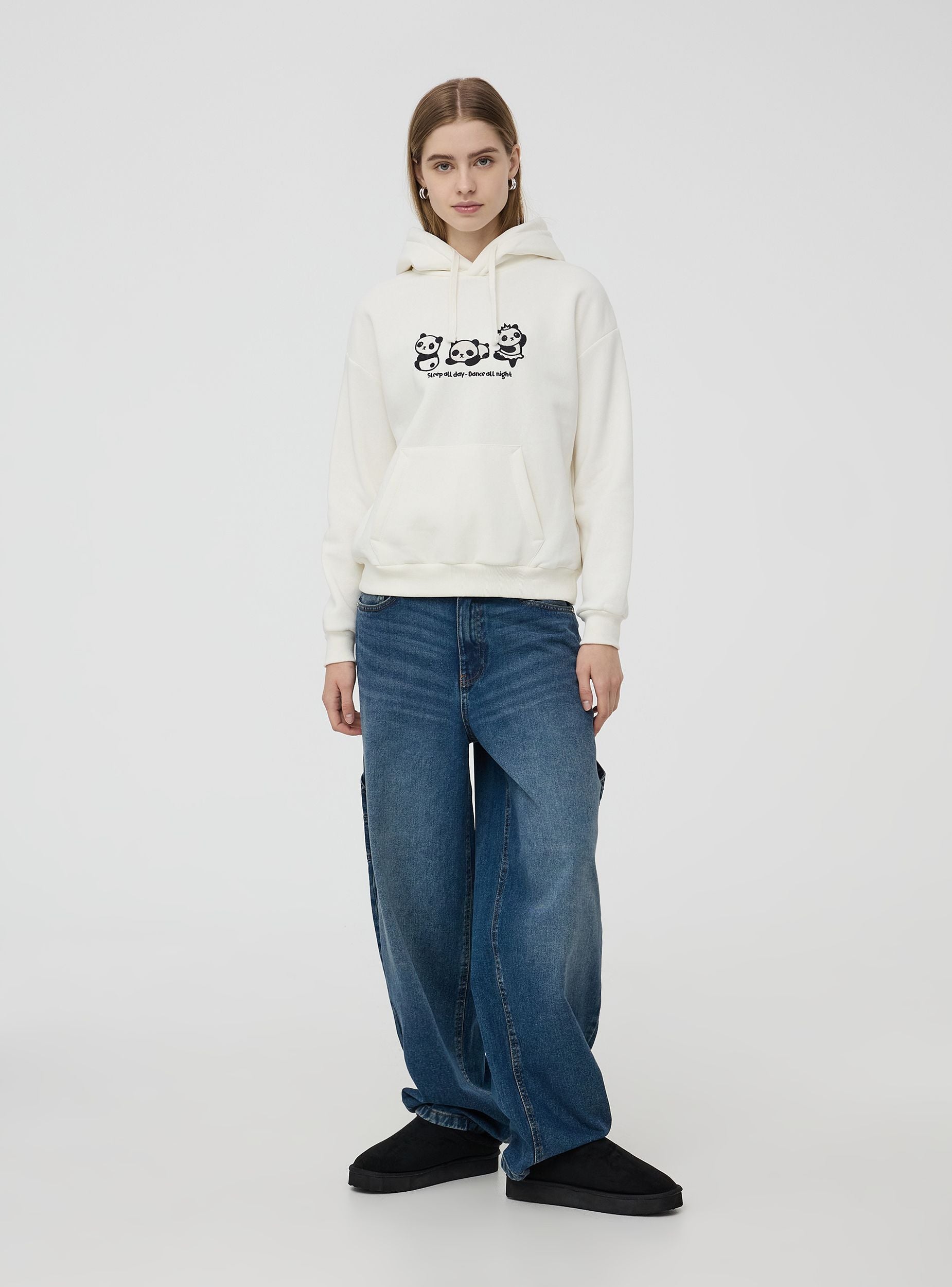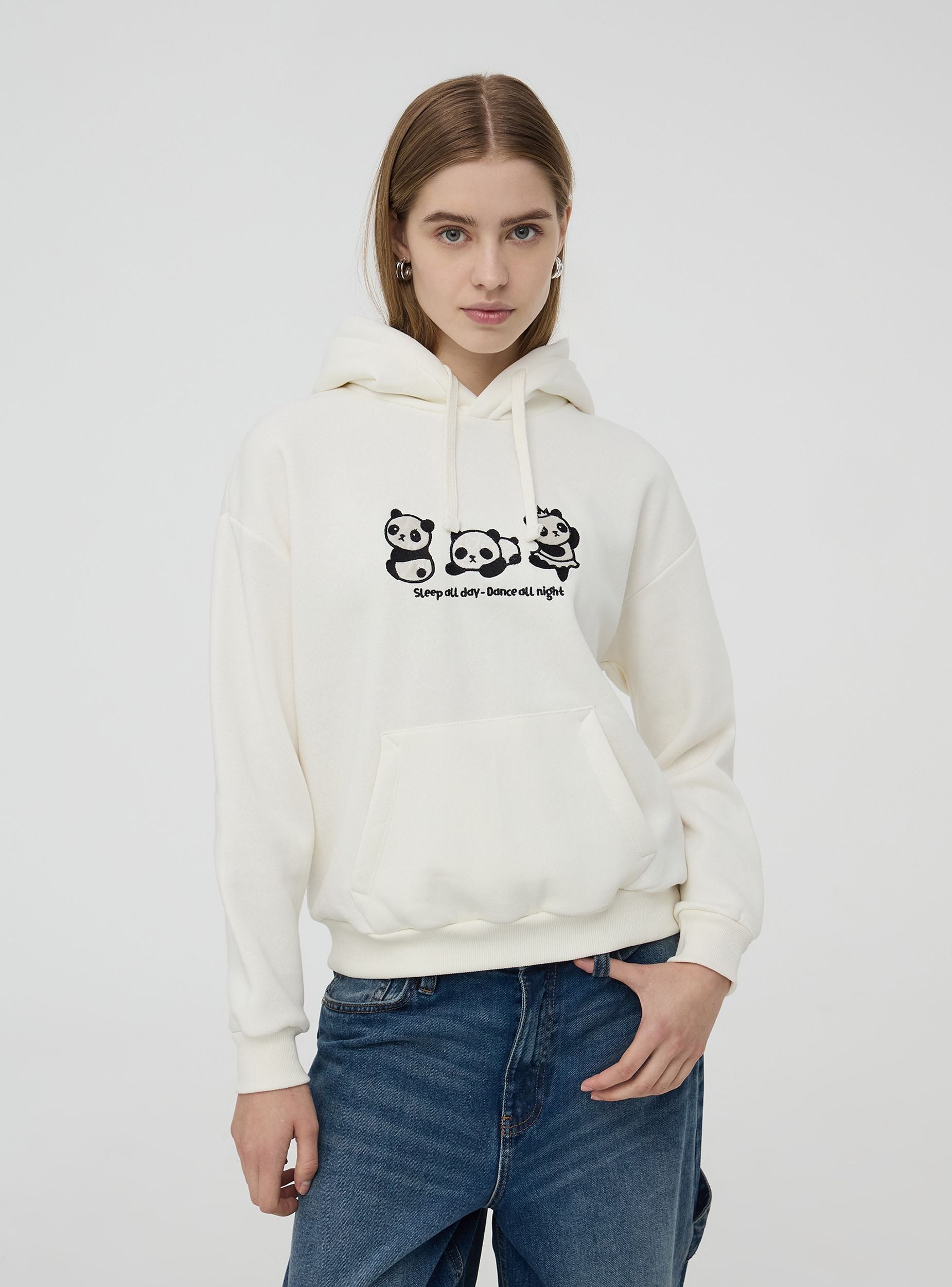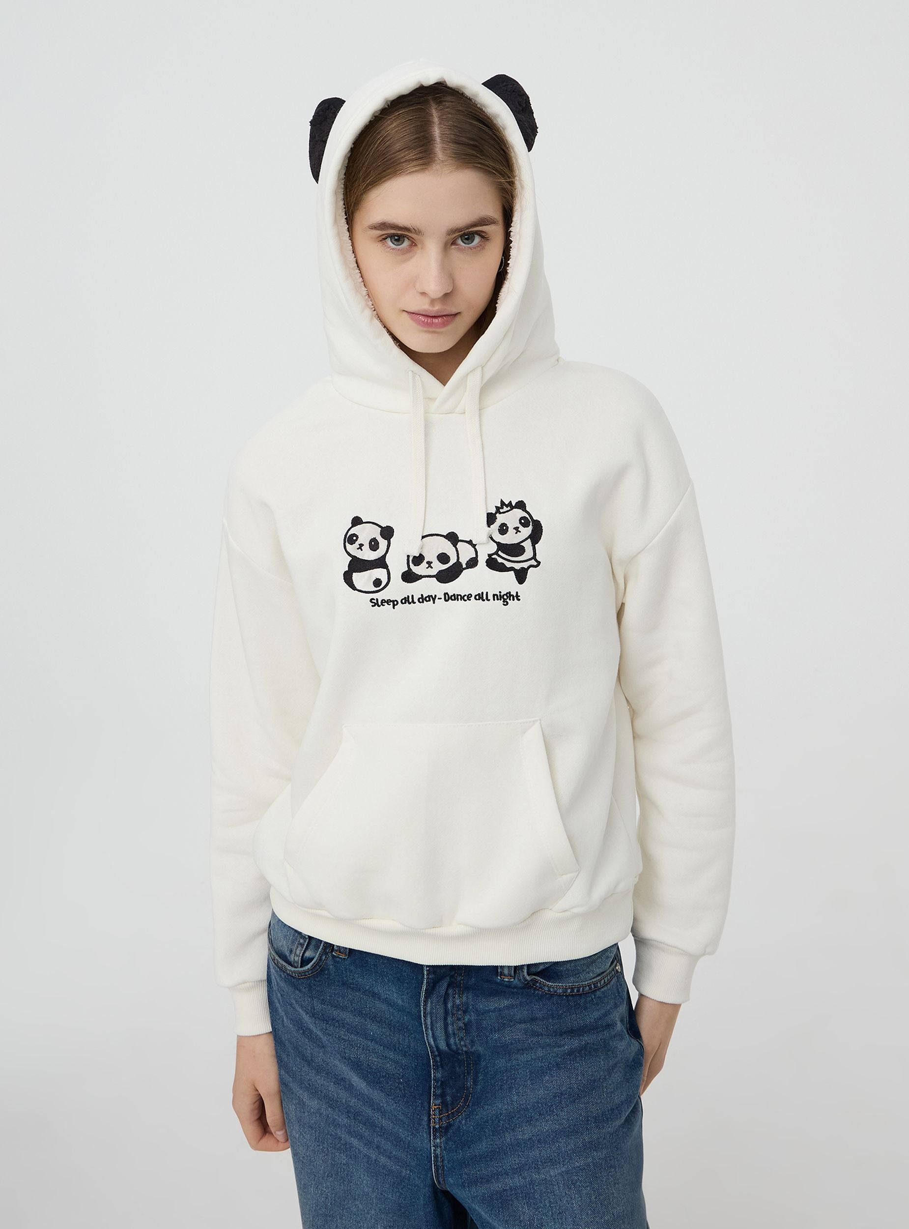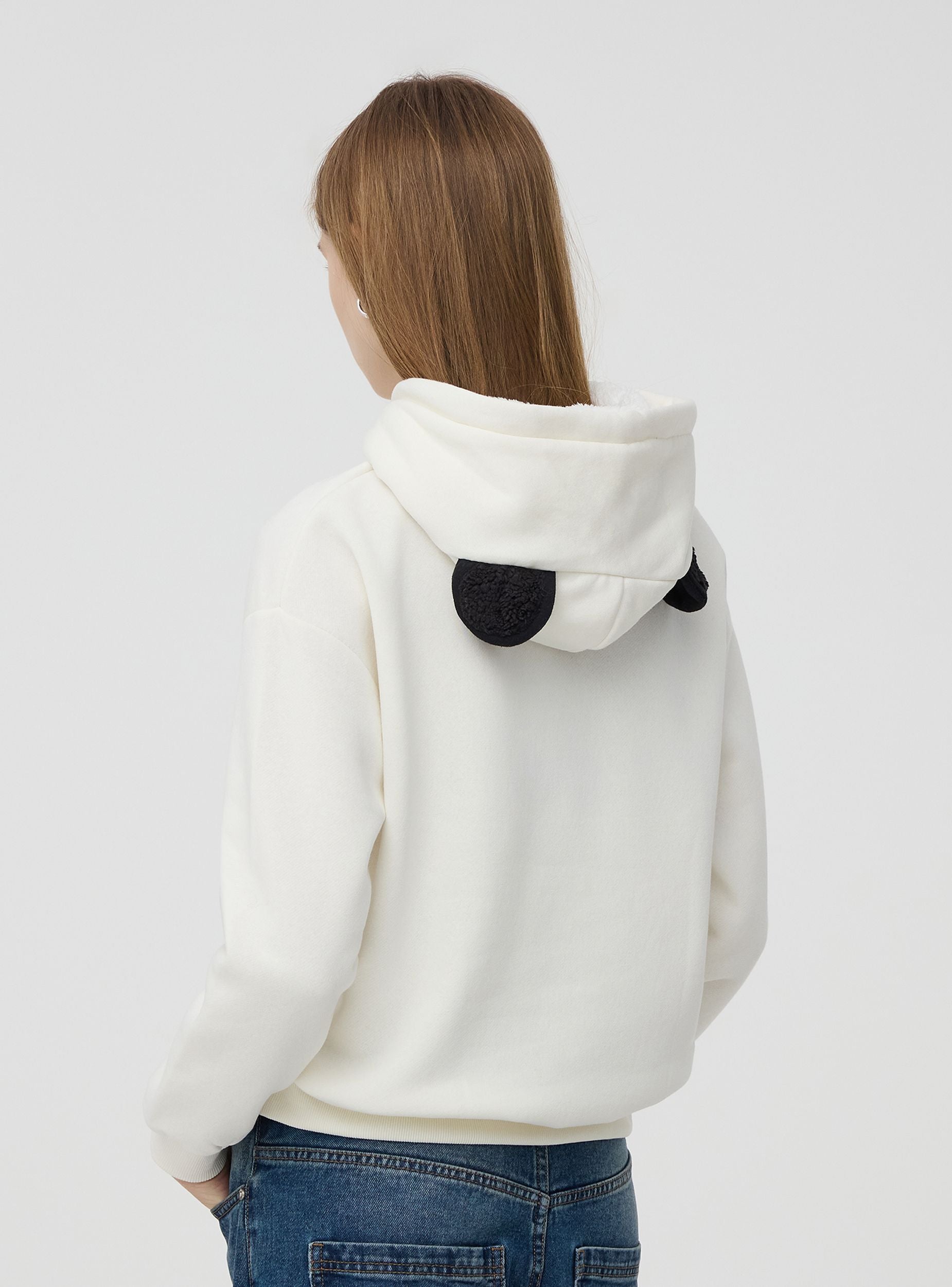 Pulovër për gra me kapuç të mbushur brenda me sherpa të ngrohtë dhe me veshë të aplikuar. Të bëra nga një stof i rëndë me patch panda dhe shkrim të qëndisur. Model me drawstring dhe xhep frontal marsupio. Përshtatje e rregullt.Detajet