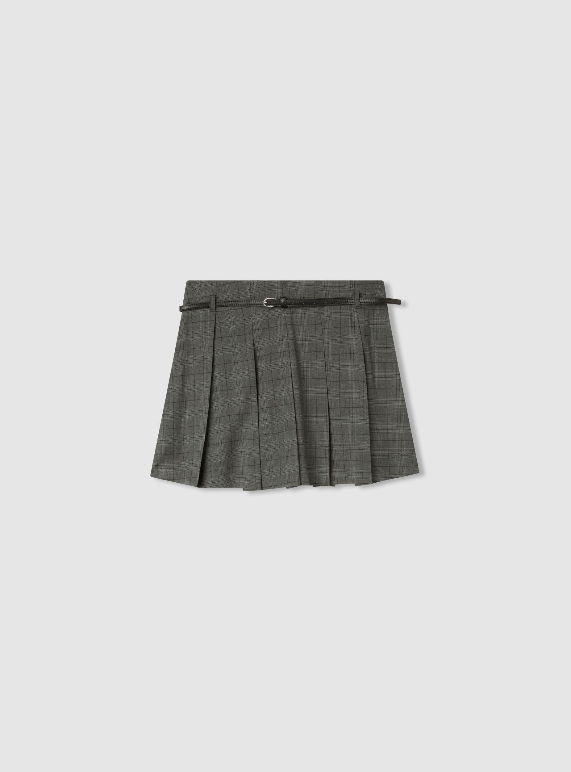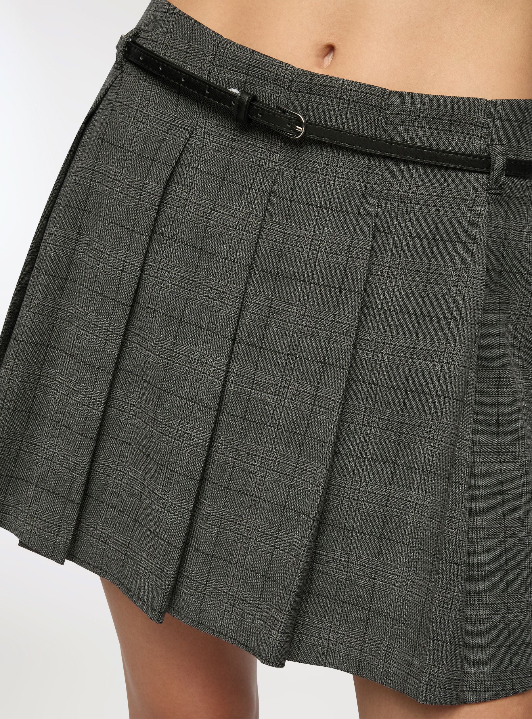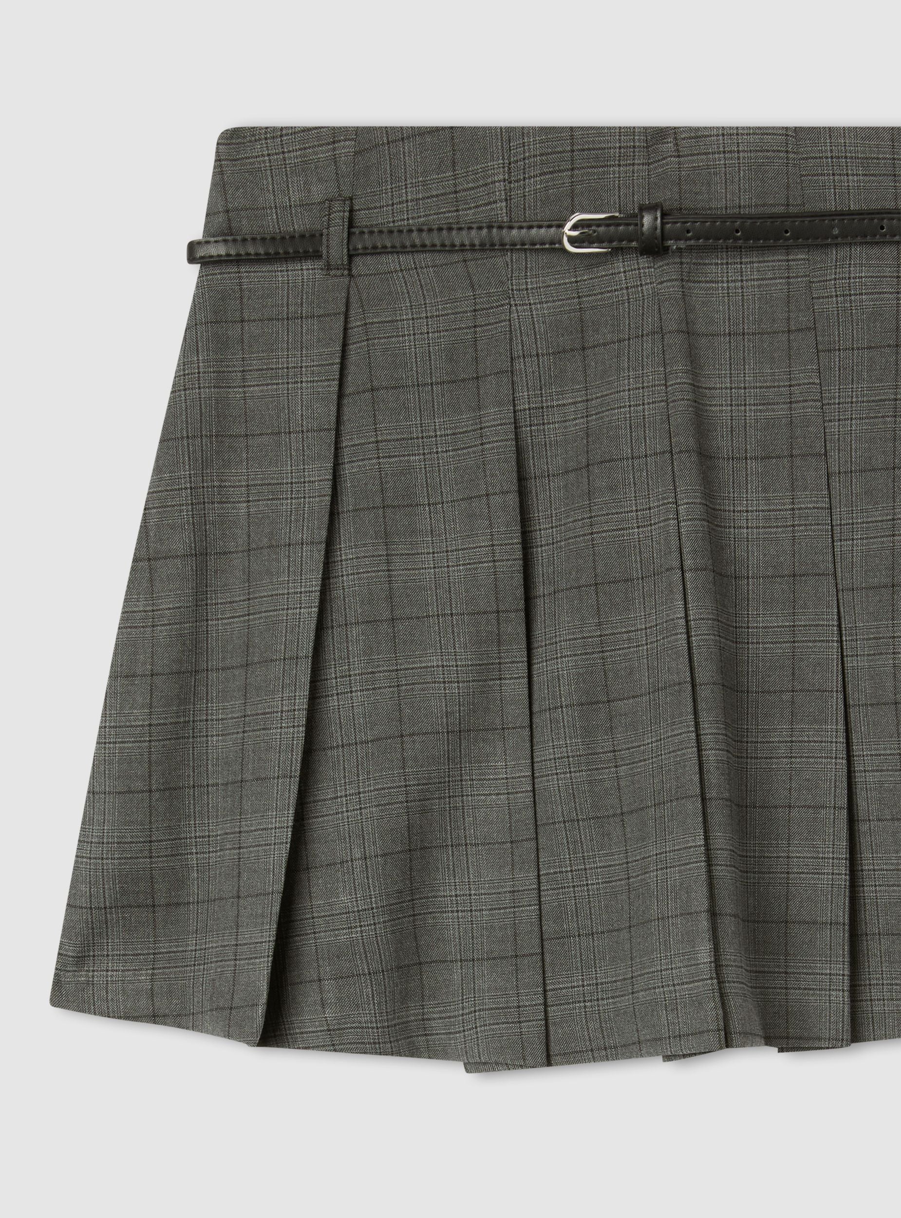 Fustan-shkurtore për gra me dizajn me palosje dhe model katror. E pajisur me brez dekorativ me kapëse, shton një prekje stili në veshje. Ideale për një pamje casual ose trendy, përshtatet në mënyrë të përkryer me çizme të larta ose këpucë të ulëta për një veshje të shumëanshme. E pajisur me zinxhir anësor. Përshtatja e rregullt dhe detaji i brezit plotësojnë dizajnin, duke e bërë të përshtatshme për raste joformale ose për një pamje të përditshme moderne.Detajet