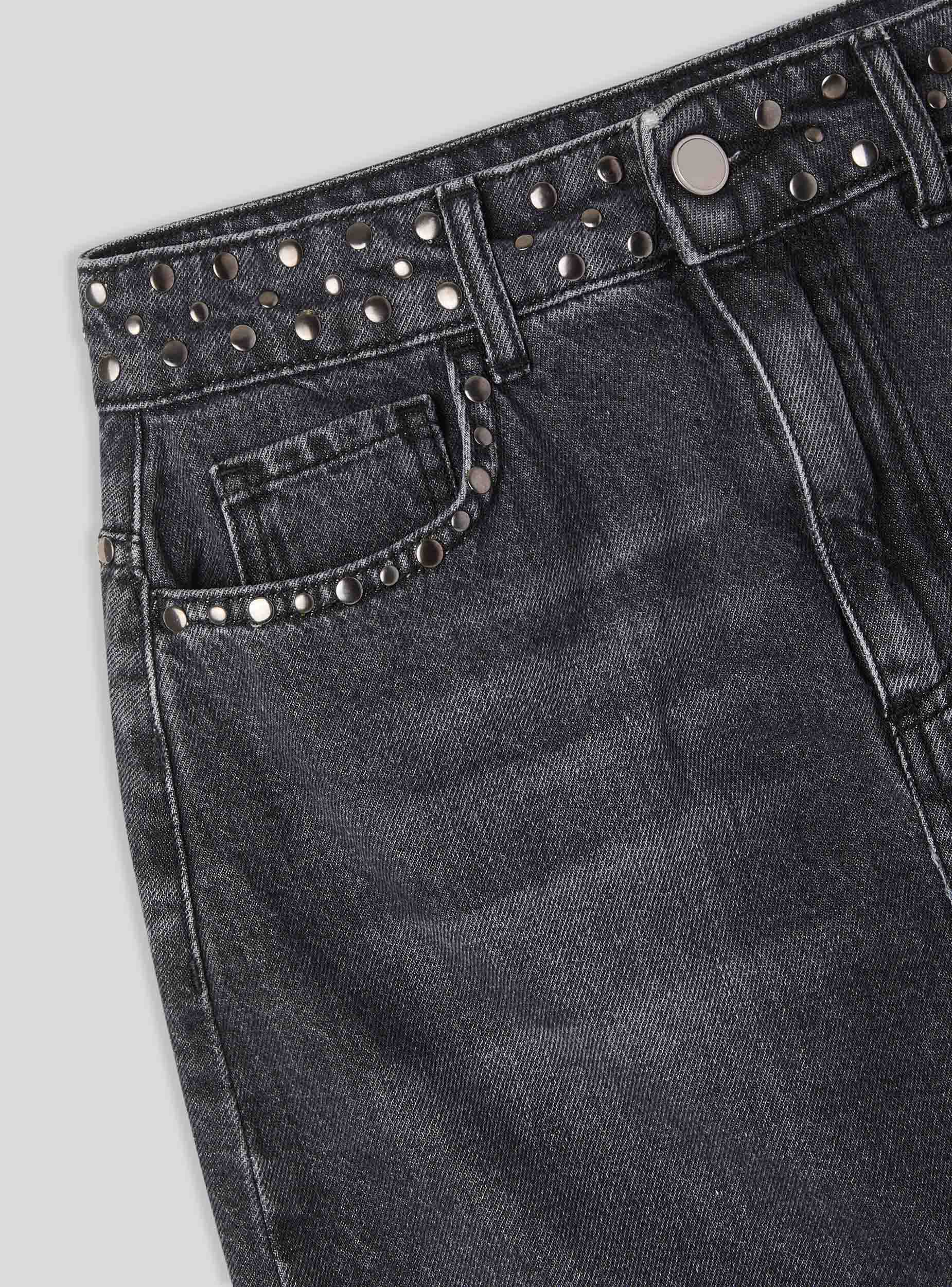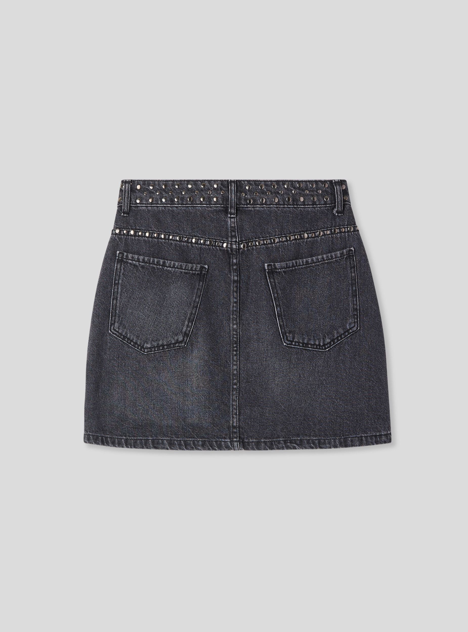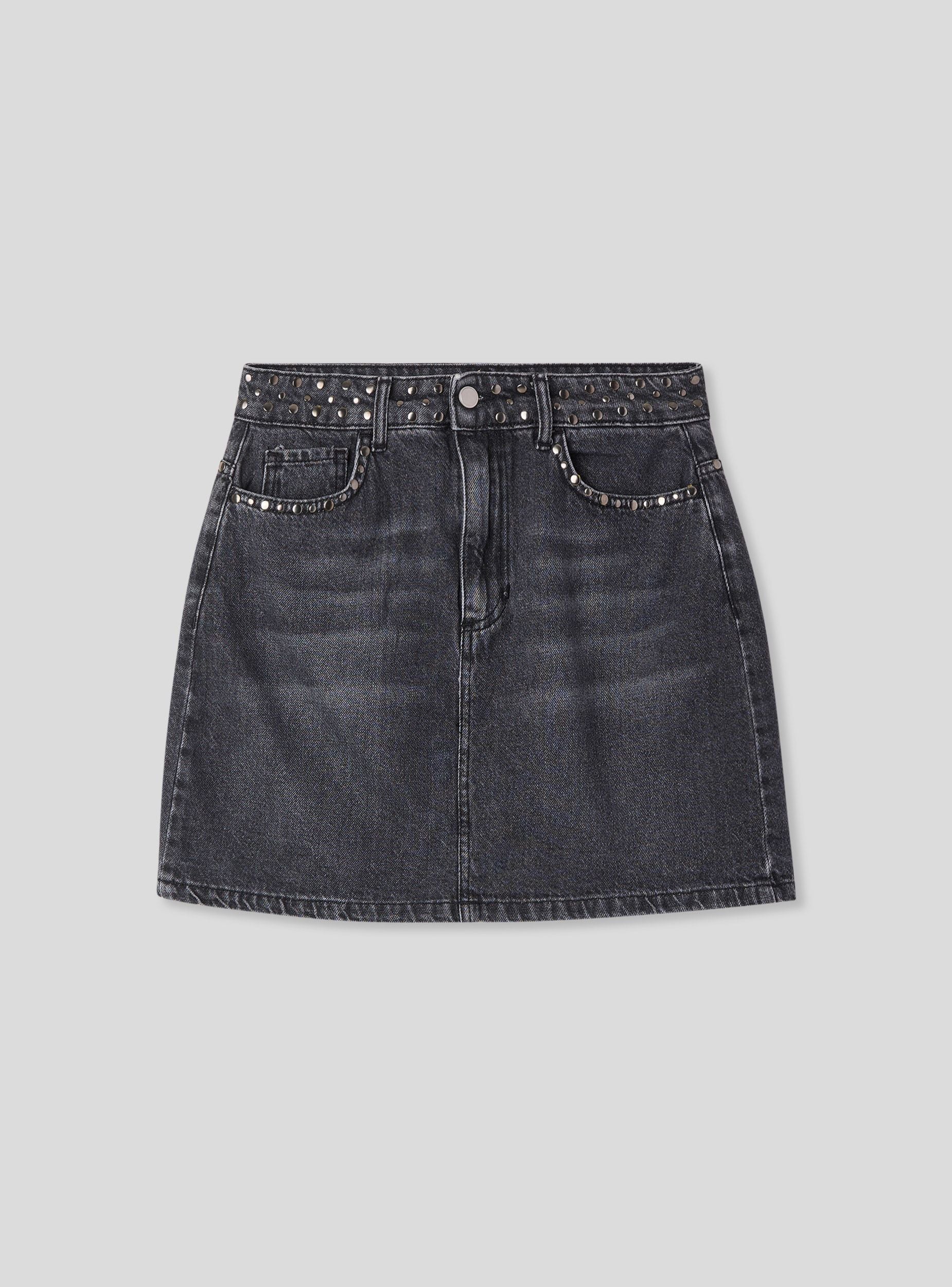 Fustan i shkurtër për femra nga denim, model mini me ngjyrë të vetme. Linjë e drejtë me bel të rregullt, rripa për brez dhe mbyllje frontale me buton dhe zinxhir. Pesë xhepa me konture të dekoruara me gozhda metalike që i shtojnë një prekje të fortë. Perfekt me bluzë dhe atlete për ditën ose me këmishë dhe çizme të shkurtra për mbrëmjen. Ideal për pamje casual dhe urbane me karakter të vendosur.
