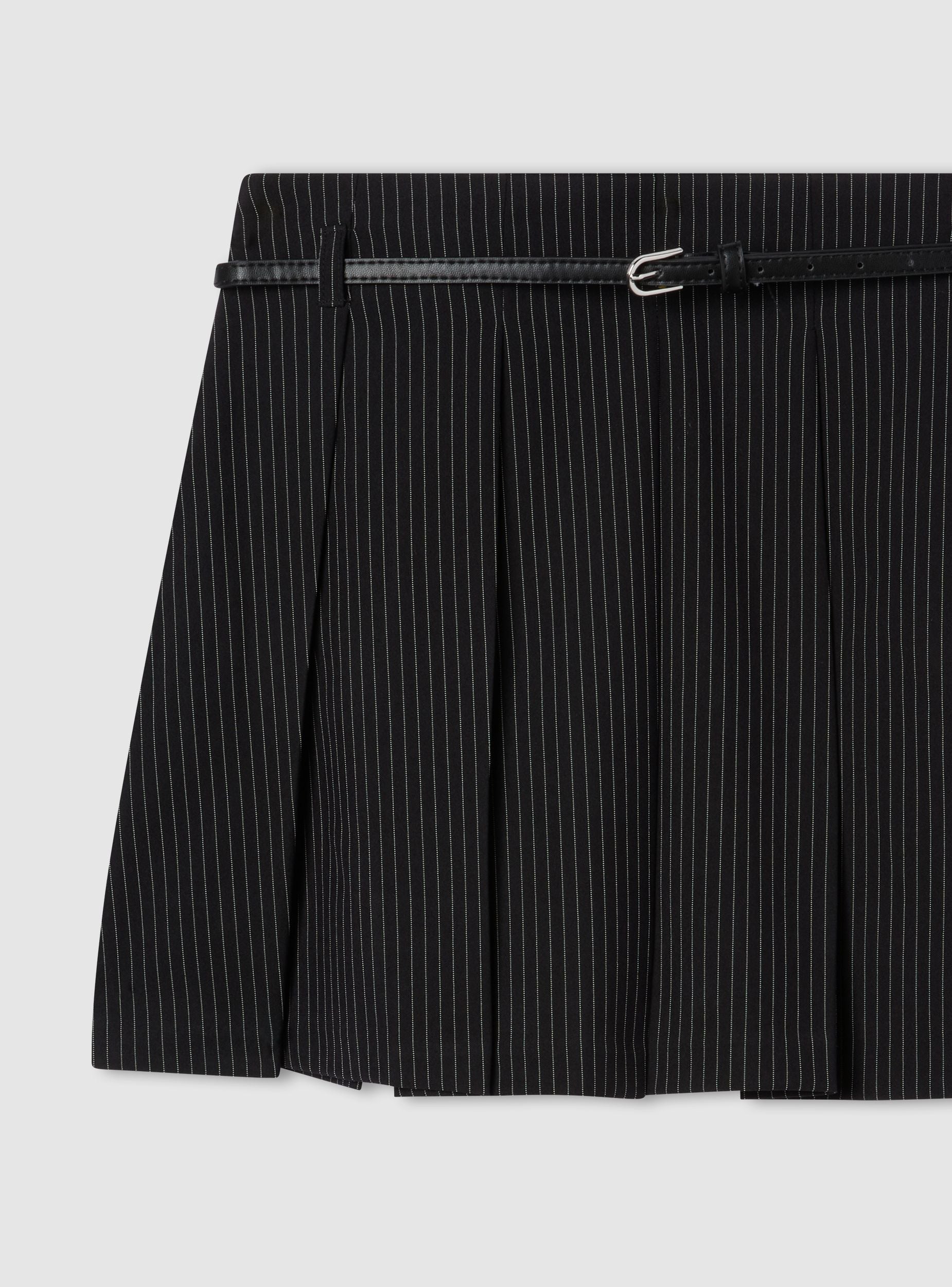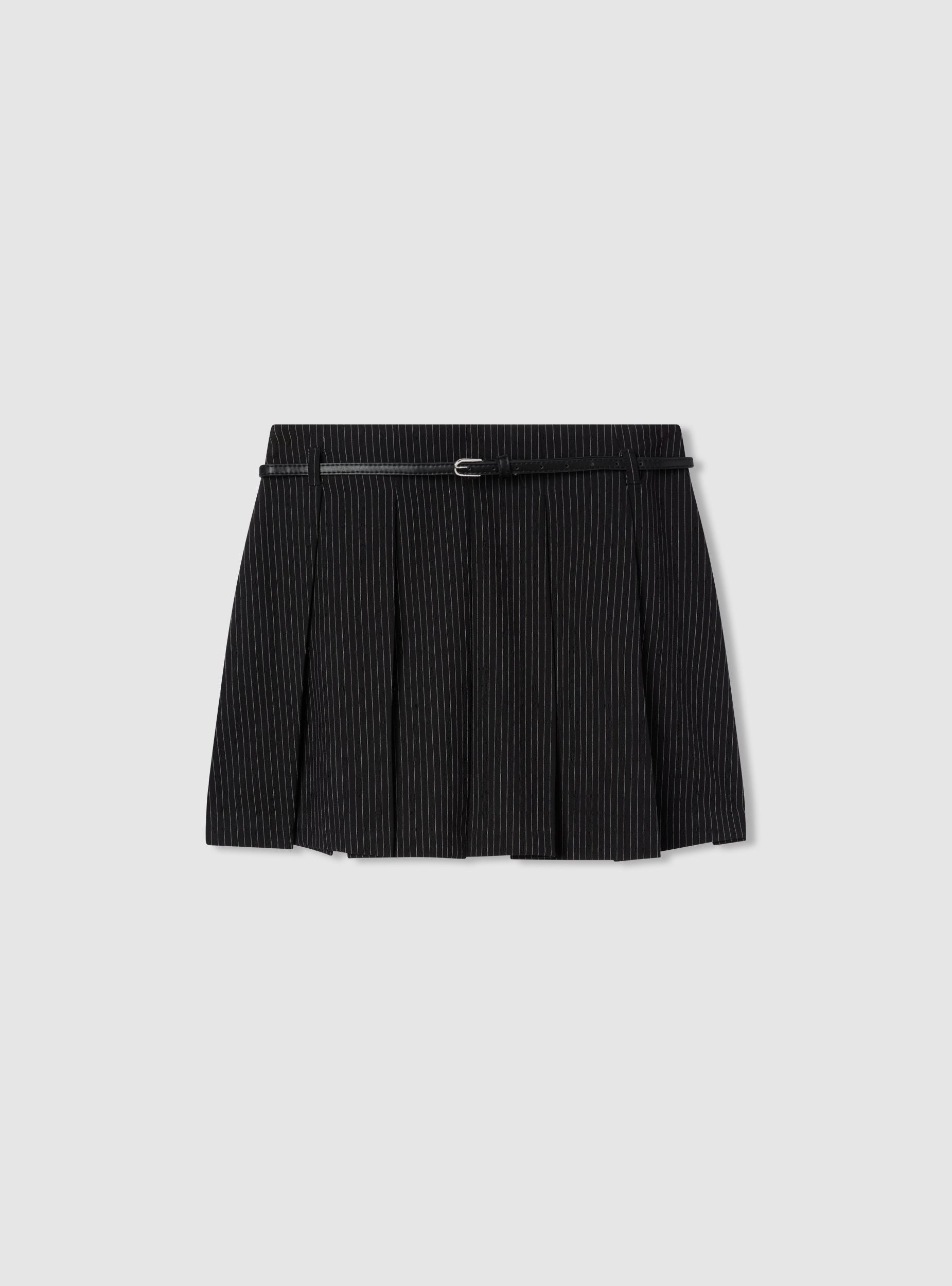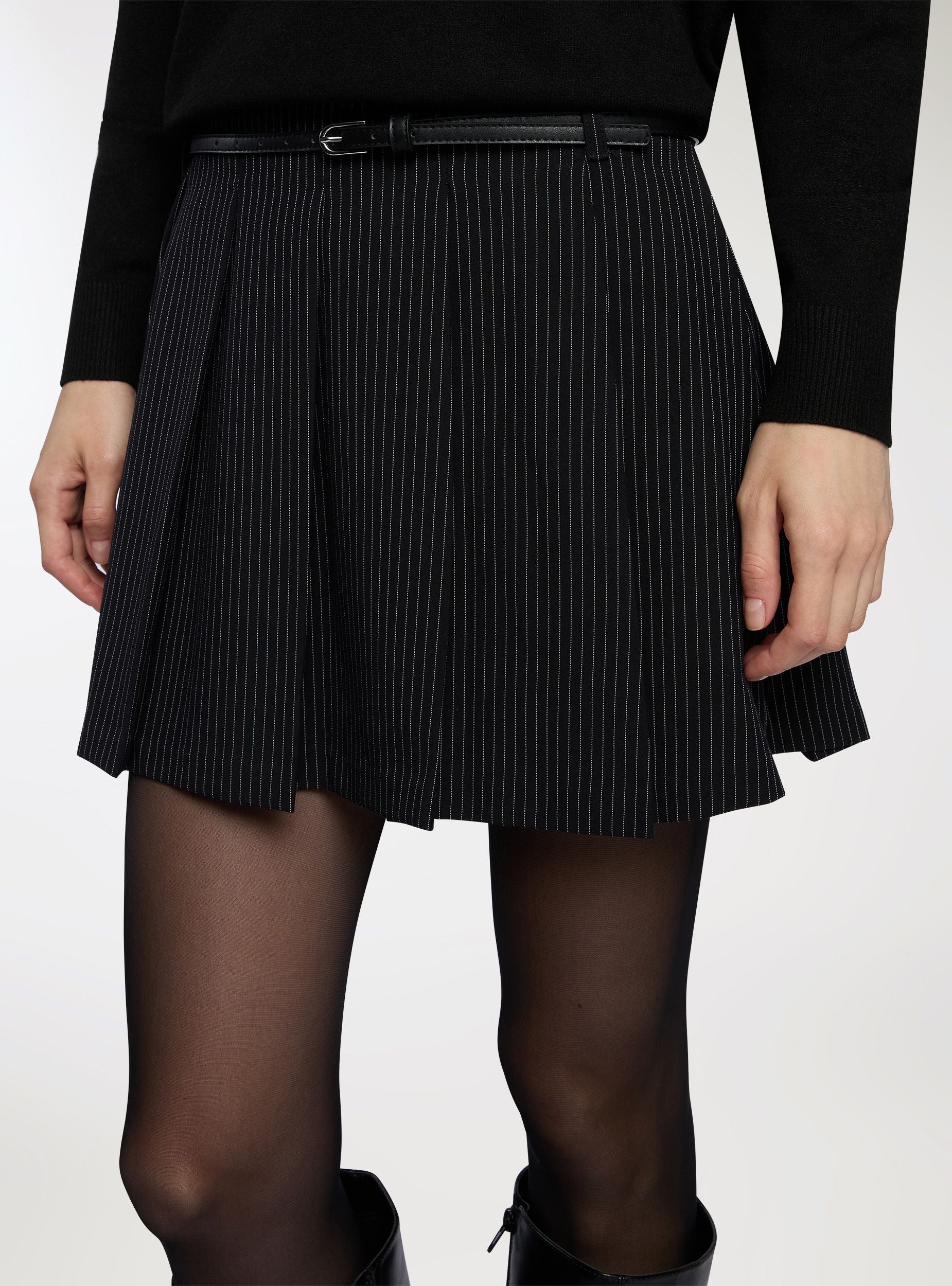 Pantalonë-fustan për gra me dizajn me palosje dhe model me vijëza të holla. E pajisur me një zinxhir anësor dhe një brez me fije për një prekje elegante dhe praktike. Ideale për raste formale ose për një pamje profesionale, përshtatet në mënyrë të përkryer me këmisha dhe çizme. Përshtatje e rregullt që thekson siluetën.Detajet