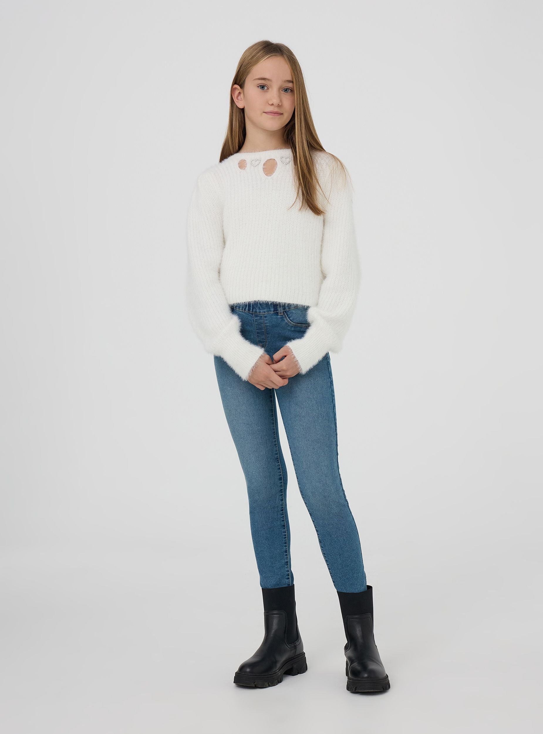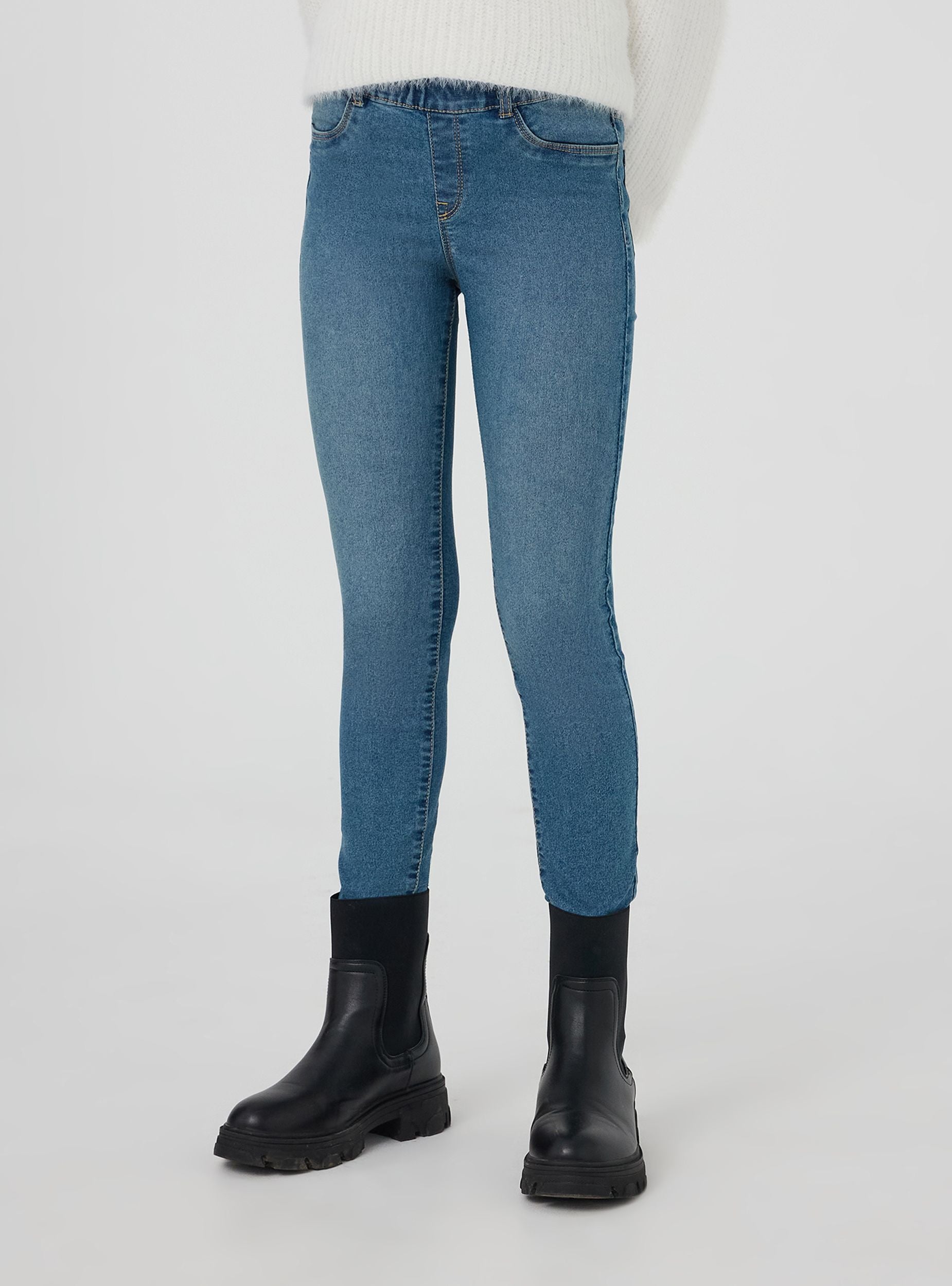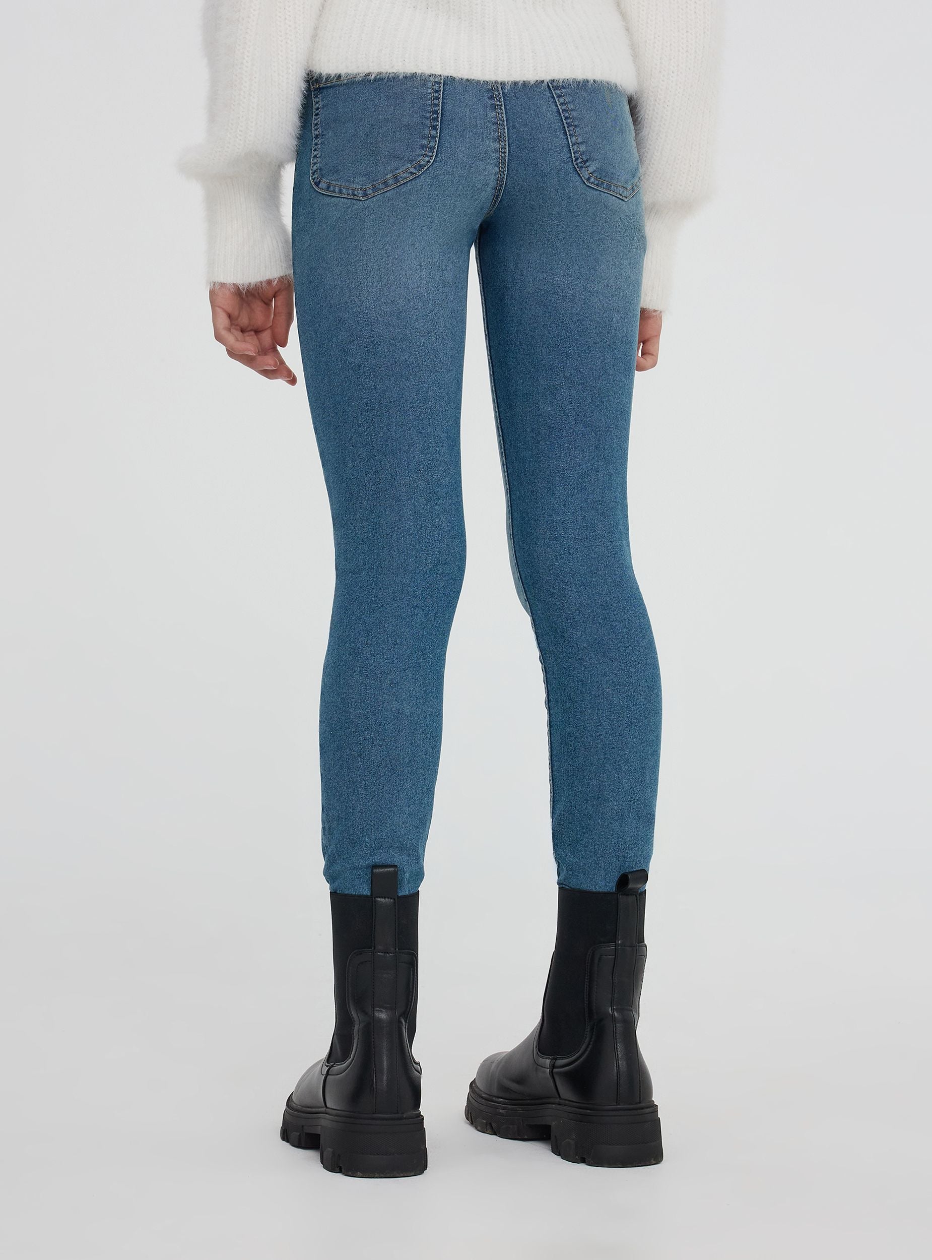 Këto jeggings për vajza në xhins elastik blu kombinojnë pamjen klasike të xhinseve me komoditetin e leggings. Ofron një përshtatje të ngushtë por komode. Kanë një brez elastik, që siguron një veshje të lehtë dhe të shpejtë. Xhepat e falsifikuar të përparëm mbajnë dizajnin minimaliste. Të përsosur për veshje casual chic.Detajet