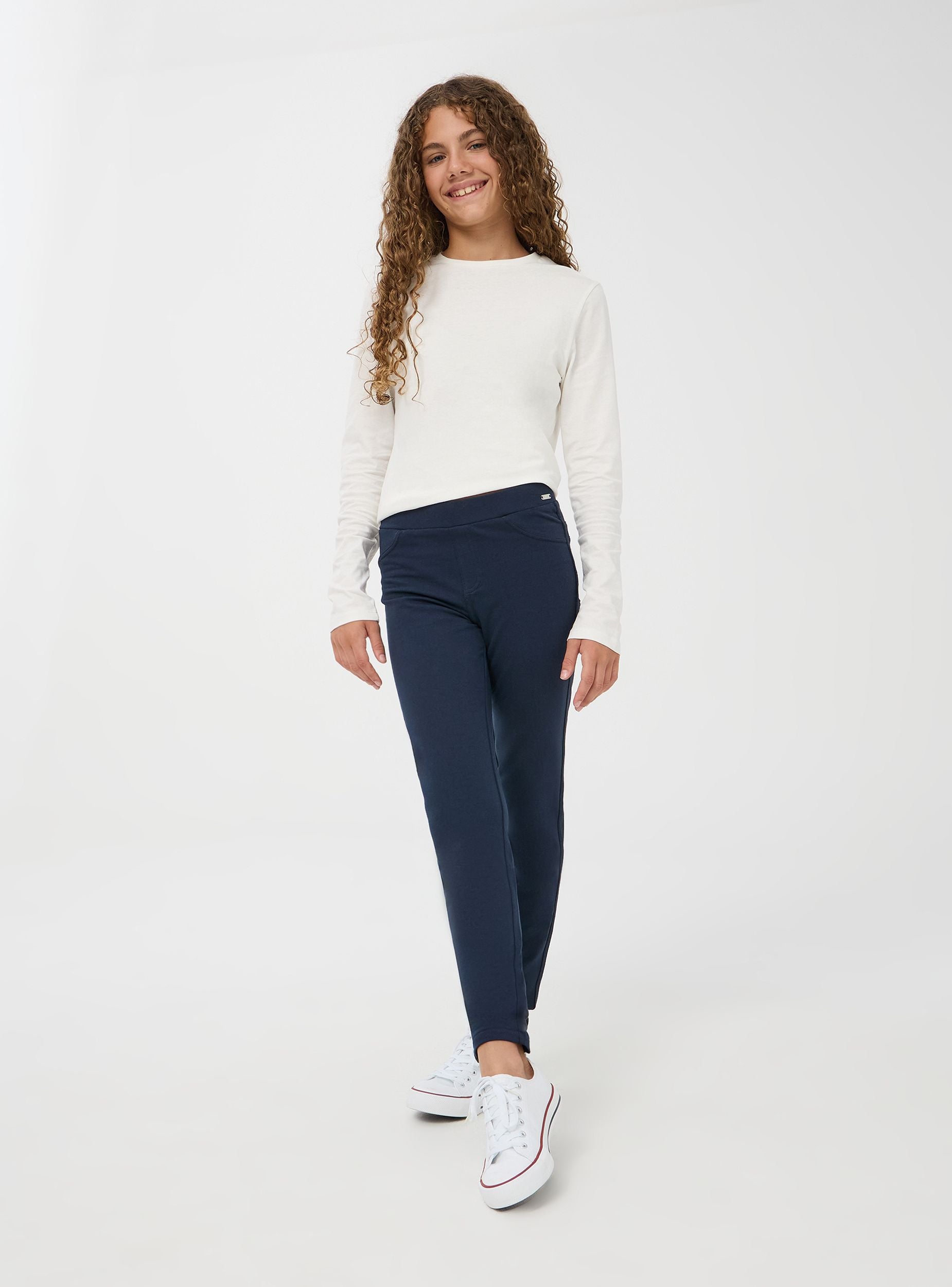 Jeggings për vajza të bëra nga pambuku elastik, ideale për komoditet maksimal. Pëlhura e lehtë në french terry. Kanë një përshtatje të ngushtë që thekson figurën. Të përshtatshme për raste të rastësishme, shëtitje ose momente relaksimi.Detajet