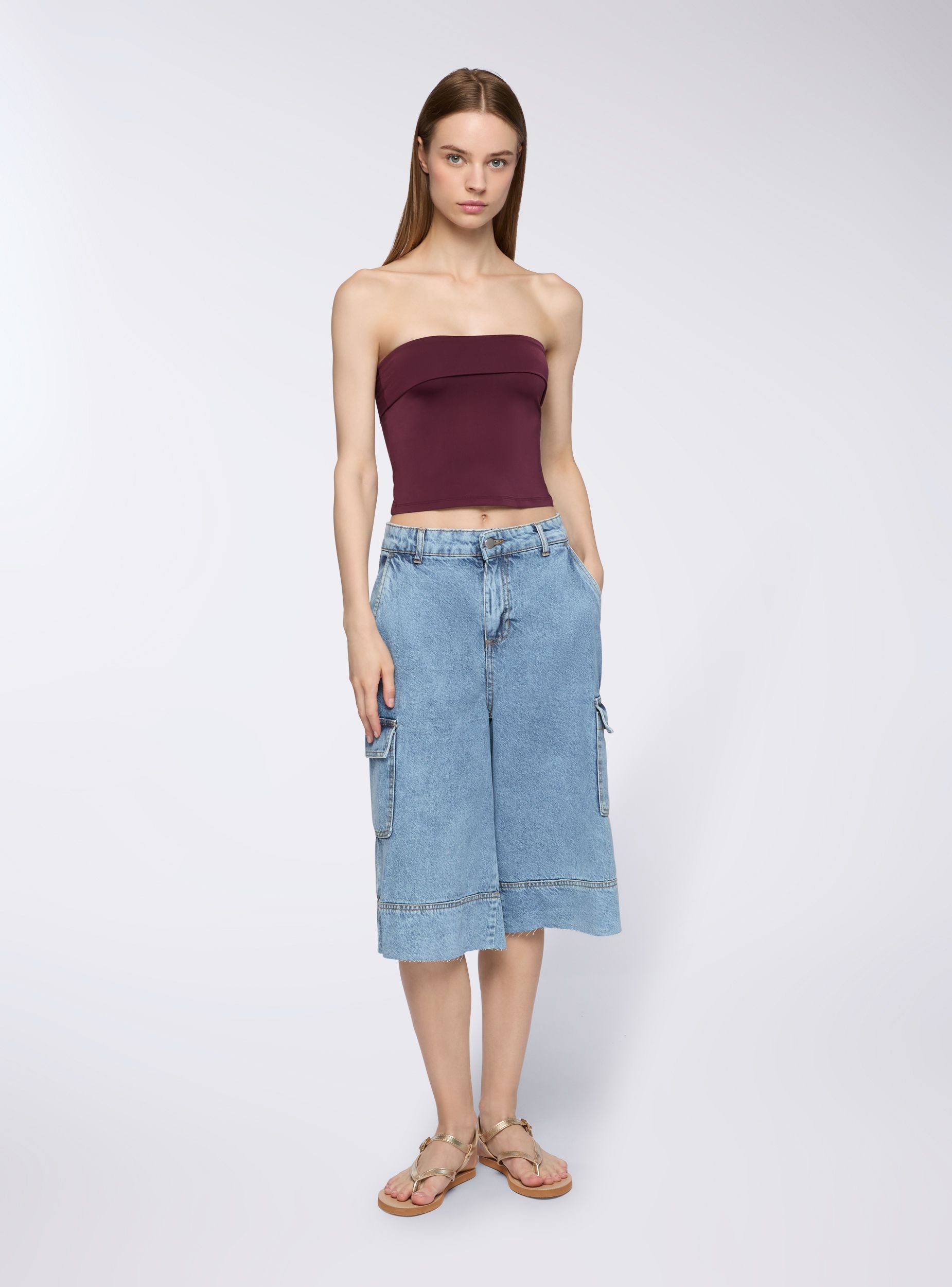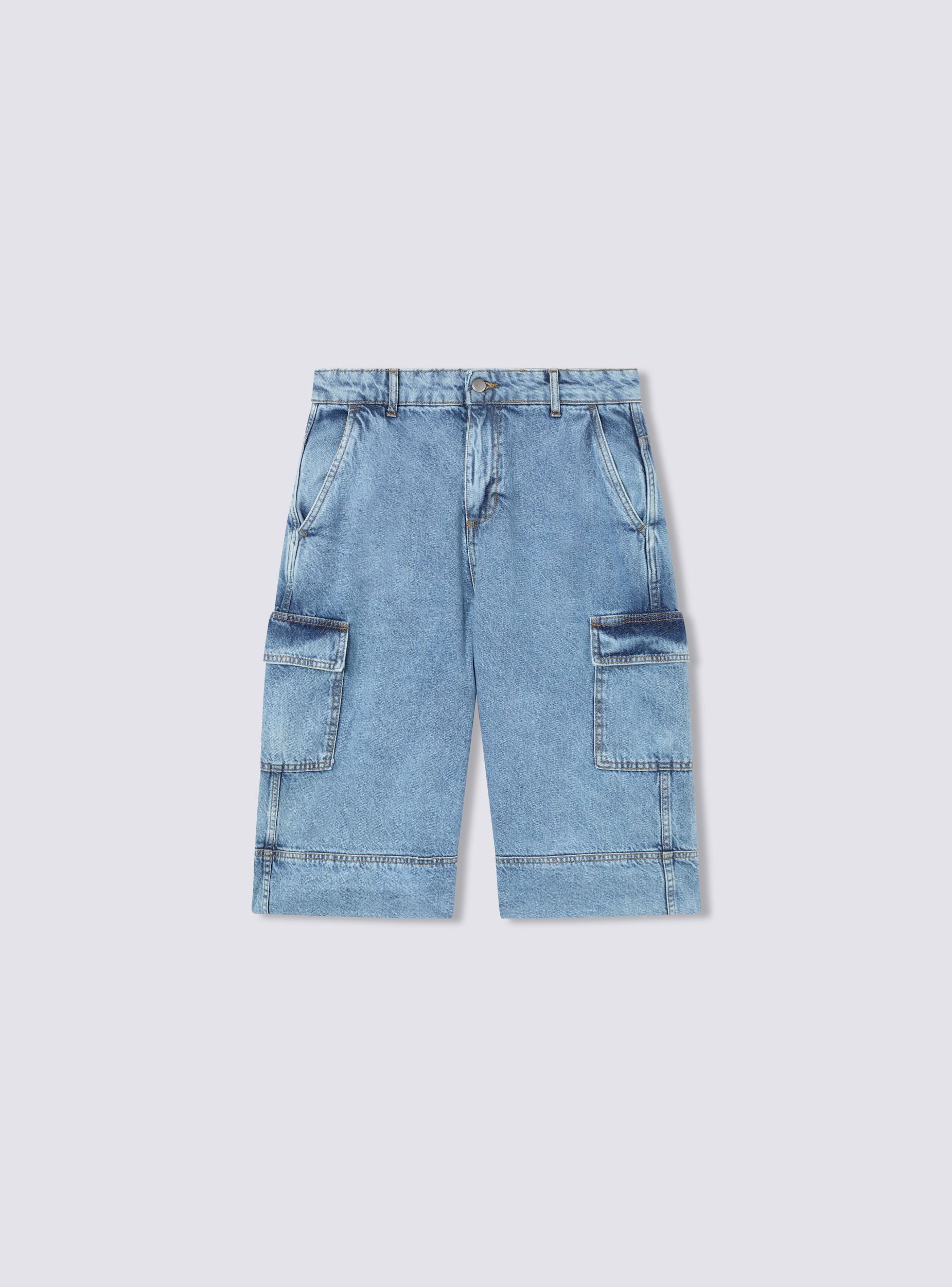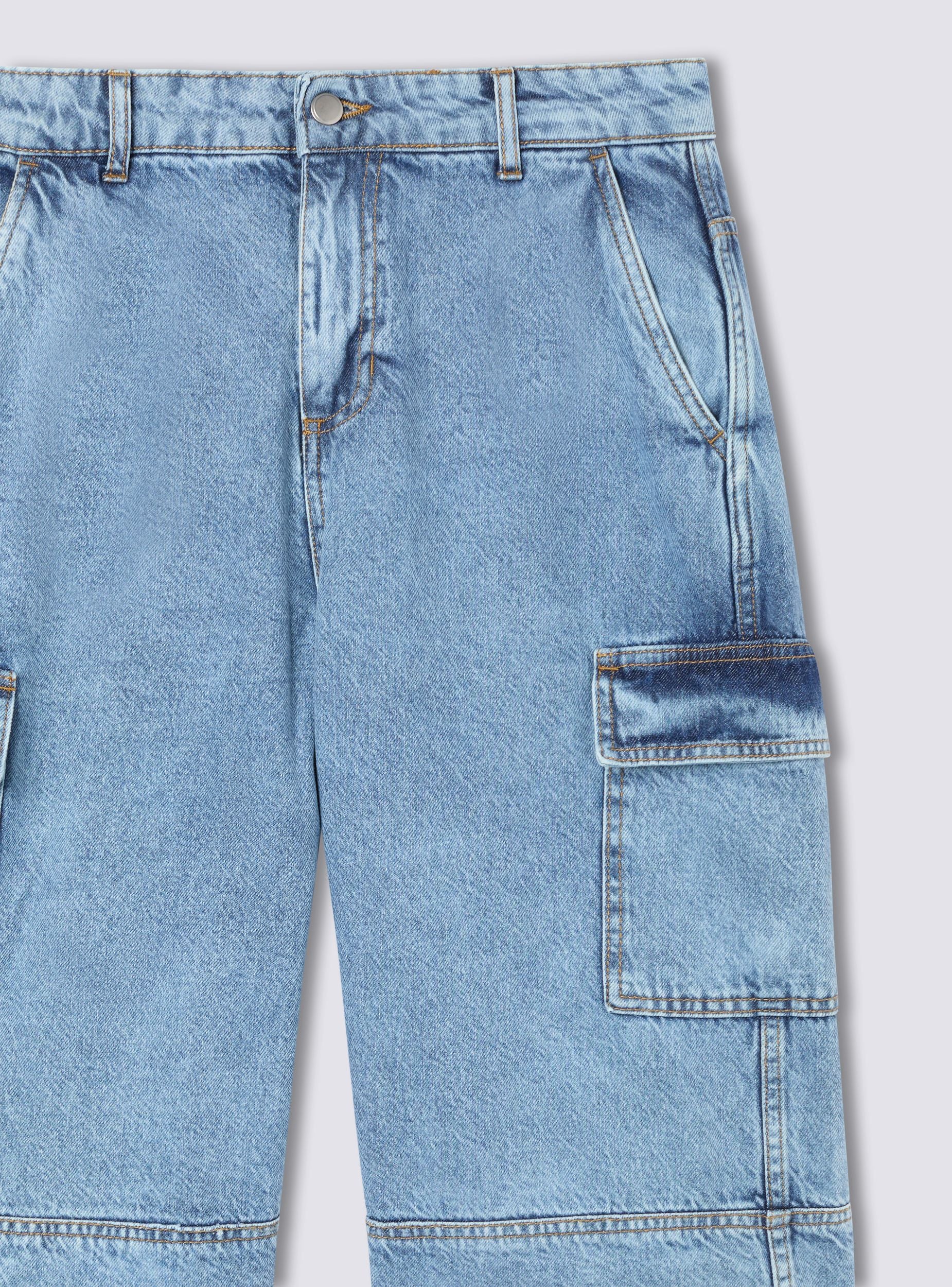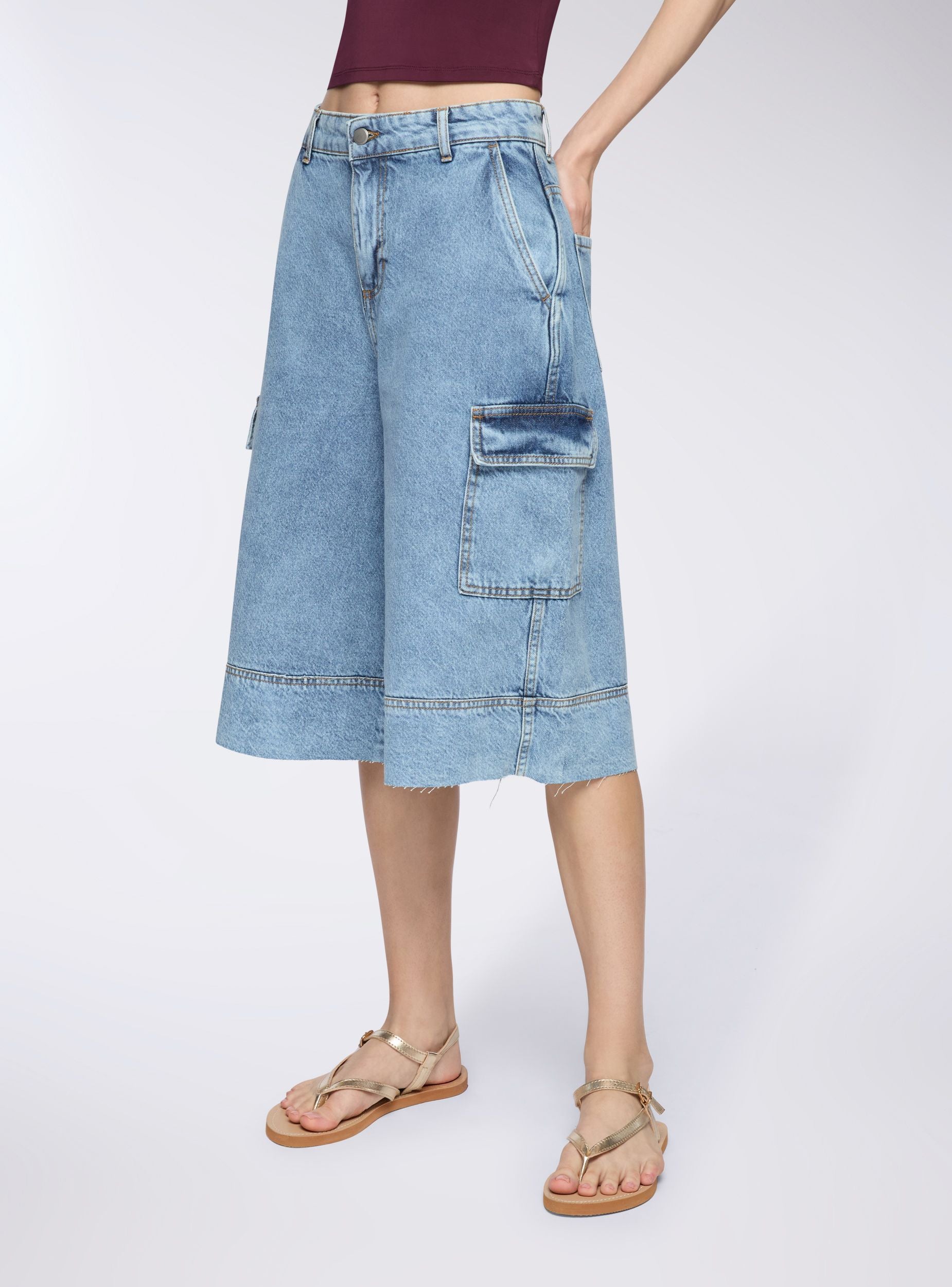 Pantallona të shkurtra xhins për femra me dizajn cargo dhe xhepa anësorë. Ideale për një look casual dhe modern, të përshtatshme për kombinime me t-shirt dhe atlete. Përshtatje e gjerë dhe e rehatshme, me mbyllje me buton dhe zinxhir. Një veshje shumëfunksionale për kohën e lirë dhe ditët e verës.Detajet