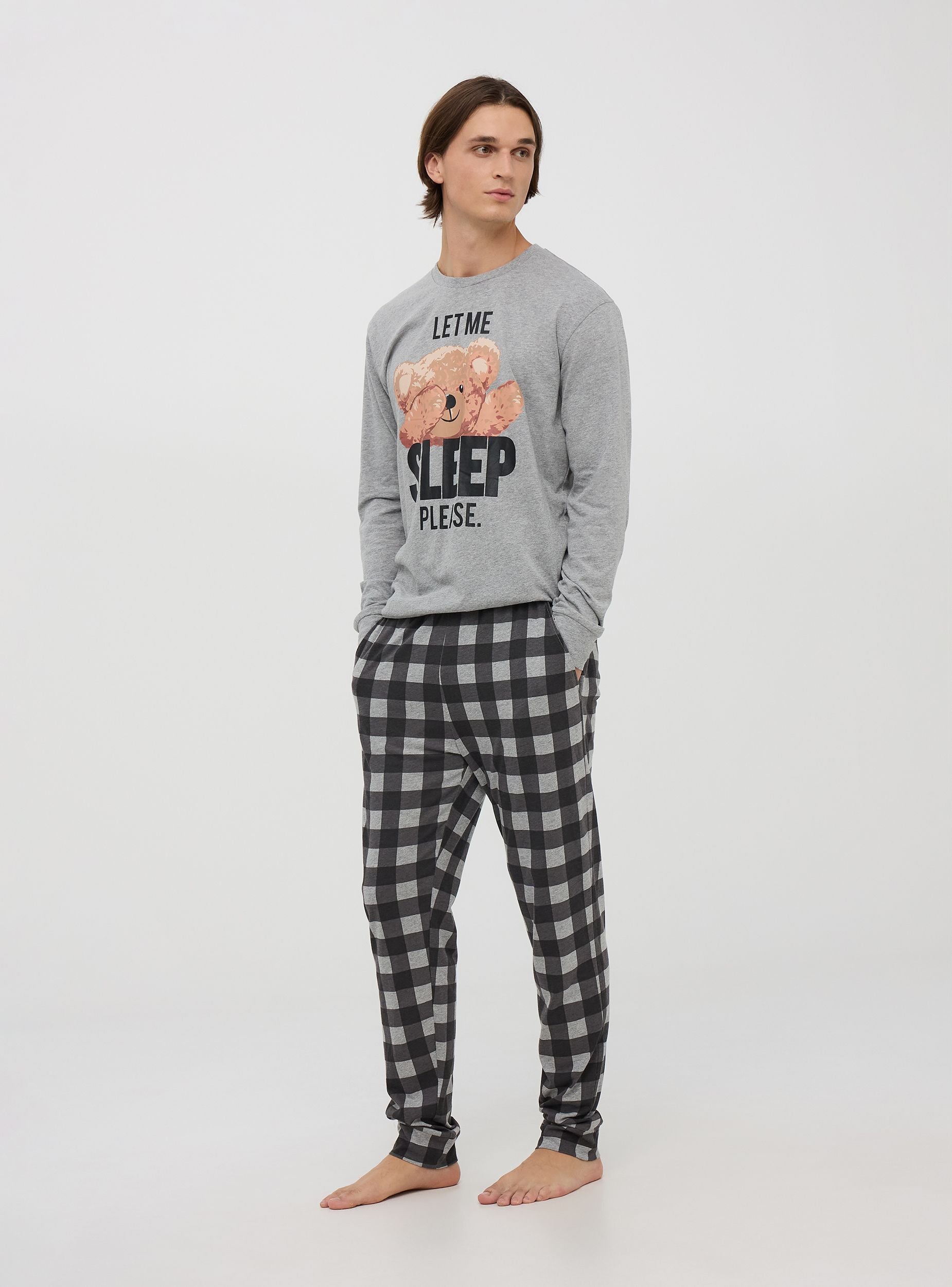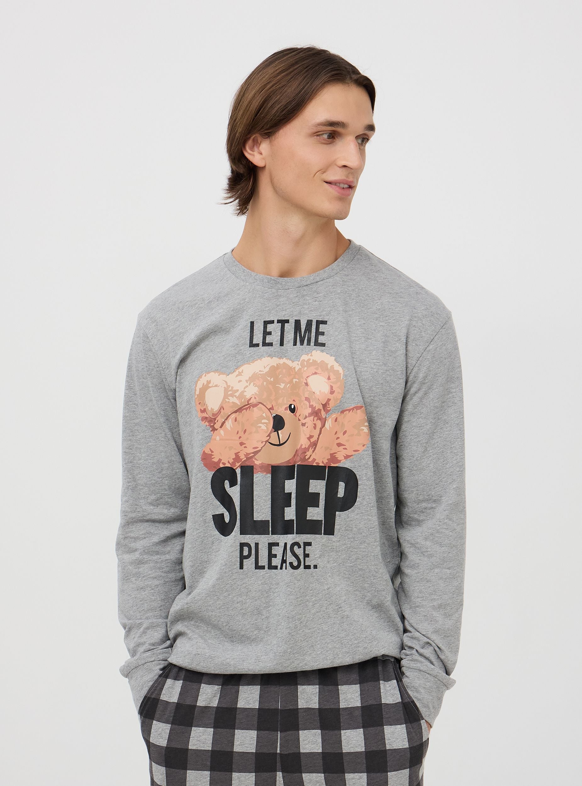 Pijamë për burra e përbërë nga një bluzë me mëngë të gjata dhe pantallona të gjata. Bluzja ka një printim frontal me një arush dhe shkrimin "Let me sleep, please." Pantallonat kanë një motiv me katrorë, duke shtuar një prekje stili në komplet. E bërë nga një stof i butë dhe të rehatshëm, është ideale për të garantuar një pushim të qetë dhe të këndshëm.