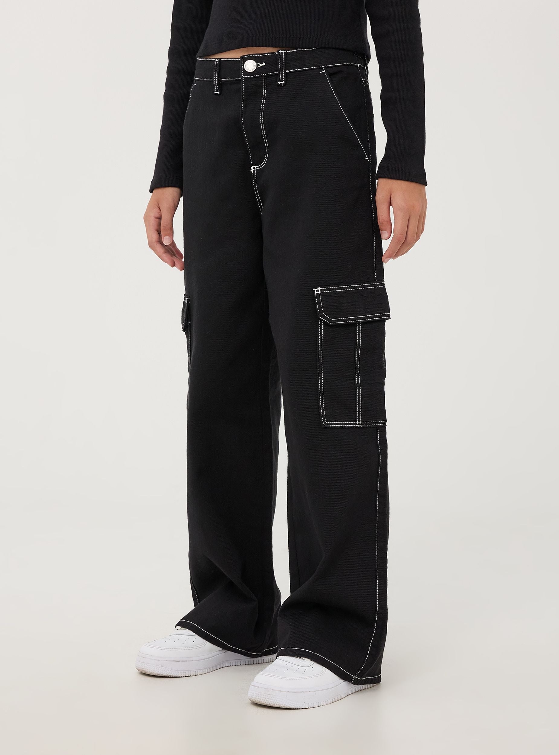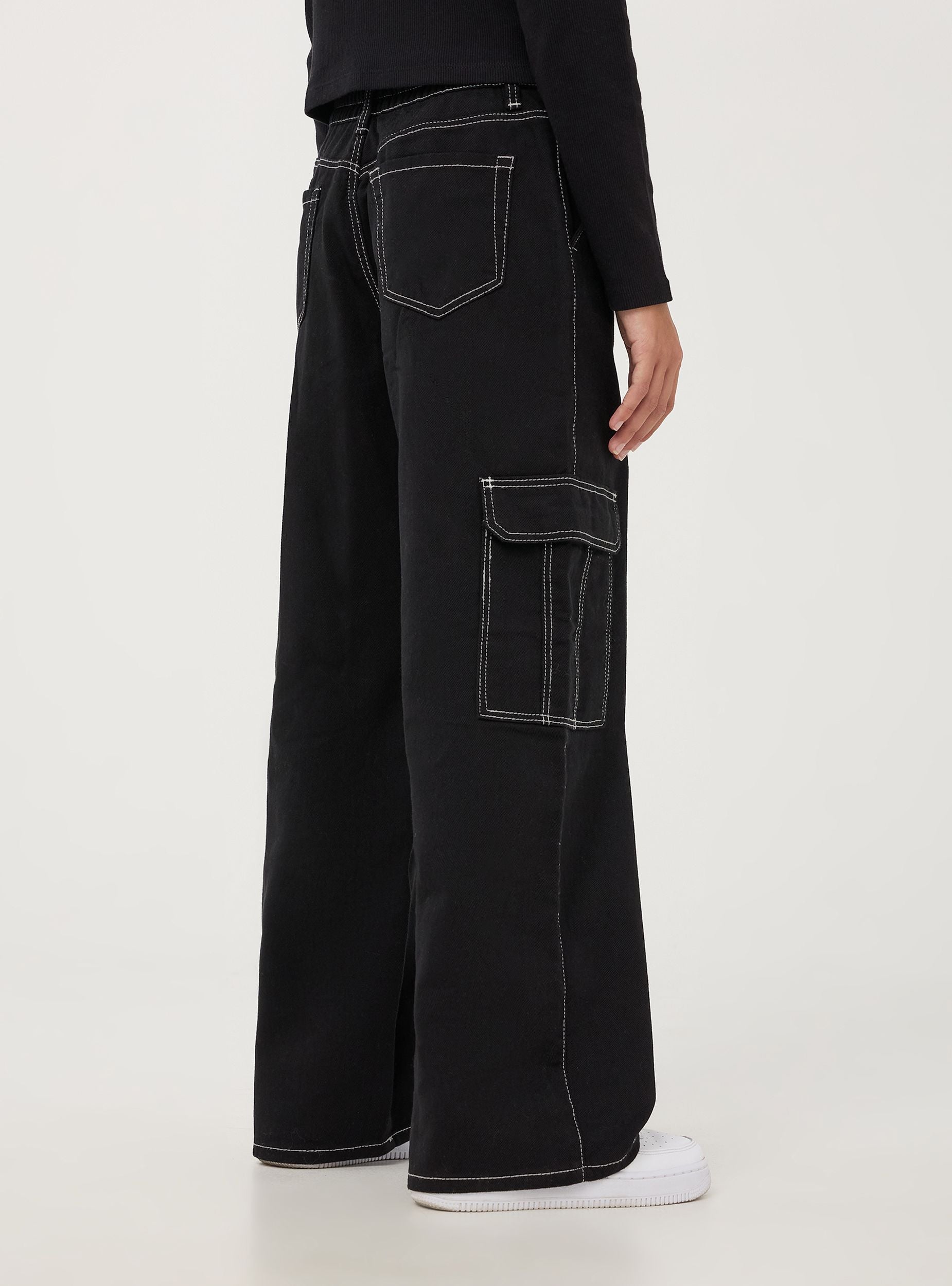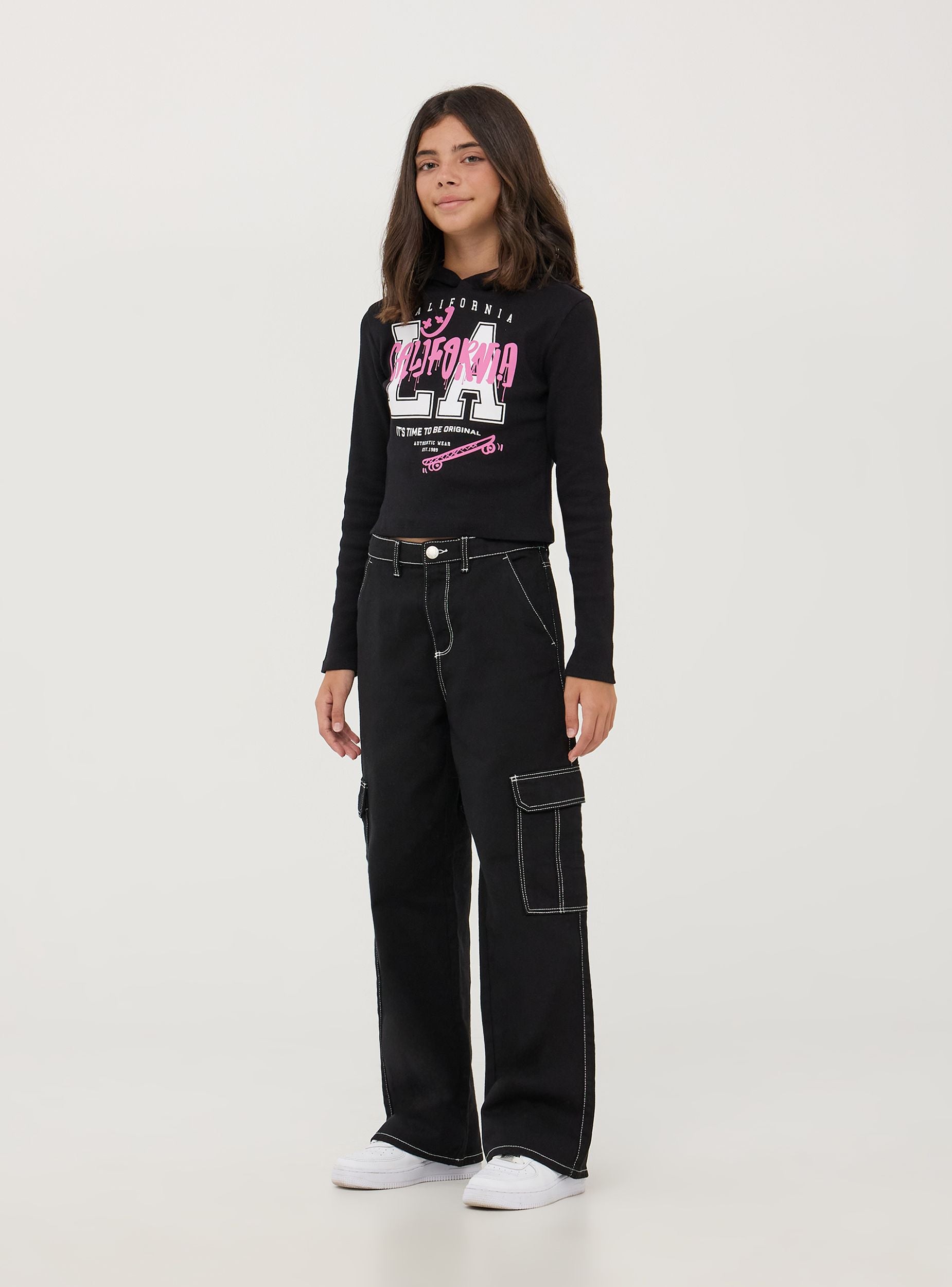 Këto pantallona wide leg cargo për vajza kanë një brez elastik me mbyllje me buton dhe zinxhir. Xhepat cargo anësorë shtojnë një prekje funksionale dhe stilistike. Linja e gjerë e këmbës siguron komfort dhe liri lëvizjeje, ndërsa materiali i qëndrueshëm i bën ato ideale për përdorim të përditshëm. Qepjet e forcuara dhe dizajni modern përfundojnë pamjen e fortë dhe trendi të këtyre pantallonave.Detajet