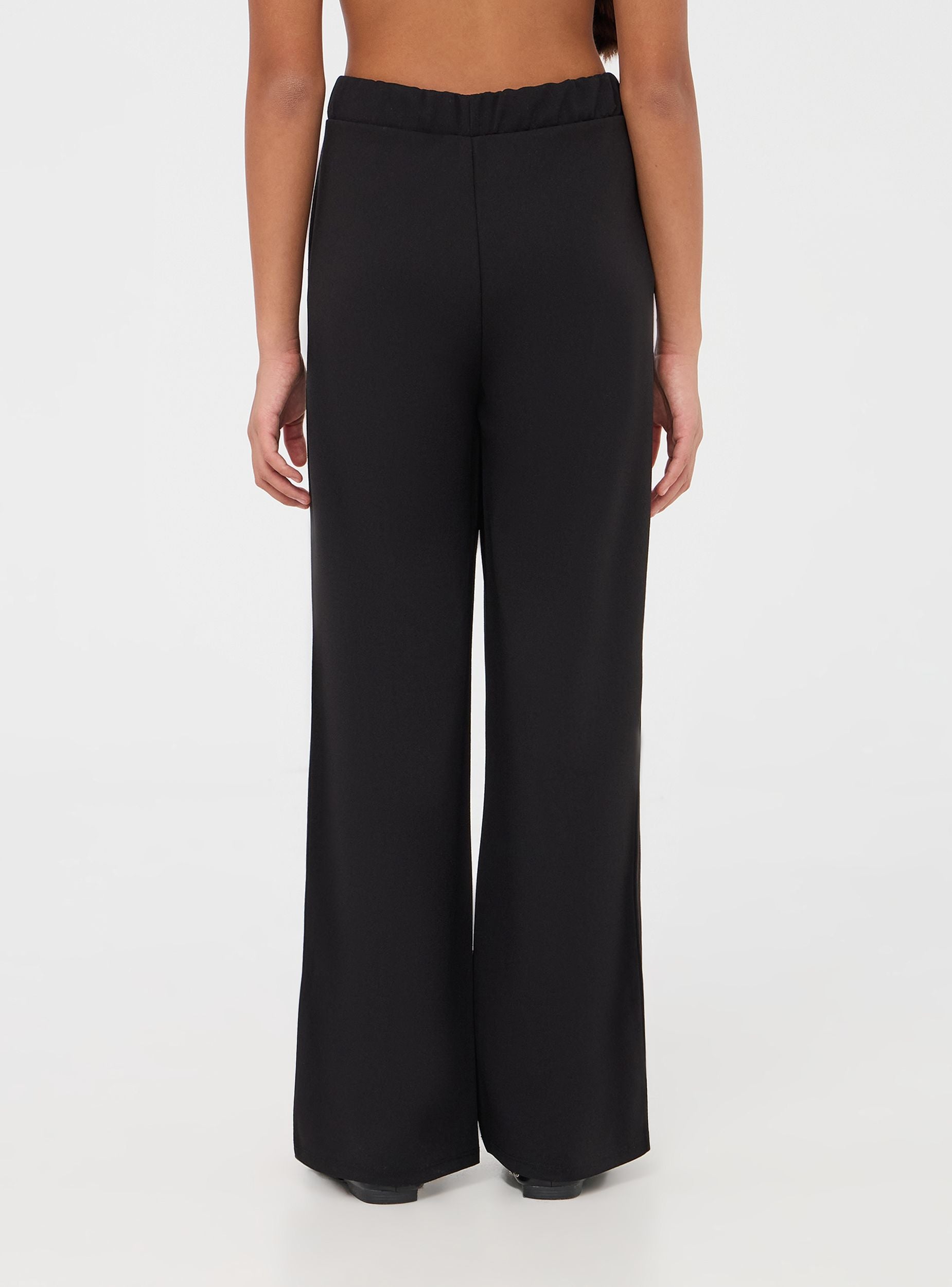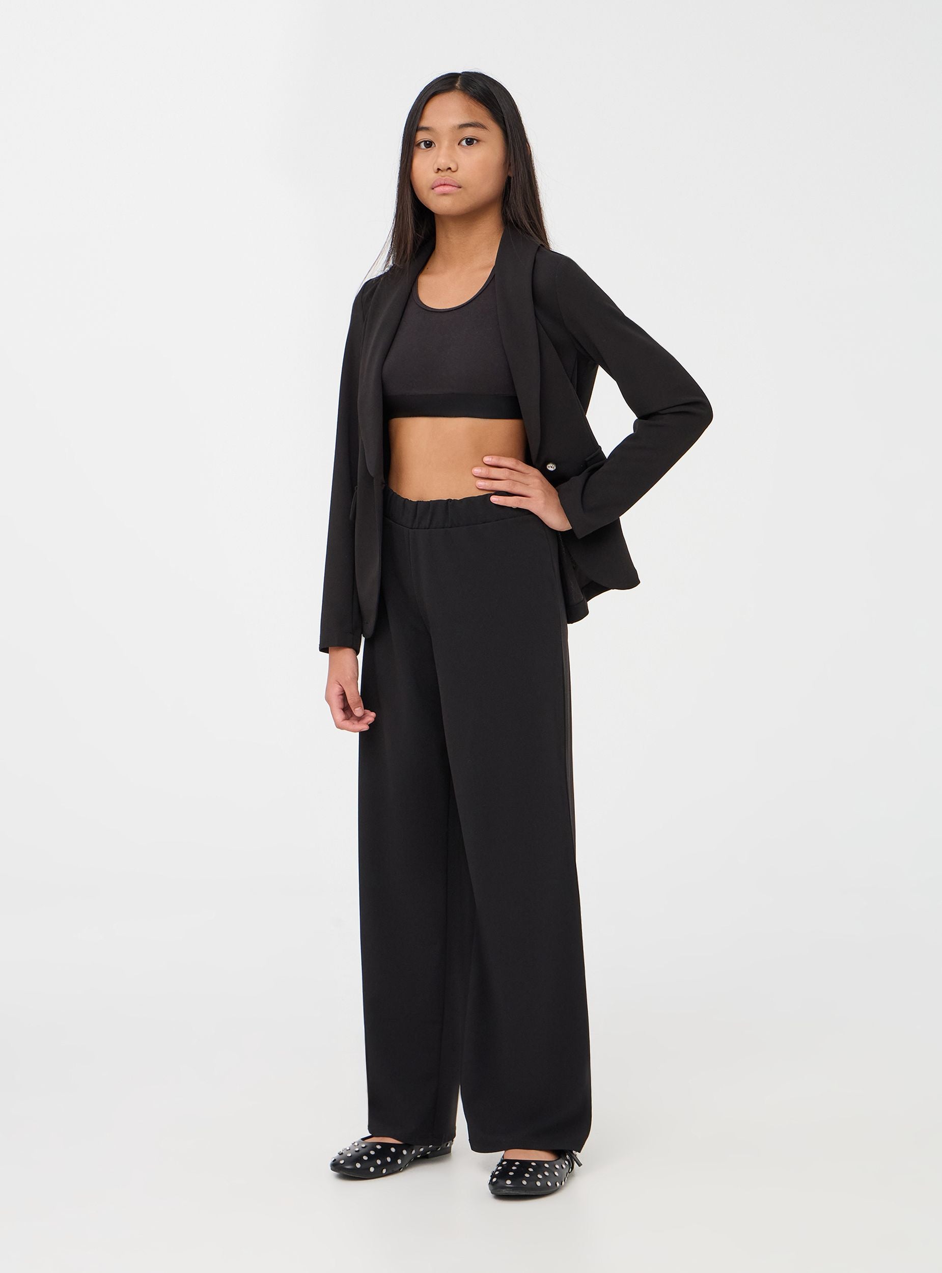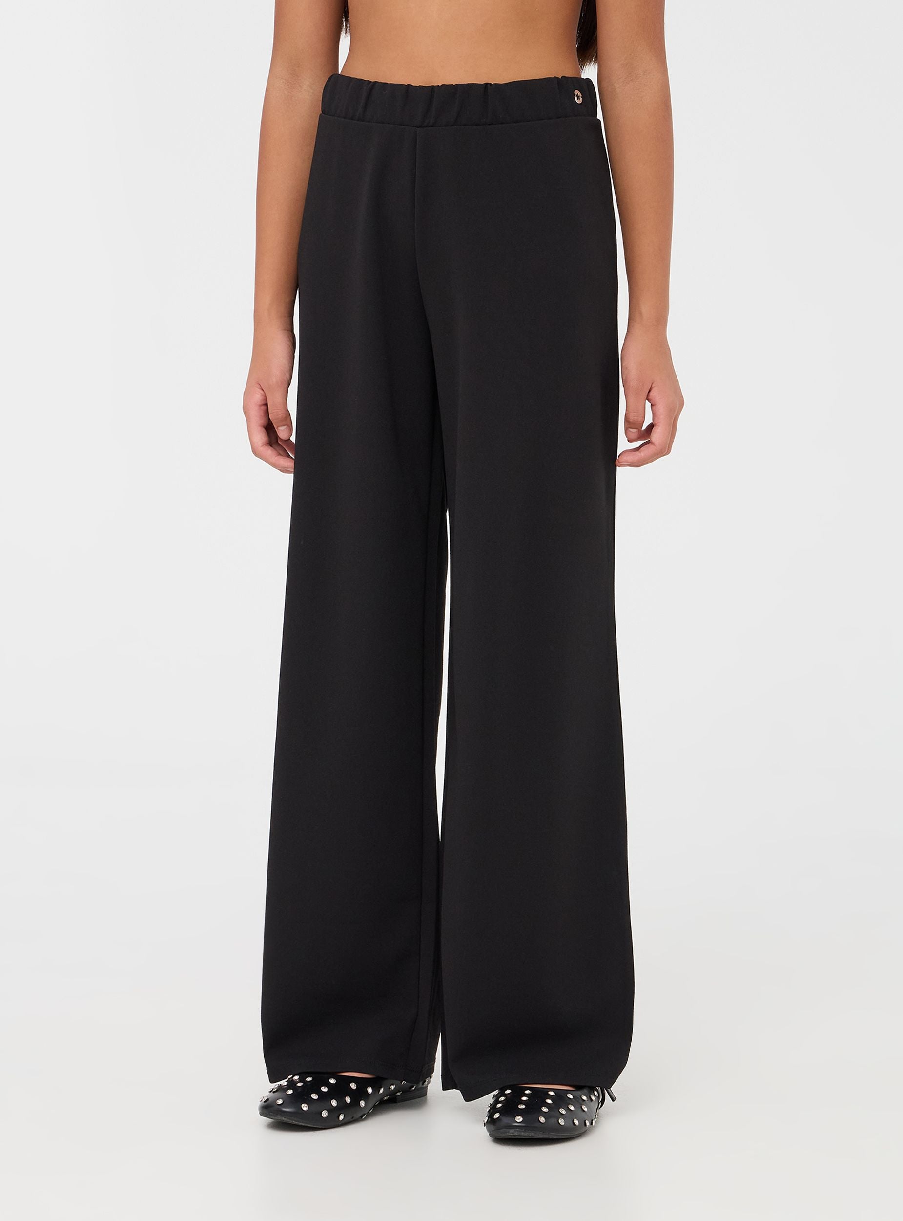 Pantallona për vajza me këmbë të gjera të realizuara në një tekstil scuba me ngjyrë të njëtrajtshme. Dizajni i tyre minimaliste përfshin një bel elastik me një aksesor të vogël dekorativ me yll. Përshtatja është e gjerë dhe e lirë, ideale për një pamje të rastësishme. Të përsosura për shkollë ose ditë relaksi, këto pantallona janë të lehta për t'u kombinuar me t-shirt, sweatshirts ose pulovra.Detajet