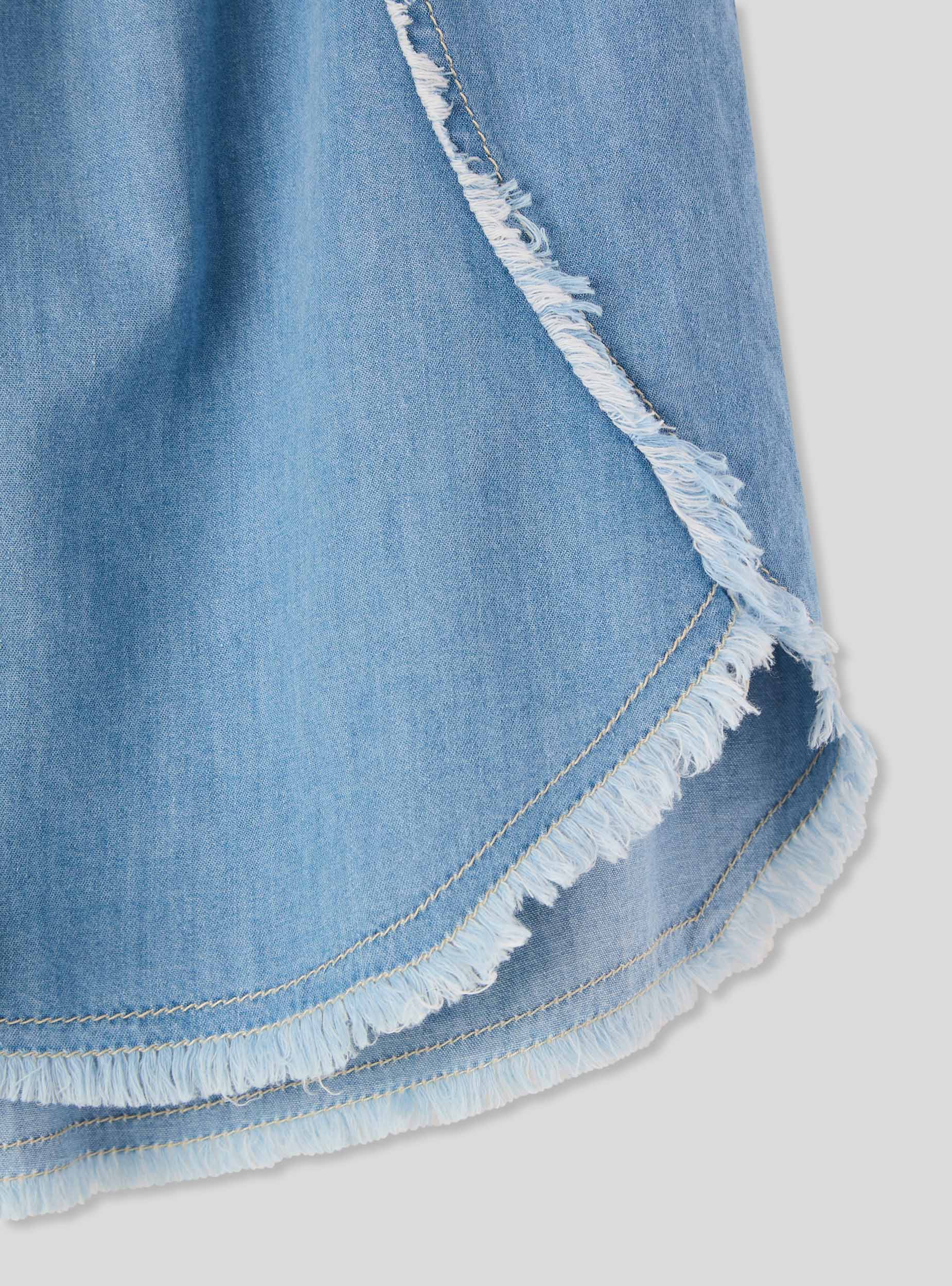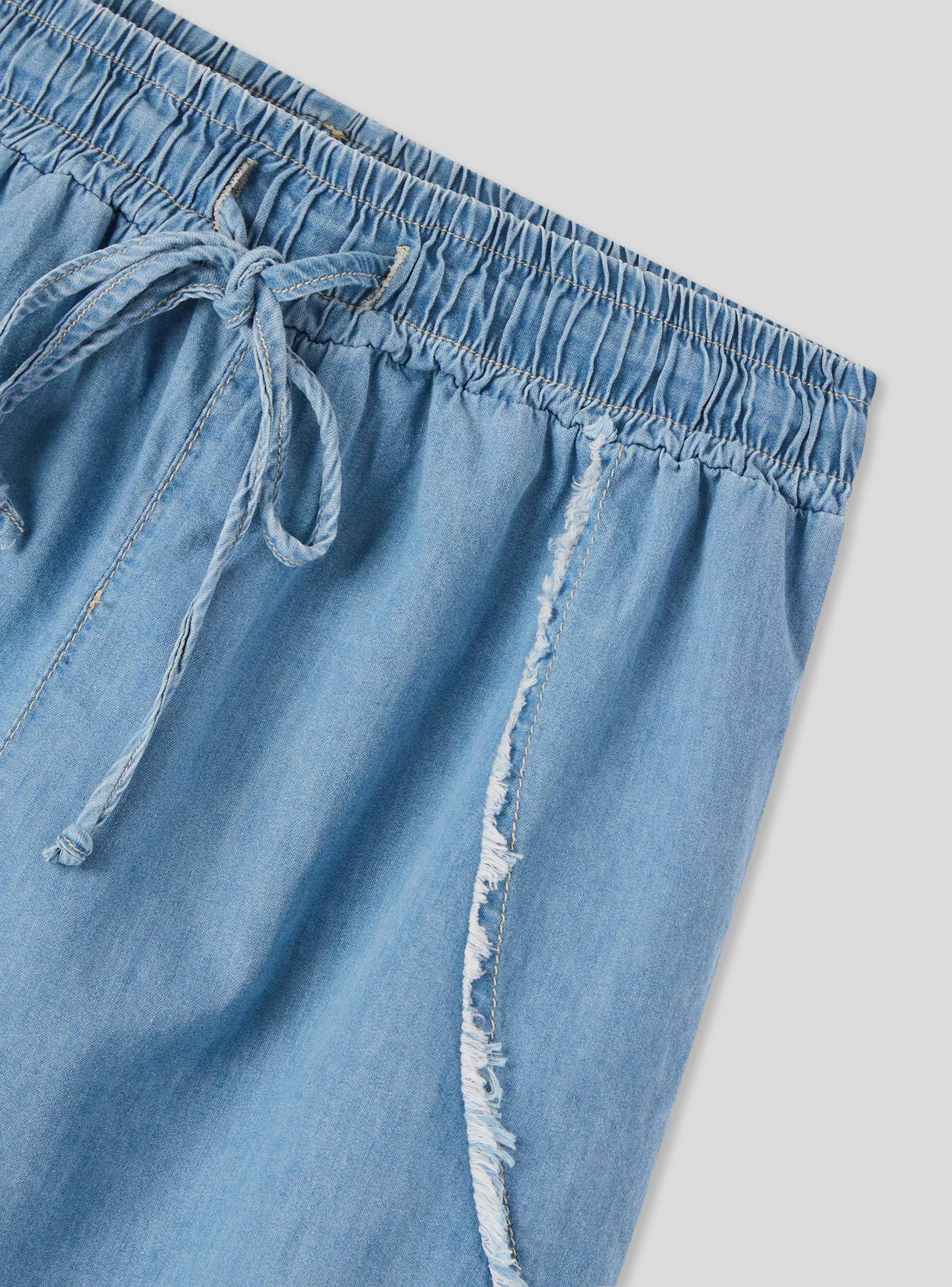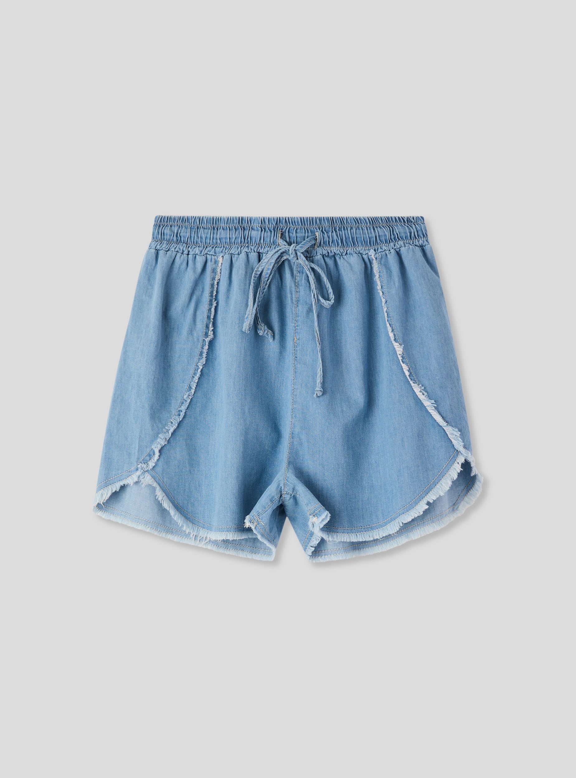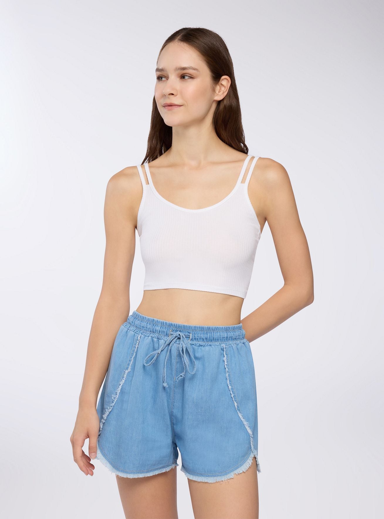 Pantallona të shkurtra për femra në stil casual, ideale për ditë vere dhe të relaksuara. Kanë një fije në bel për një përshtatje të rregullueshme dhe të rehatshme. Dizajni përfshin detaje të çara përgjatë skajeve, duke shtuar një prekje moderne dhe dinamike. Perfekte për t’u kombinuar me bluzat e lehta dhe sandale për një pamje të freskët dhe joformale.Detajet