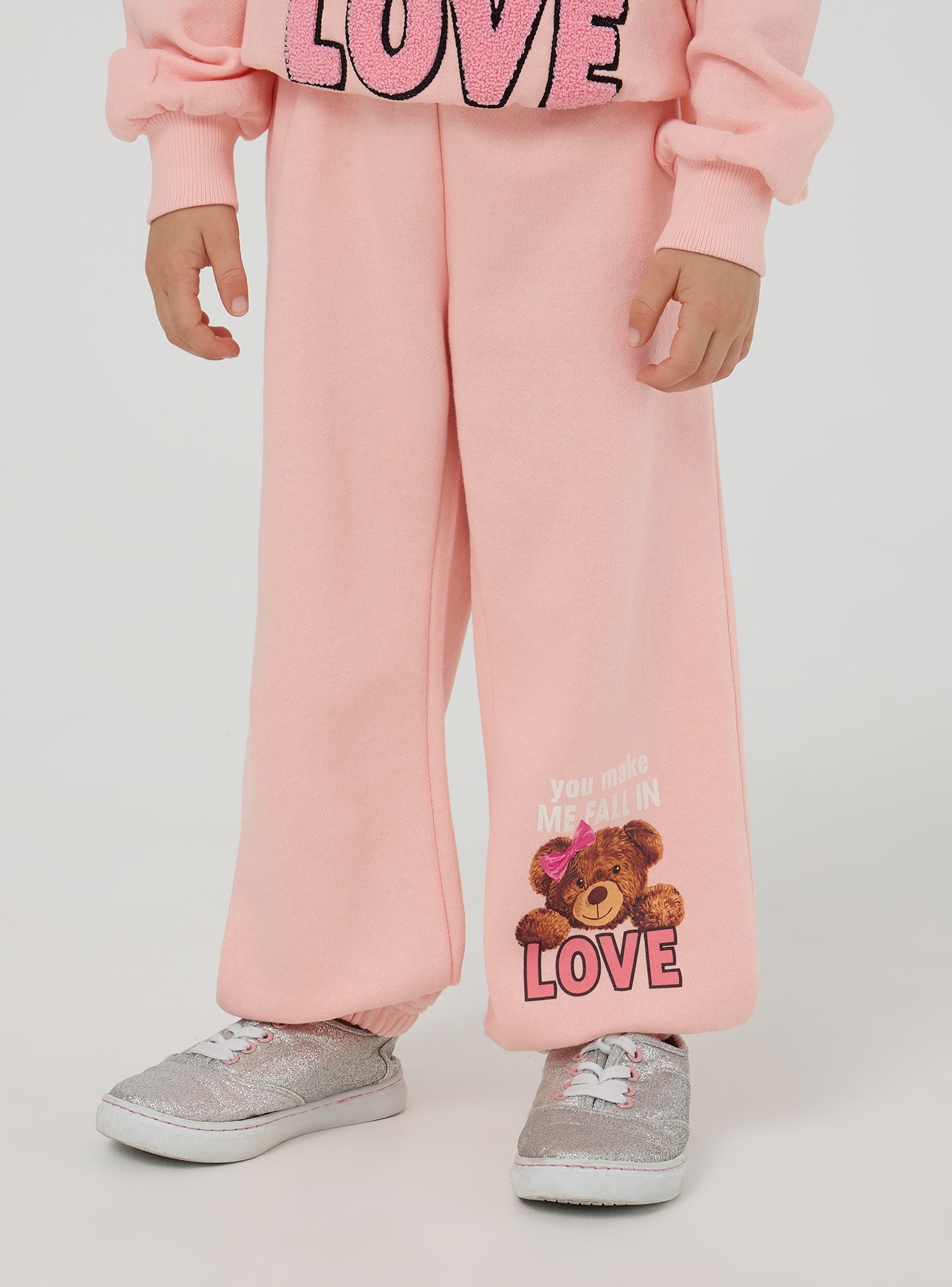 Pantallona të trasha për vajza, perfekte për komoditetin e përditshëm. Të karakterizuara nga një printim të bukur të një ari me mbishkrimin "You make me fall in love" në këmbë, këto pantallona kanë një brez elastik dhe funde për një përshtatje komode dhe të sigurt. Ideale për raste të rastësishme dhe momente loje, këto pantallona bashkojnë stilin dhe komoditetin.Detajet
