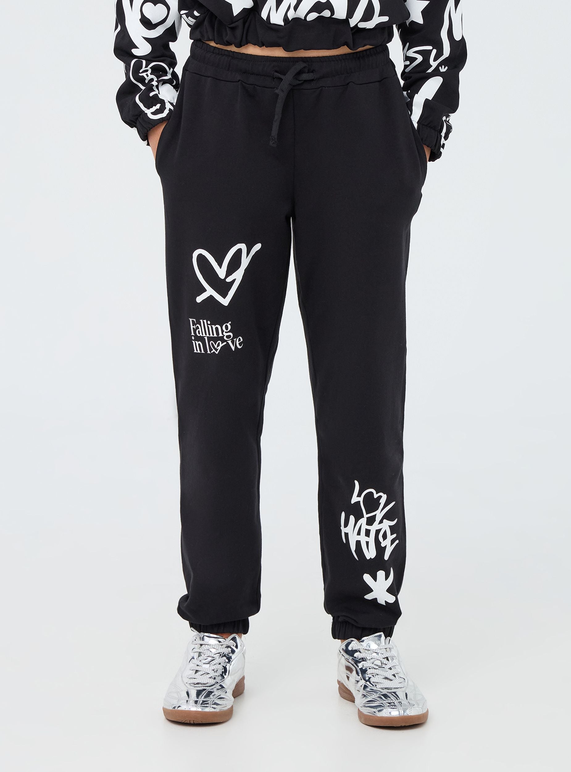 Pantallona të tuta për vajza me printim graffiti. Të përsosura për veshje urban dhe sportive. Përshtatje normale.Detajet