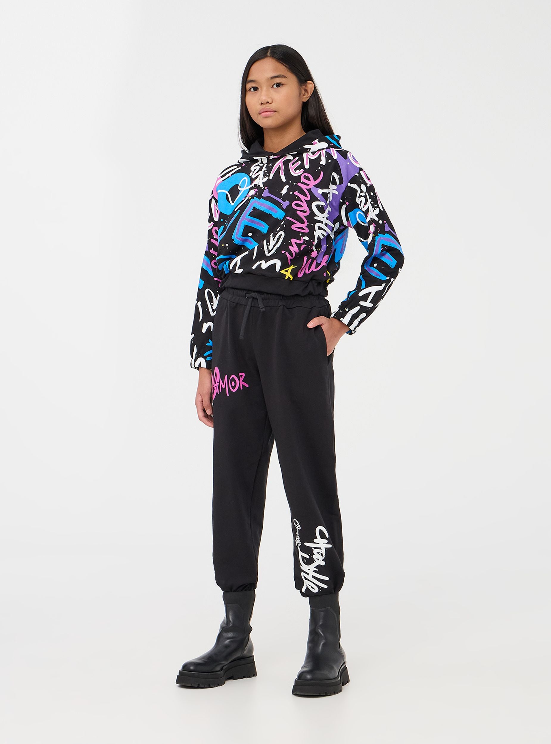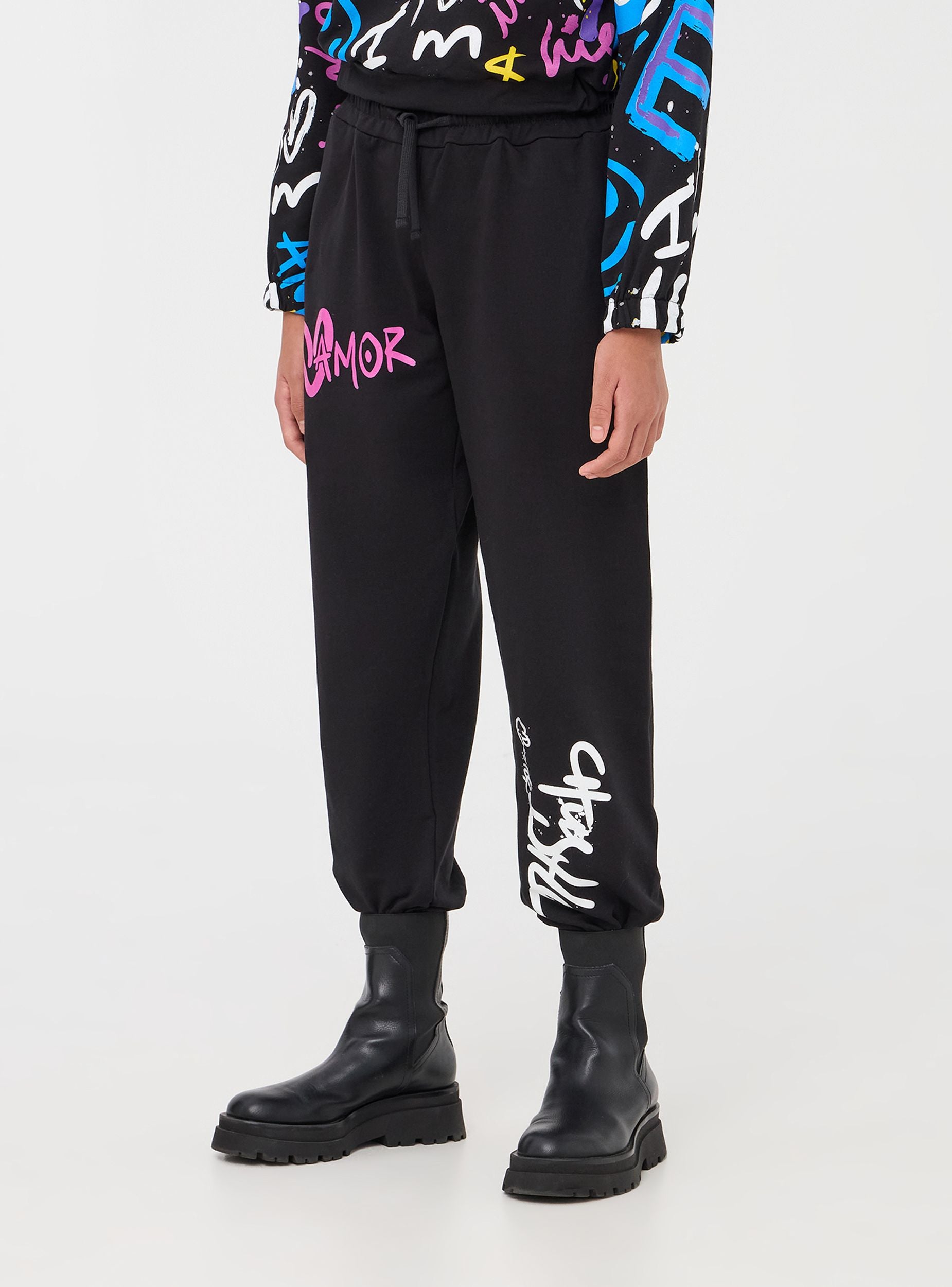Pantallona për vajza në stof elastik me printim në stilin graffiti. Perfekt për veshje urbane dhe sportive. Përshtatje normale.Detajet