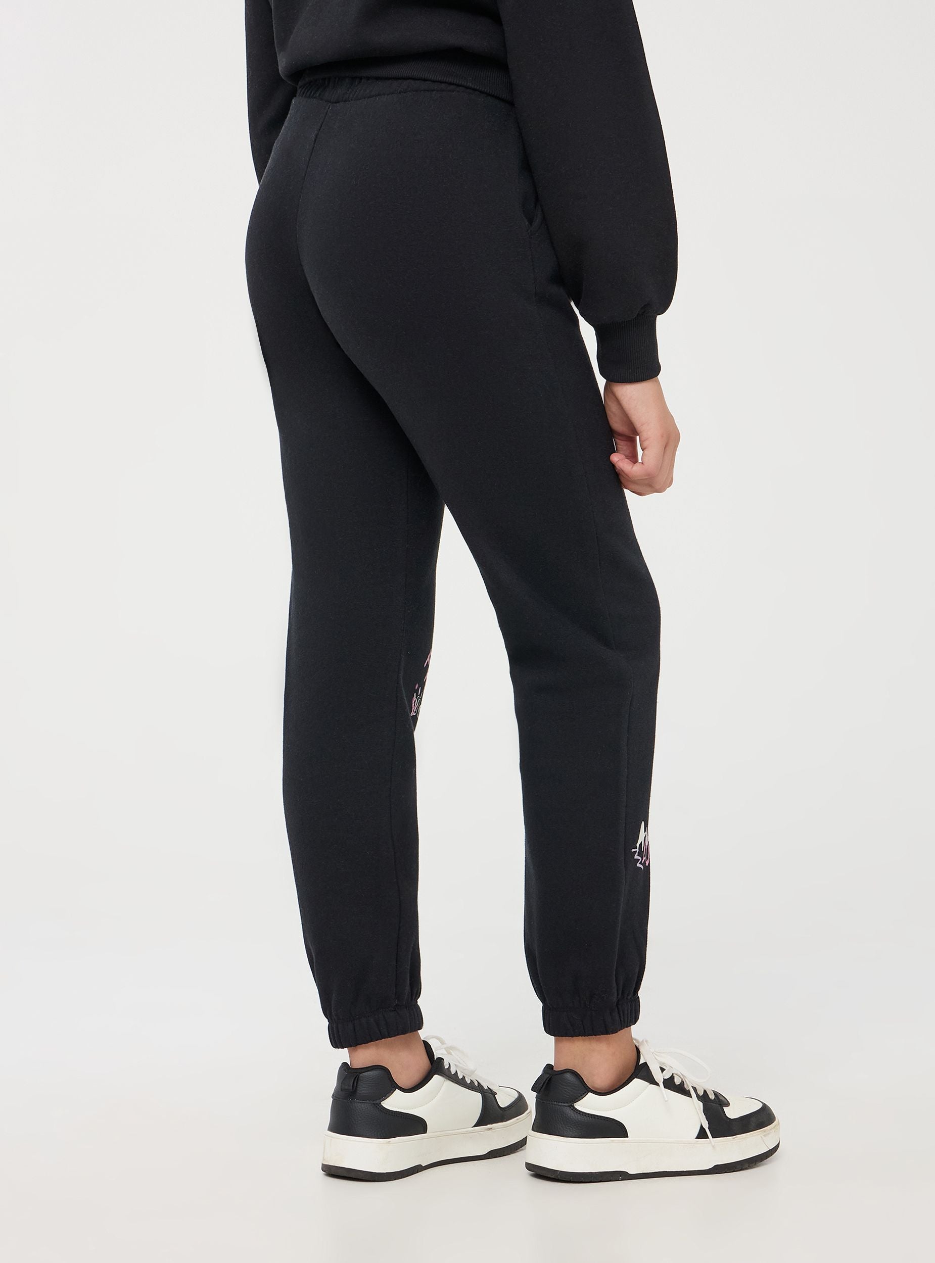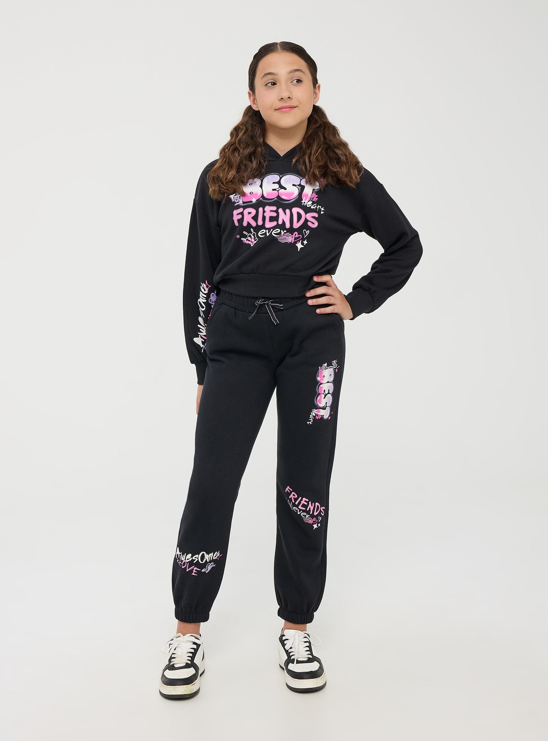 Pantallona të rënda të kostumit për vajza, ofrojnë rehati dhe stil me një përshtatje të rastësishme dhe të relaksuar. Të dekoruara me printime të gjalla graffiti me ngjyra dhe shkronja si "Awesome", "Friends" dhe "Best", këto pantallona kanë një brez elastik me lidhëse, xhepa anësorë dhe skaj të valëzuar në kyçet e këmbëve. Ideale për një pamje të rastësishme dhe moderne, perfekte për kohën e lirë ose raste informale.Detajet