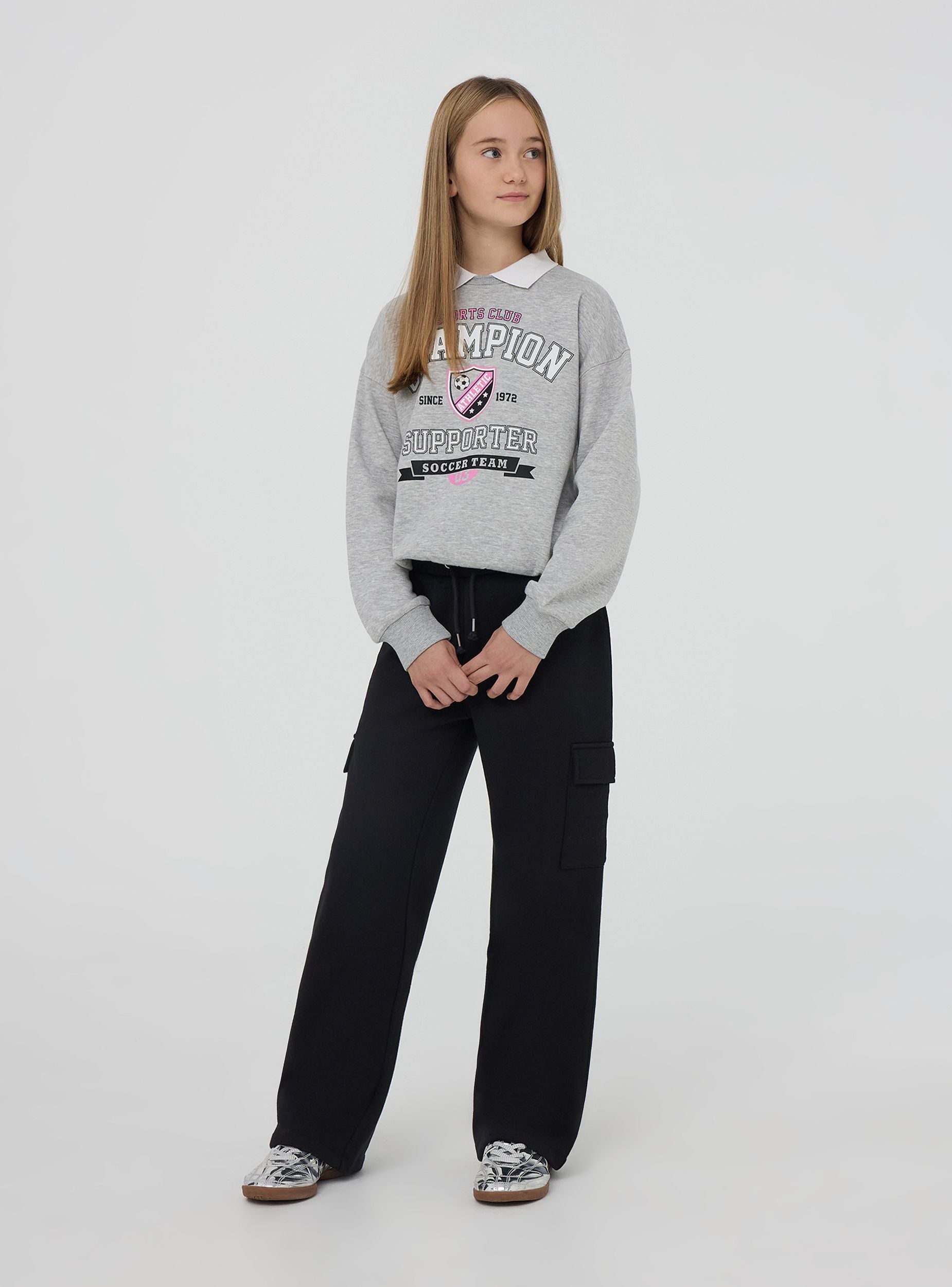 Pantallona të rënda për vajza me këmbë të gjera dhe cargo. Kanë një bel elastik me lidhëse të rregullueshme dhe syze metalike. Xhepat cargo anësorë ofrojnë hapësirë shtesë për sendet personale. Përshtatje komode dhe funksionale.Detajet