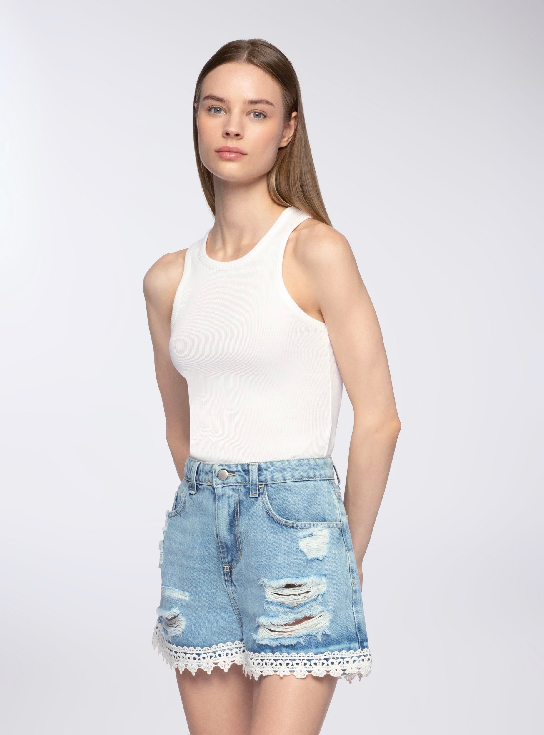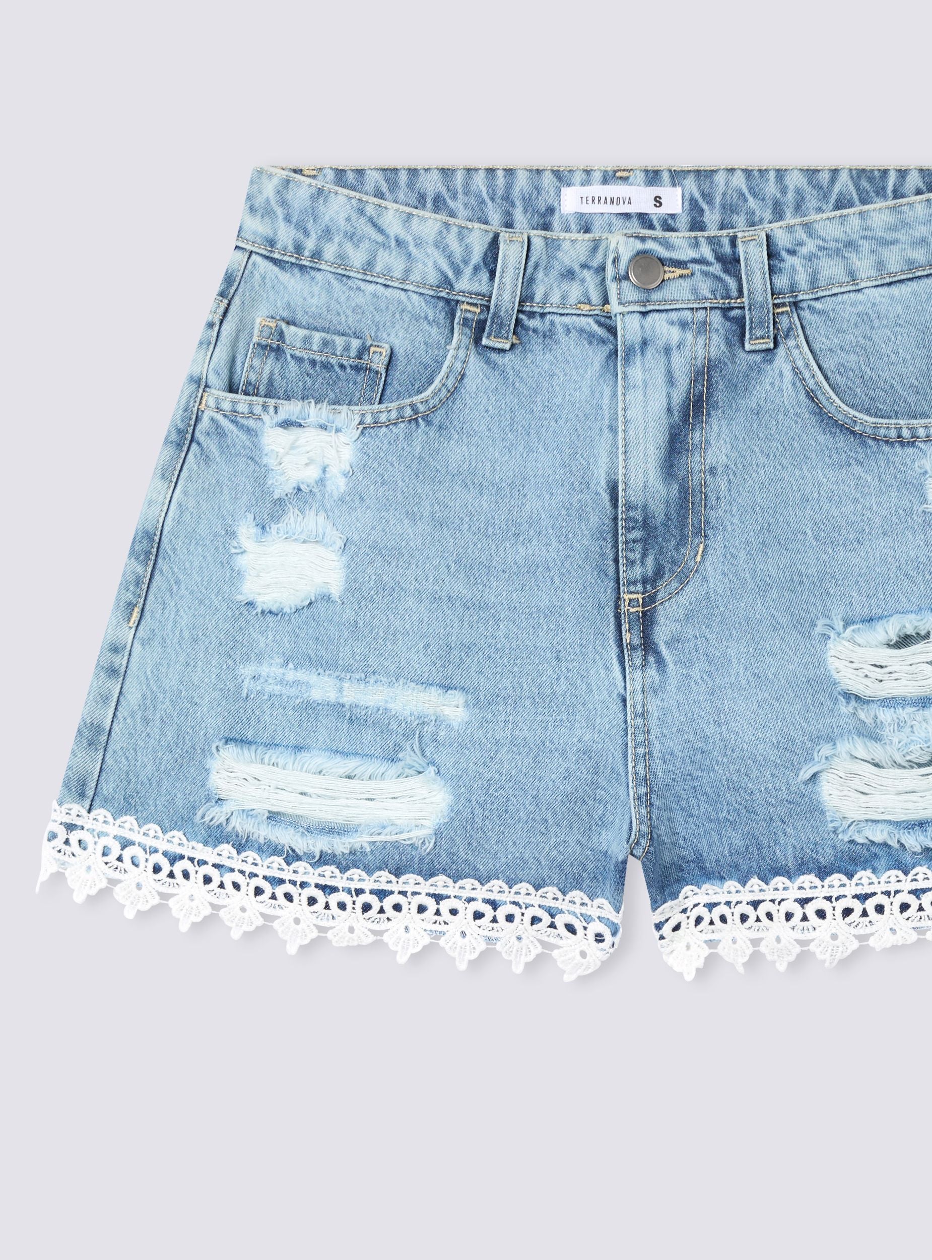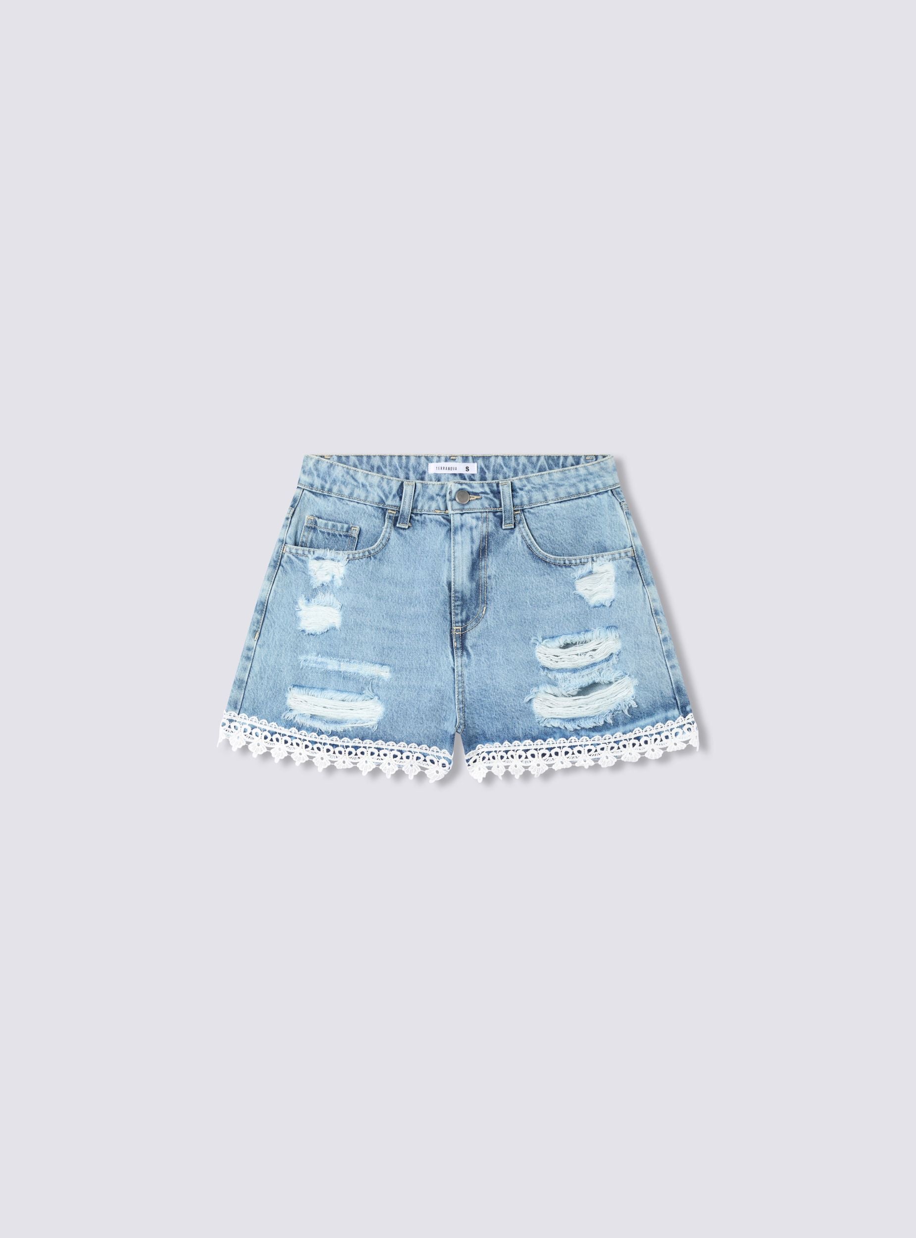 Pantalona të shkurtra për gra me çarje dhe zbukurime sangallo. Ideale për një stil casual dhe modern, këto pantalona të shkurtra kanë detaje me çarje për një prekje të guximshme dhe zbukurime për një prekje femërore. Të përshtatshme për t’u kombinuar me bluzat dhe sandalet për ditët e verës.