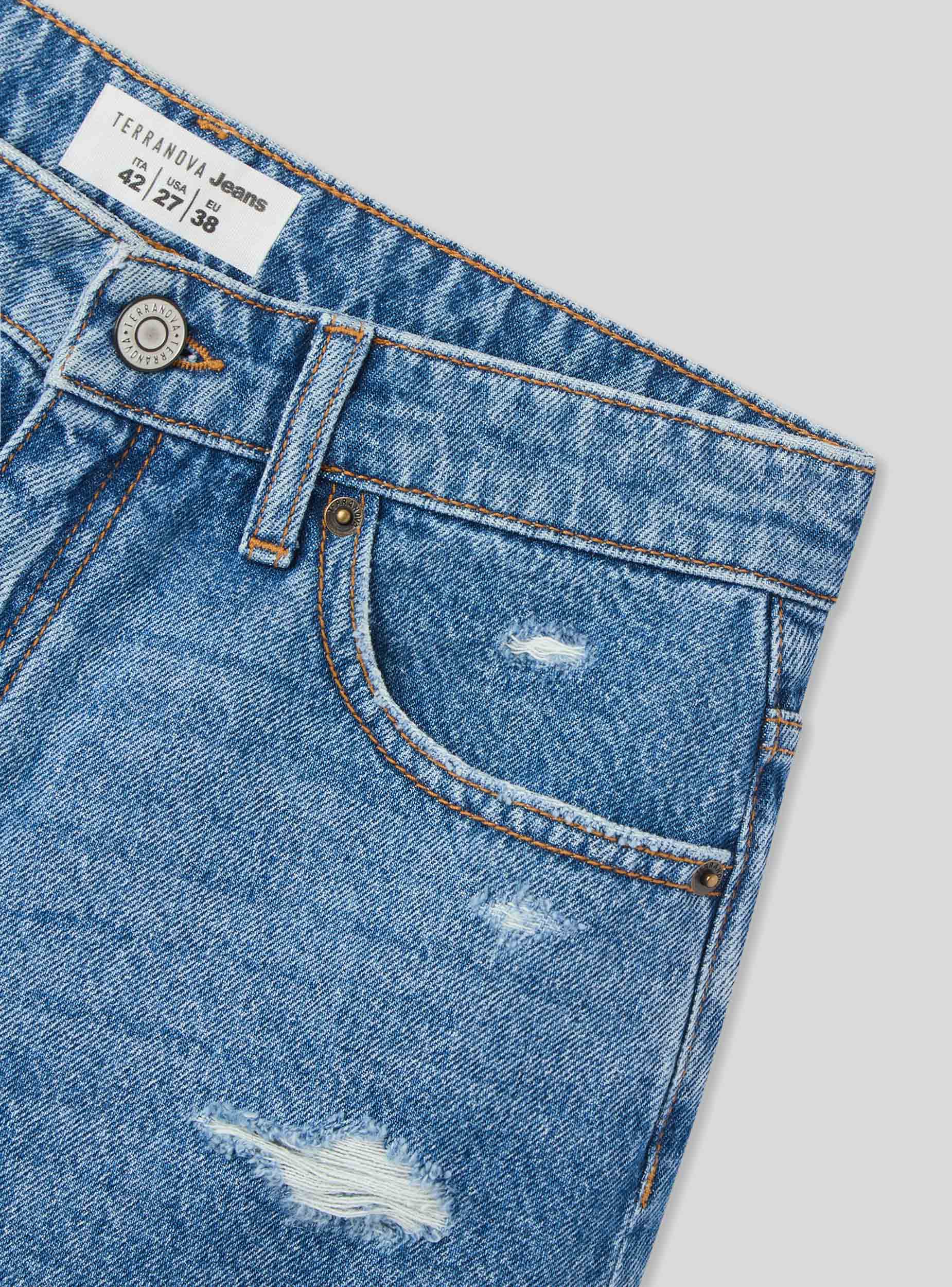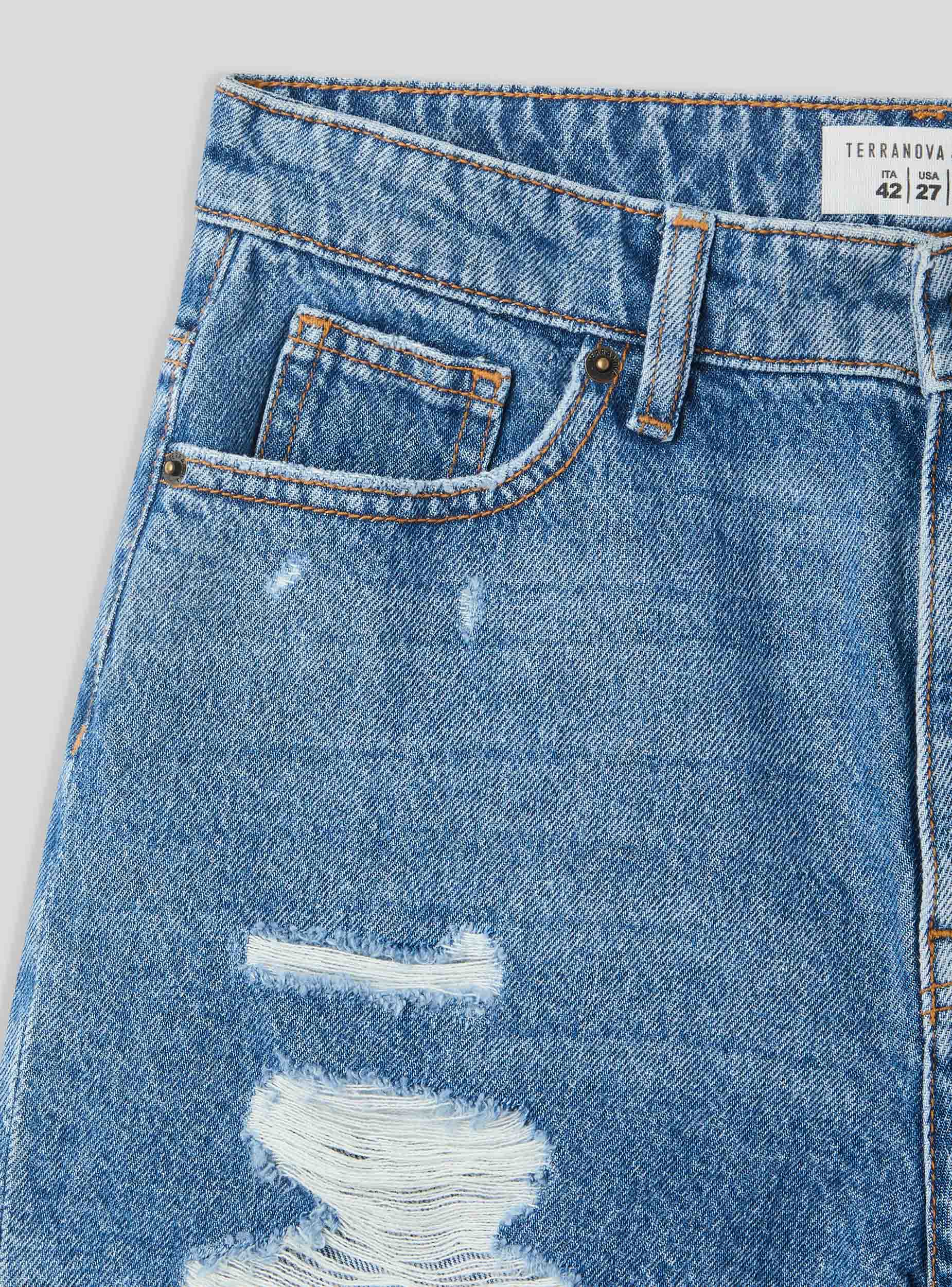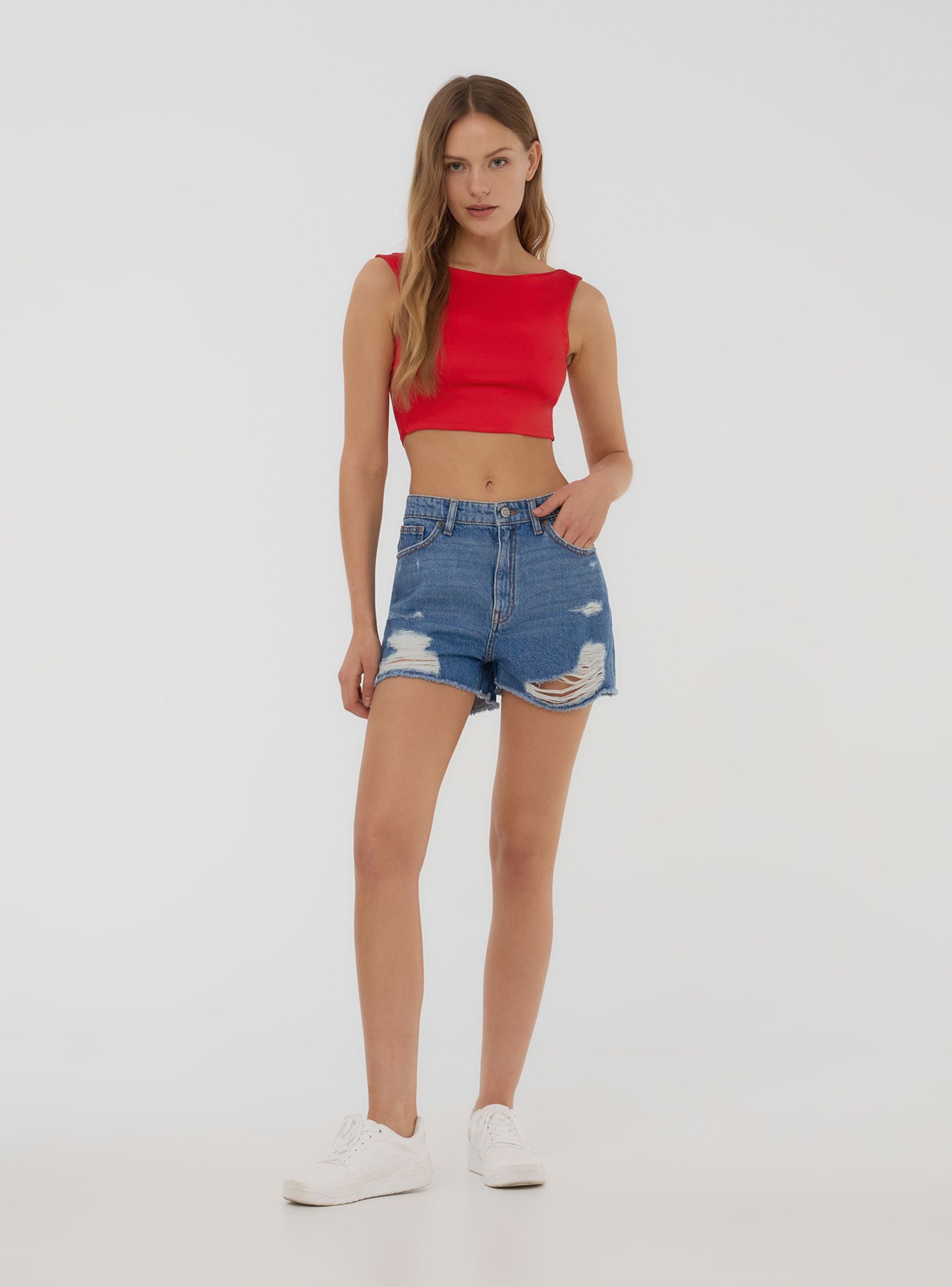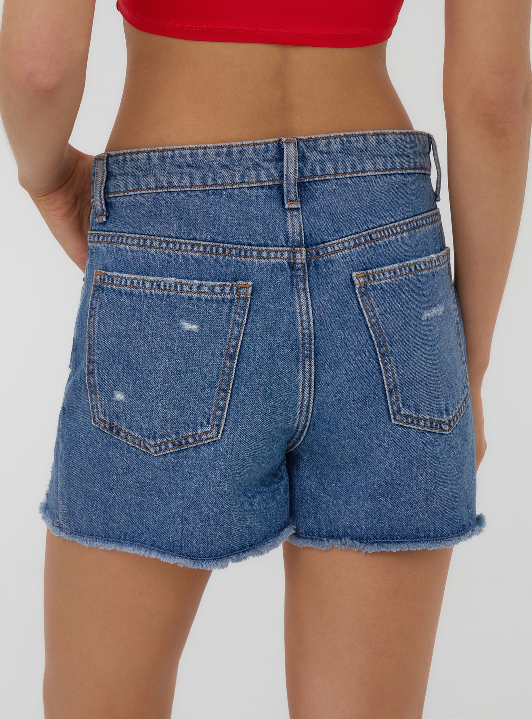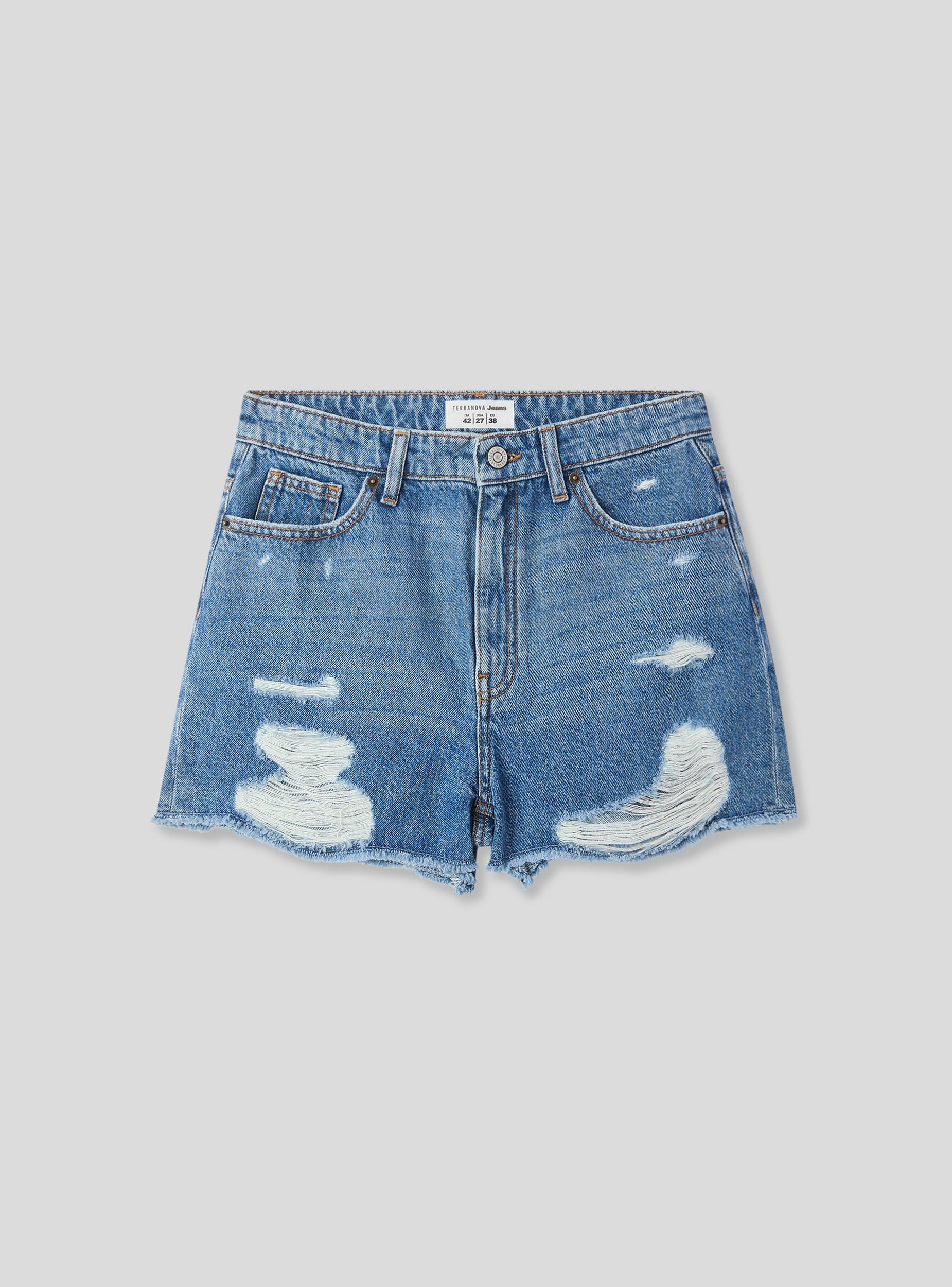 Pantallona të shkurtra për gra në denim me stilin mom, perfekte për një pamje të guximshme dhe në modë. Dizajni ka çarje strategjike që i japin një prekje të rastësishme dhe të përdorur, ndërsa fundi i çarë thekson karakterin e guximshëm të modelit. Mbyllje me buton dhe zinxhir për një përshtatje të rehatshme, e plotësuar me rripa në bel për shtimin e një brez. Ideale me një t-shirt dhe sneakers për ditën, ose me një këmishë dhe sandale për një veshje verore në modë.