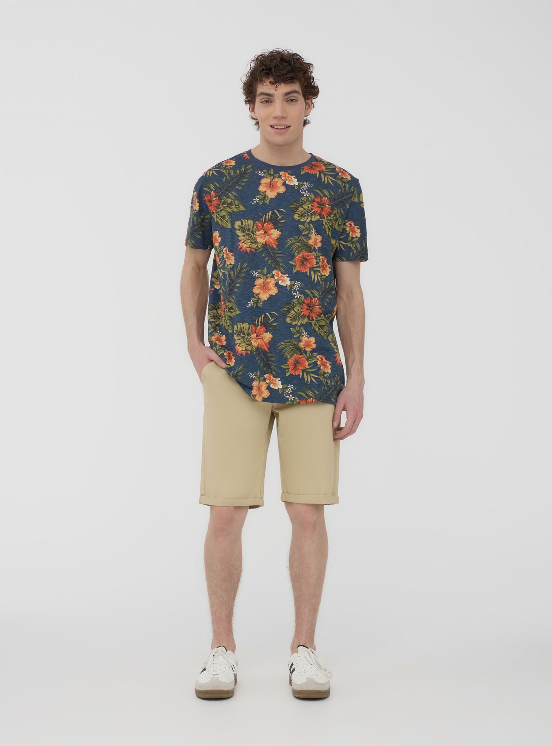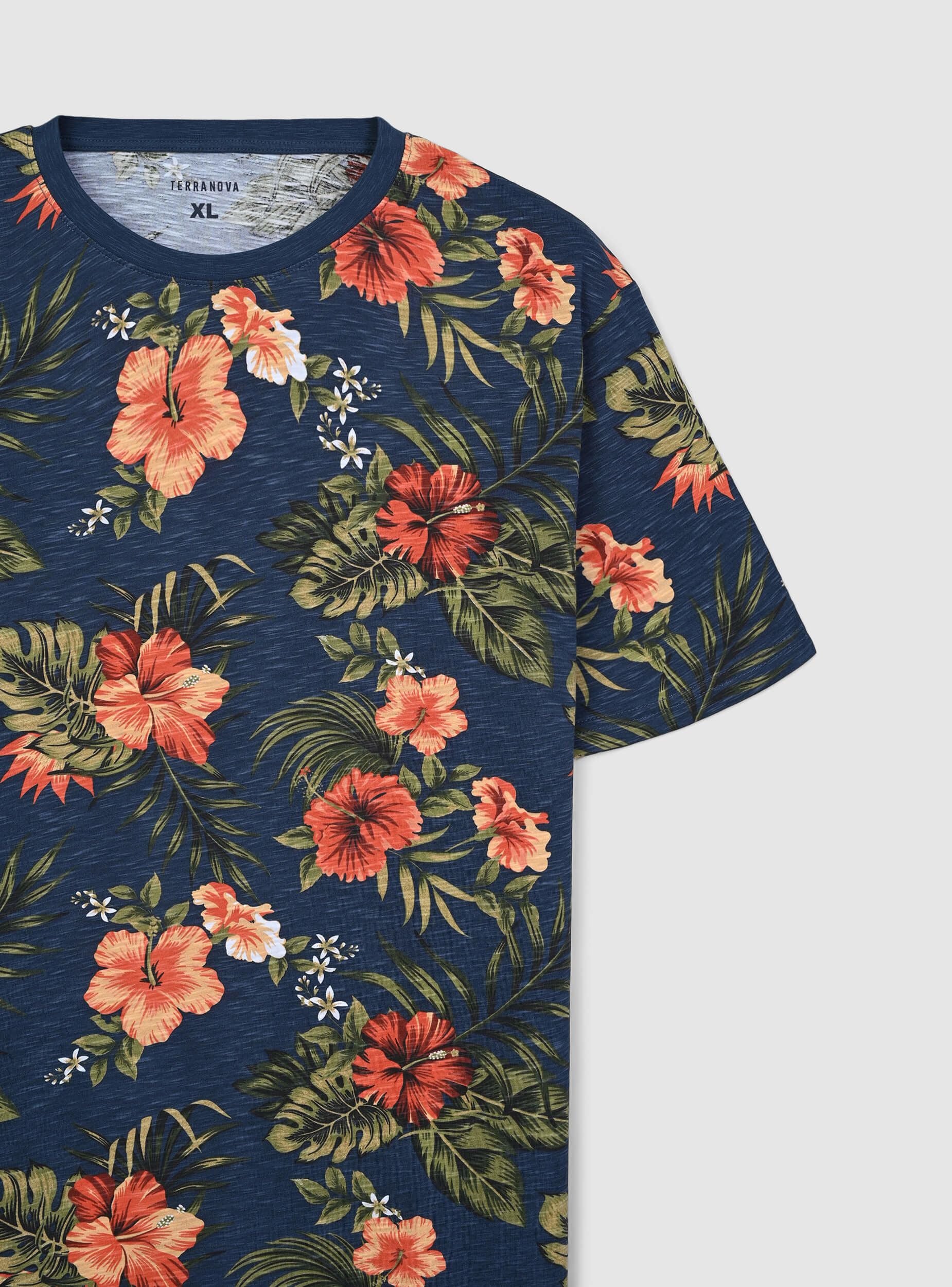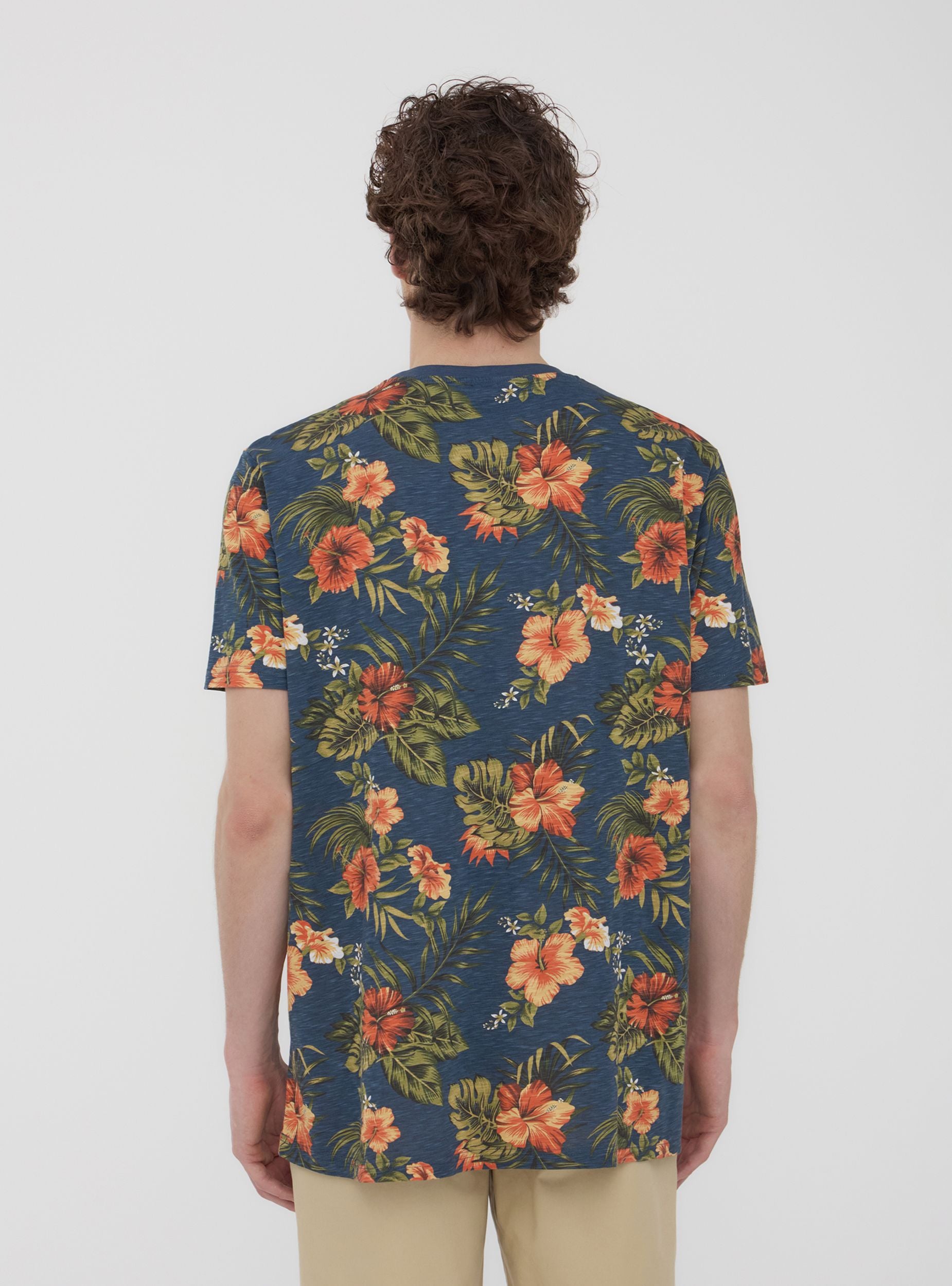 T-shirt për burra me mëngë të shkurtra dhe qafë rrethore, e dekoruar me një fantazi të gjallë lulesh me ngjyra që i jep një prekje ekzotike dhe origjinale. E përsosur për verën, ajo kombinohet lehtësisht me bermuda ose xhinse për një pamje të rastësishme dhe të relaksuar, ideale për kohën e lirë, pushime ose mbrëmje informale. Dizajni i freskët dhe i lehtë e bën atë një zgjedhje të shkëlqyer për të shtuar personalitet dhe stil në gardërobën verore.Detajet