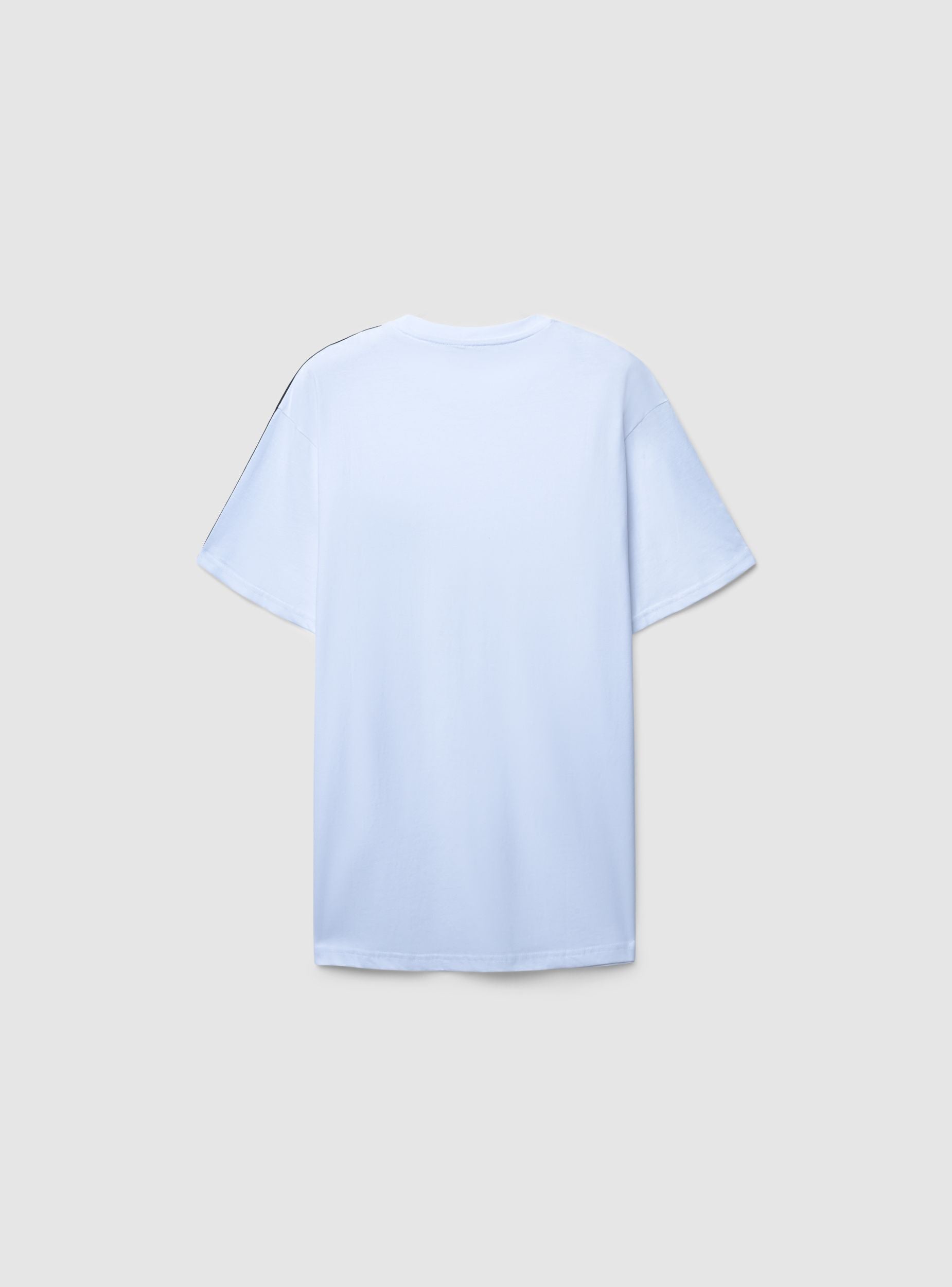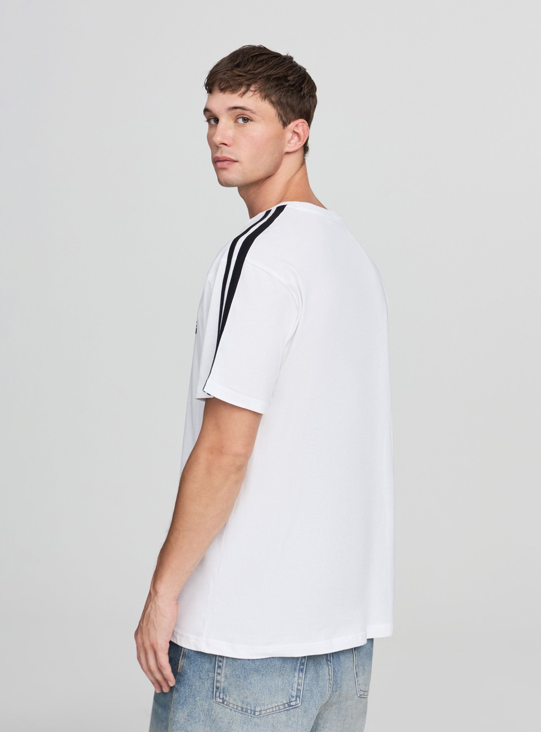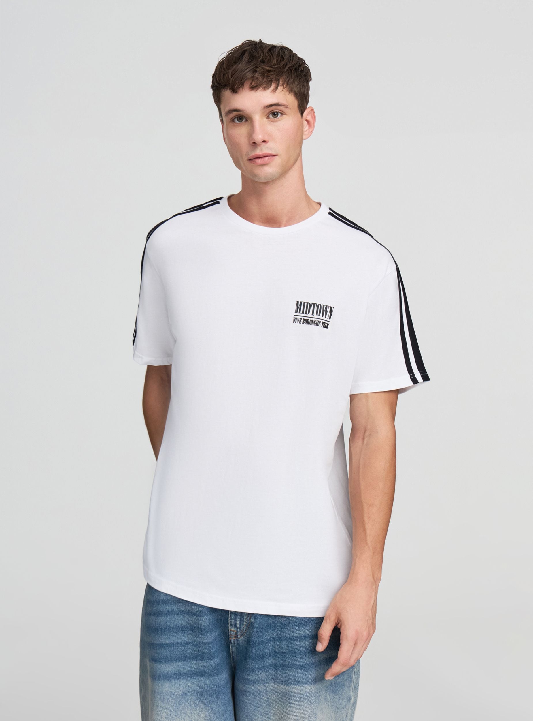 Triko me mëngë të shkurtra për burrat me qafë rrethore dhe përshtatje të lirë. Dizajn me ngjyrë të njëtrajtshme me shirita kontrasti përgjatë shpatullave dhe printim të vogël me shkronja në pjesën e përparme. E përkryer për një stil casual dhe urban, përshtatet me xhinse ose pantallona sportive dhe atlete. Ideale për kohën e lirë dhe për të shtuar një prekje sportive në veshjet e përditshme.