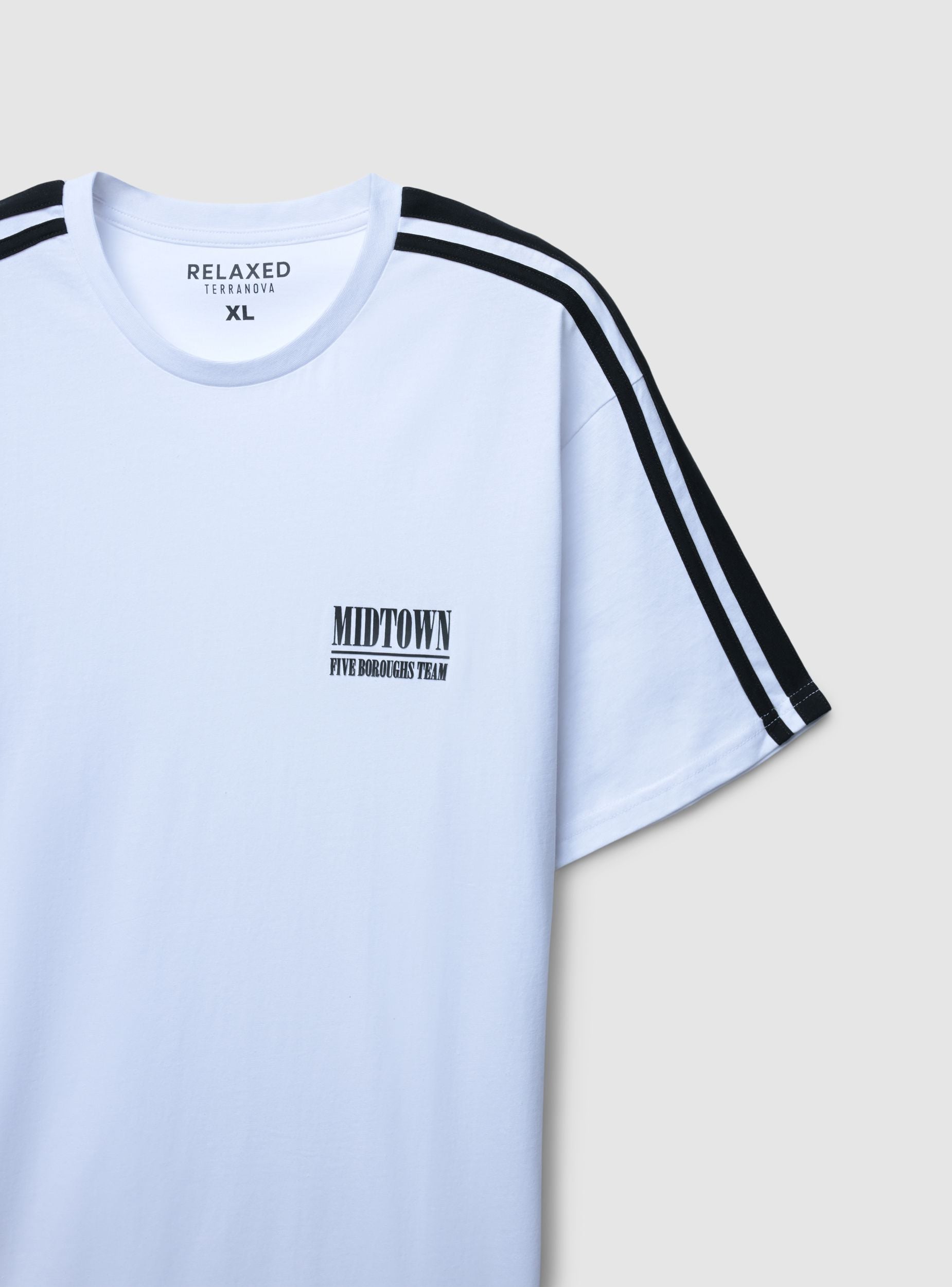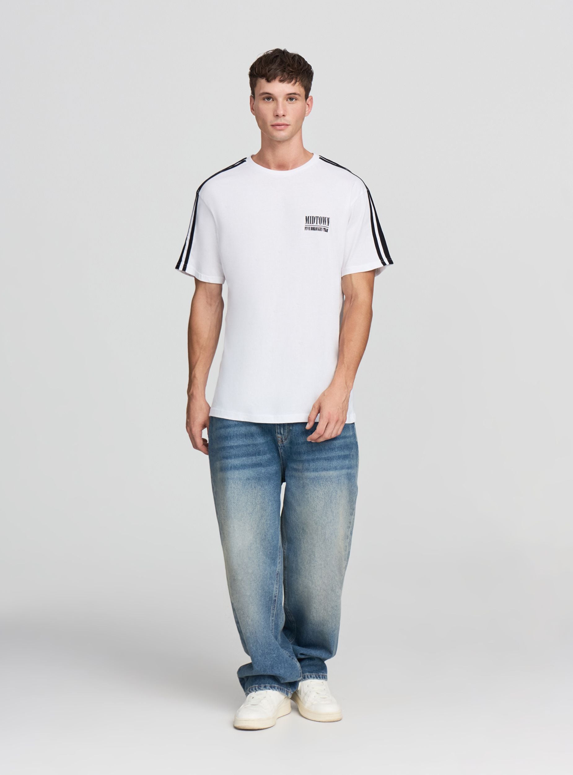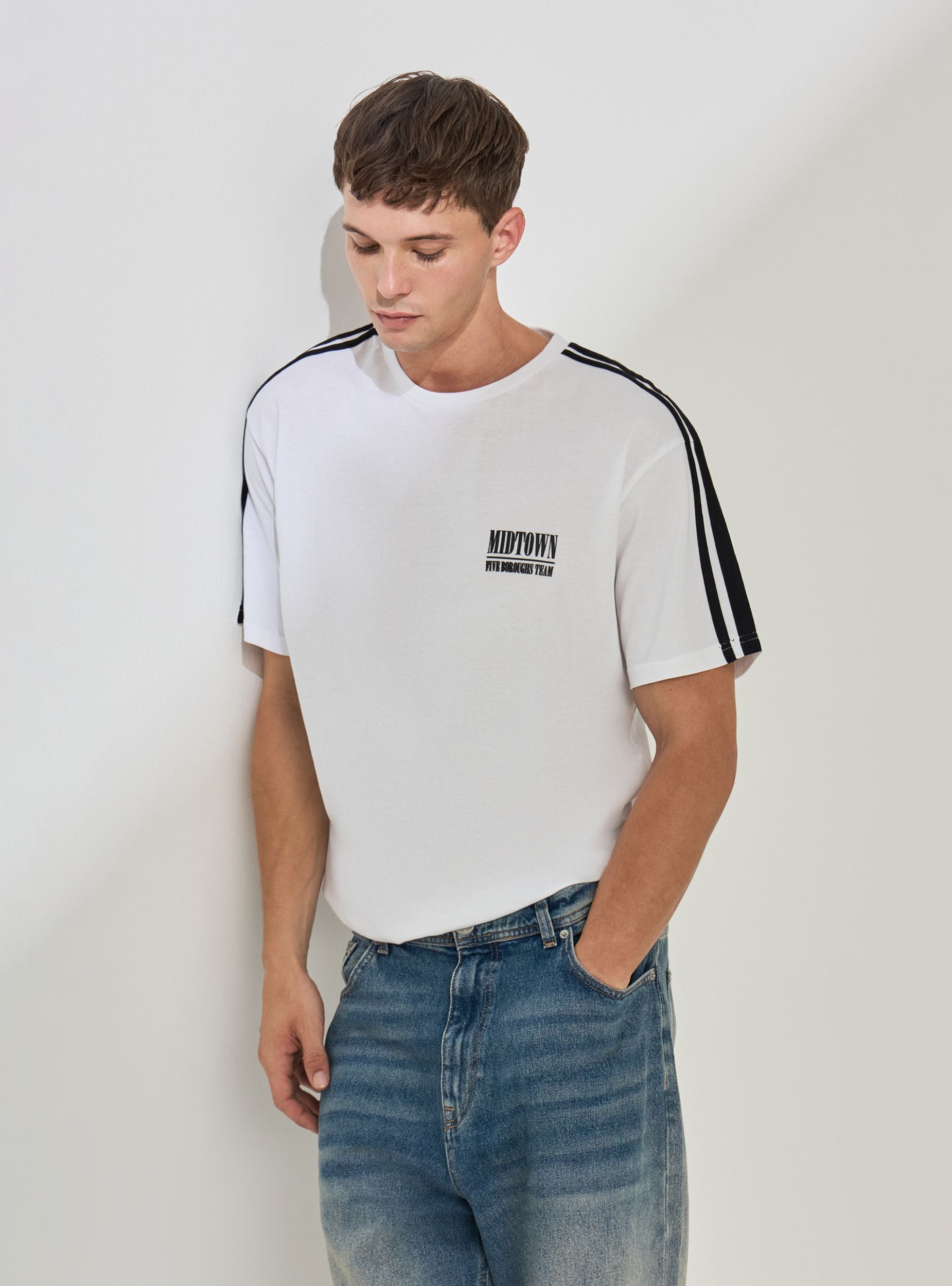 Triko me mëngë të shkurtra për burrat me qafë rrethore dhe përshtatje të lirë. Dizajn me ngjyrë të njëtrajtshme me shirita kontrasti përgjatë shpatullave dhe printim të vogël me shkronja në pjesën e përparme. E përkryer për një stil casual dhe urban, përshtatet me xhinse ose pantallona sportive dhe atlete. Ideale për kohën e lirë dhe për të shtuar një prekje sportive në veshjet e përditshme.