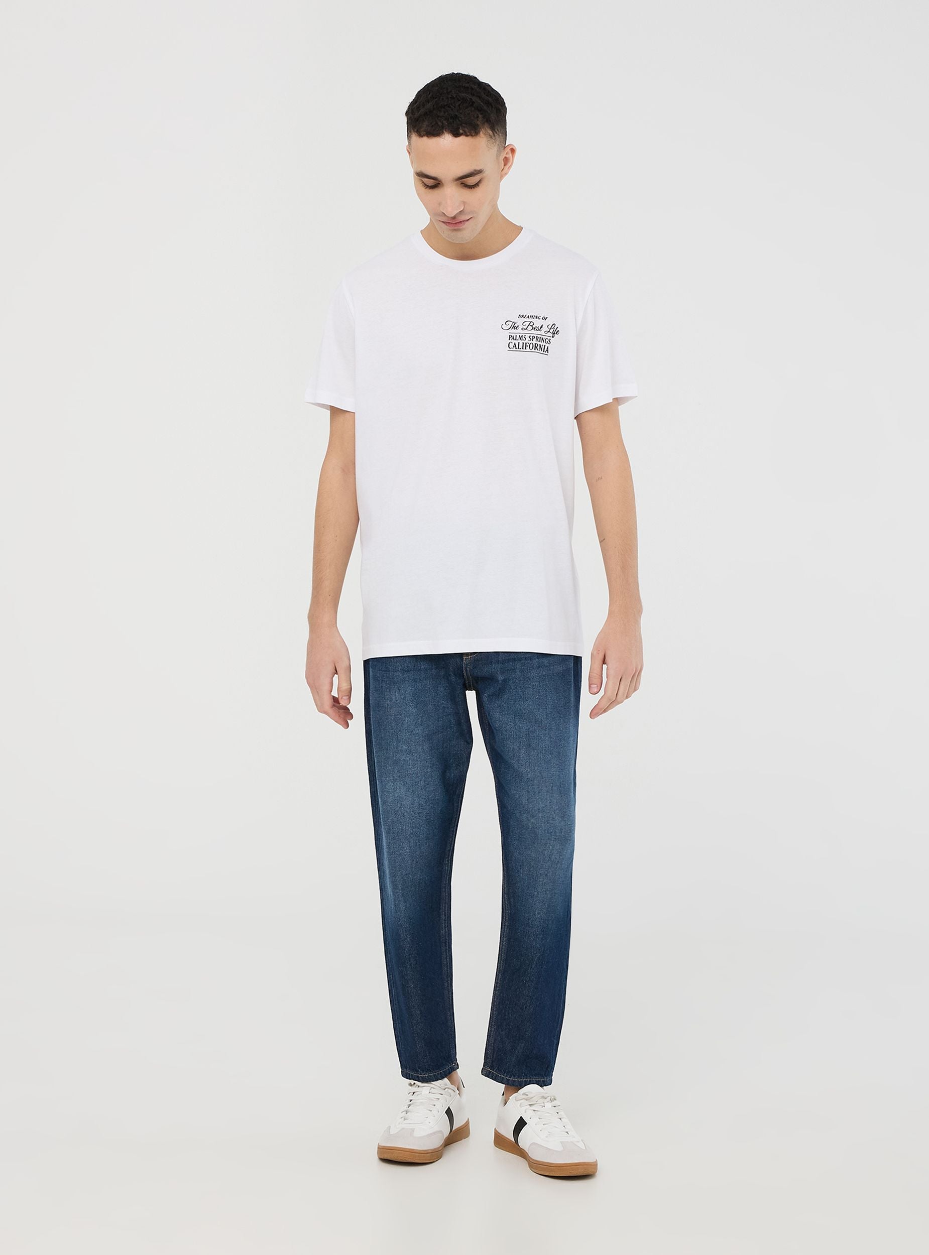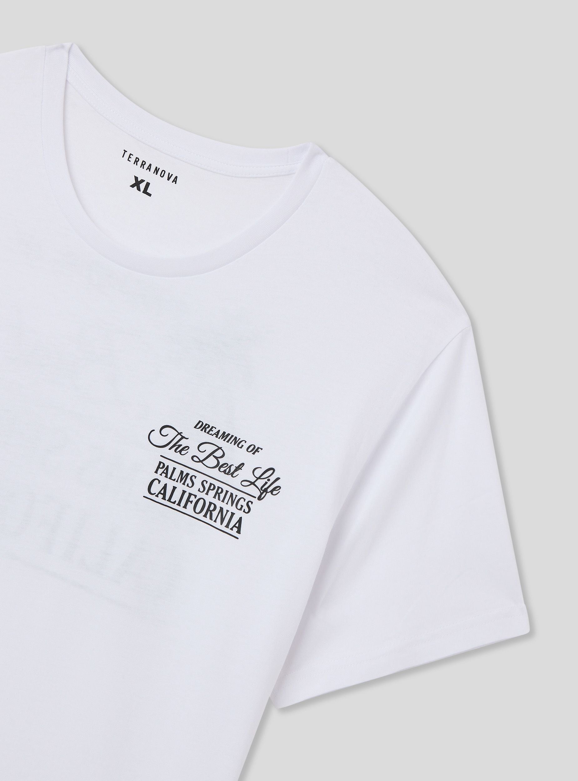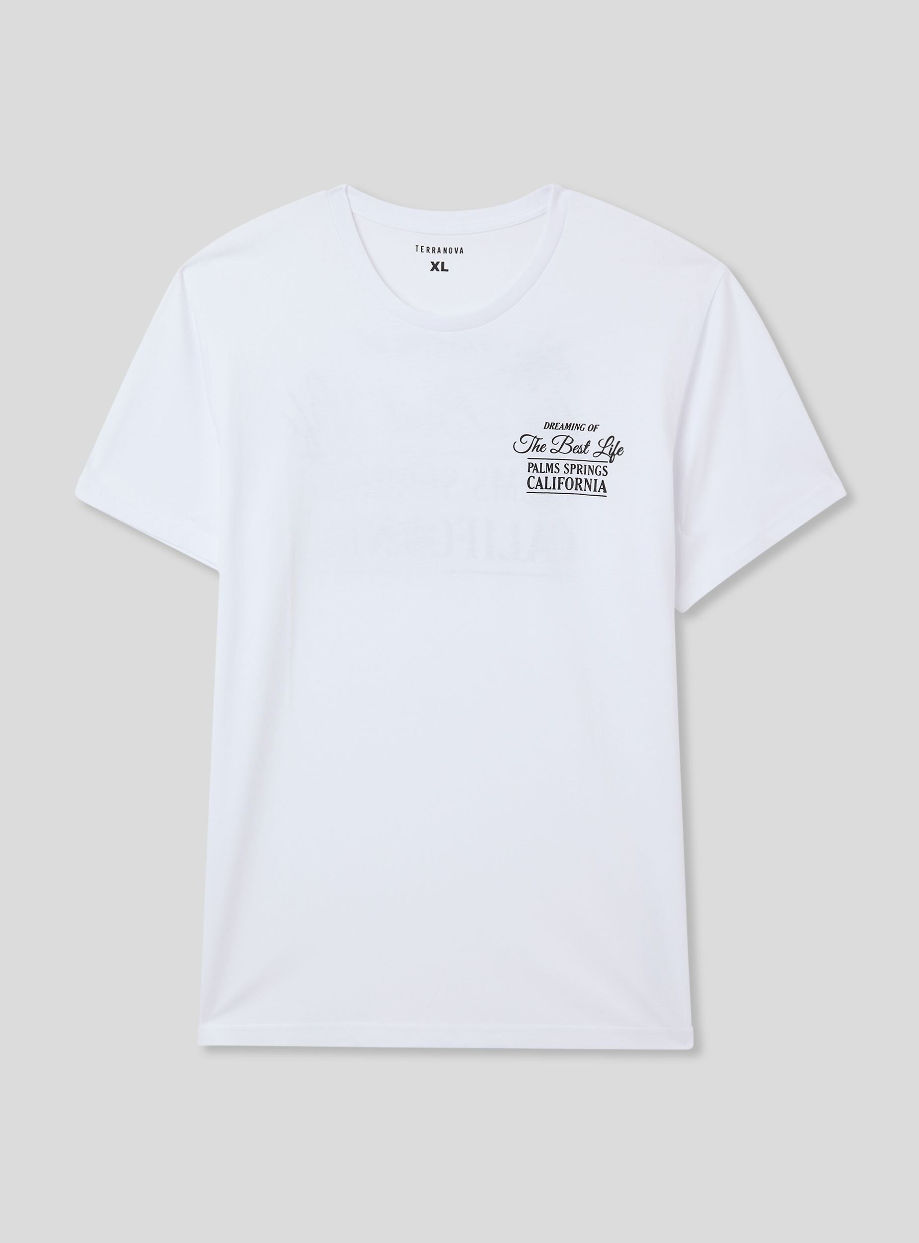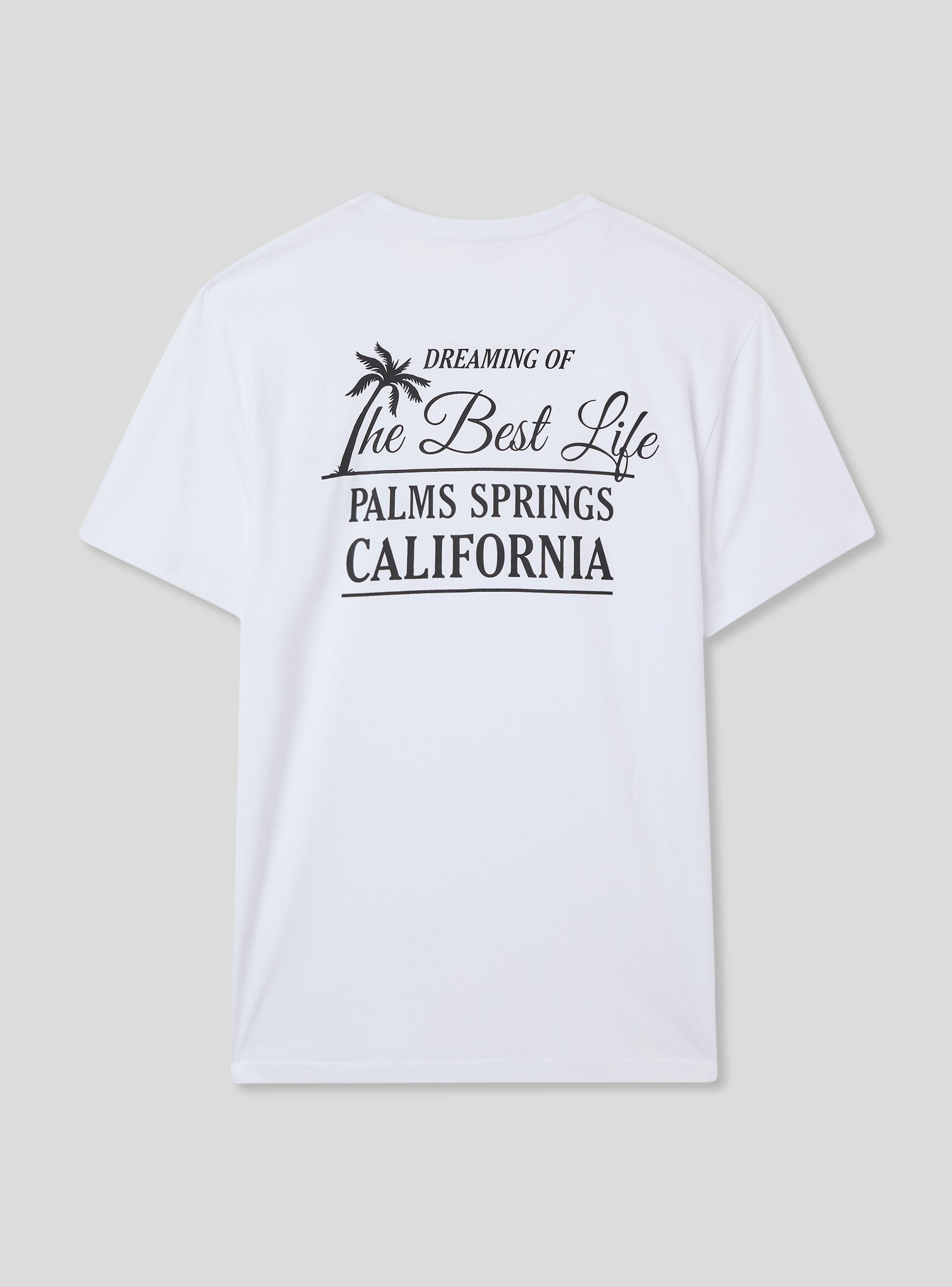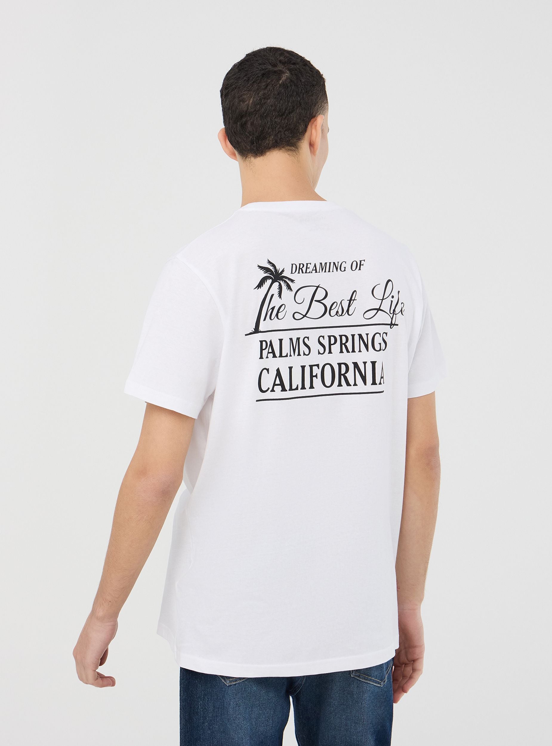 T-shirt për burra e përsosur për veshje casual. E karakterizuar nga një shkronjë dekorative përpara dhe prapa e shoqëruar me një motiv palmash, i jep një prekje freskuese dhe të relaksuar. Mëngët e shkurtra dhe qafa e rrumbullakët përfundojnë një dizajn praktik dhe të shumëanshëm, ideal për një pamje casual dhe komode.Detajet