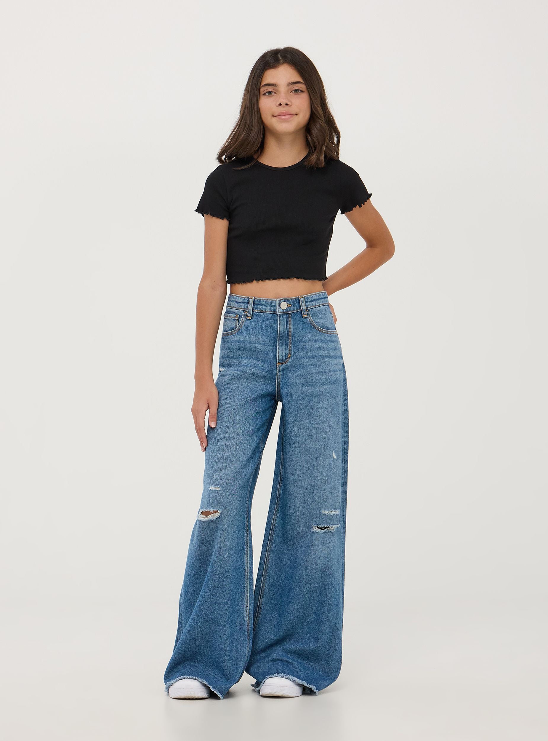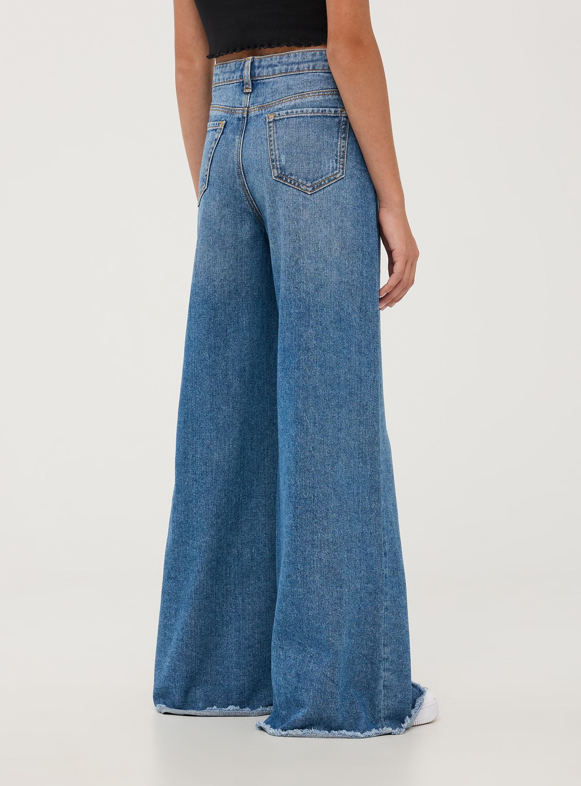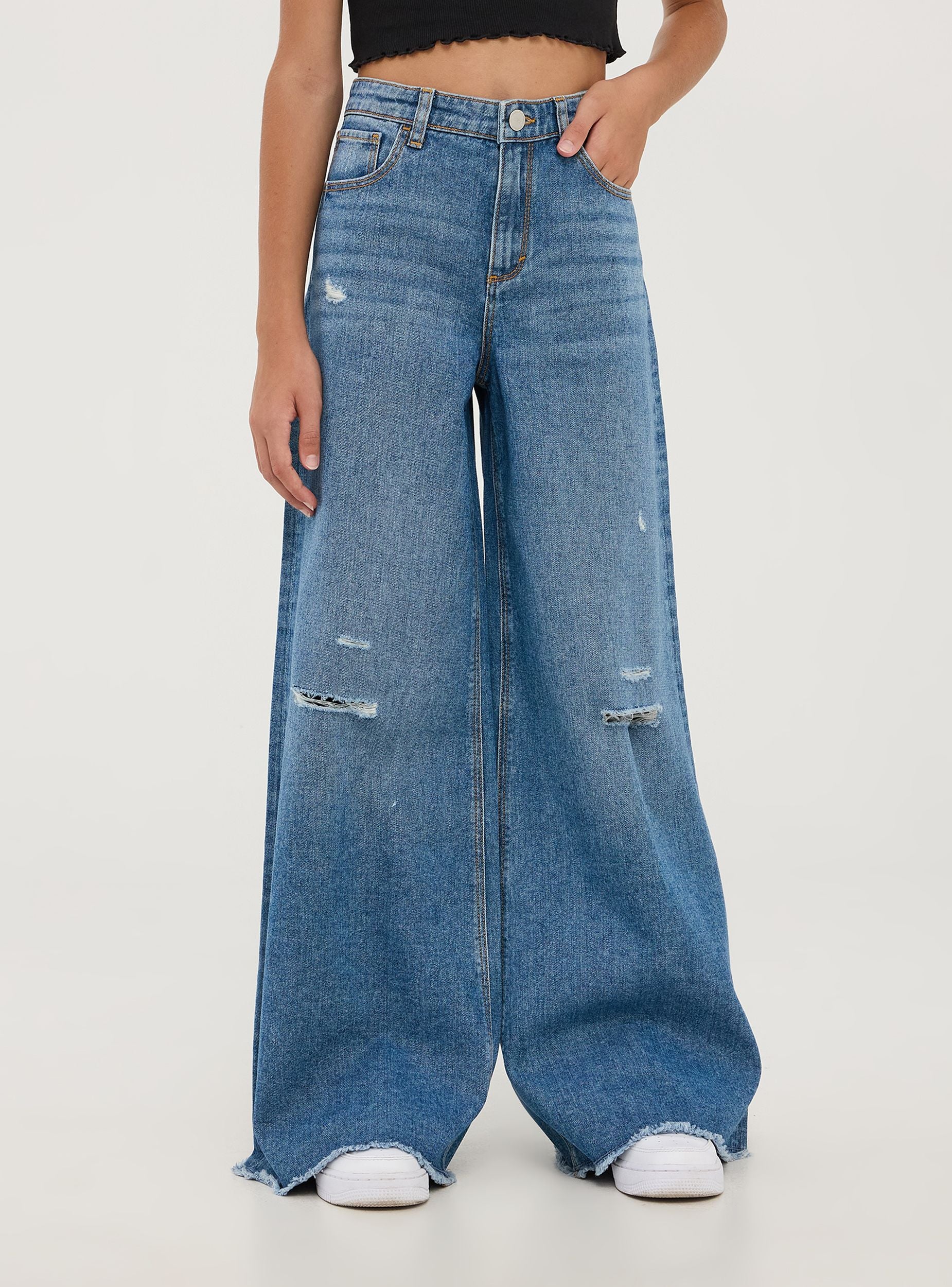 Jeans wide leg për vajza të realizuar në denim pambuku blu. Kanë një efekt të veshur në këmbë me çarje dhe detaje të çara për një stil të rastësishëm dhe në modë. Mbyllja është me buton dhe zinxhir, dhe kanë pesë xhepa praktikë. Përshtatja është shumë e gjerë dhe e relaksuar, e përsosur për veshje të rastësishme ditorë dhe mbrëmje informale. Përfundimi me prerje të çarë në fund i shton një prekje unike.Detajet
