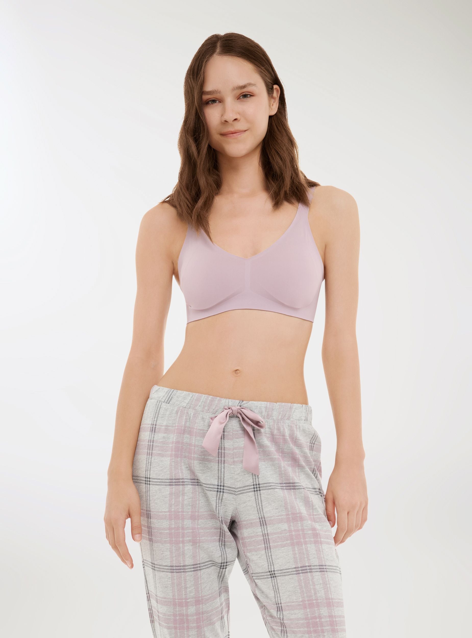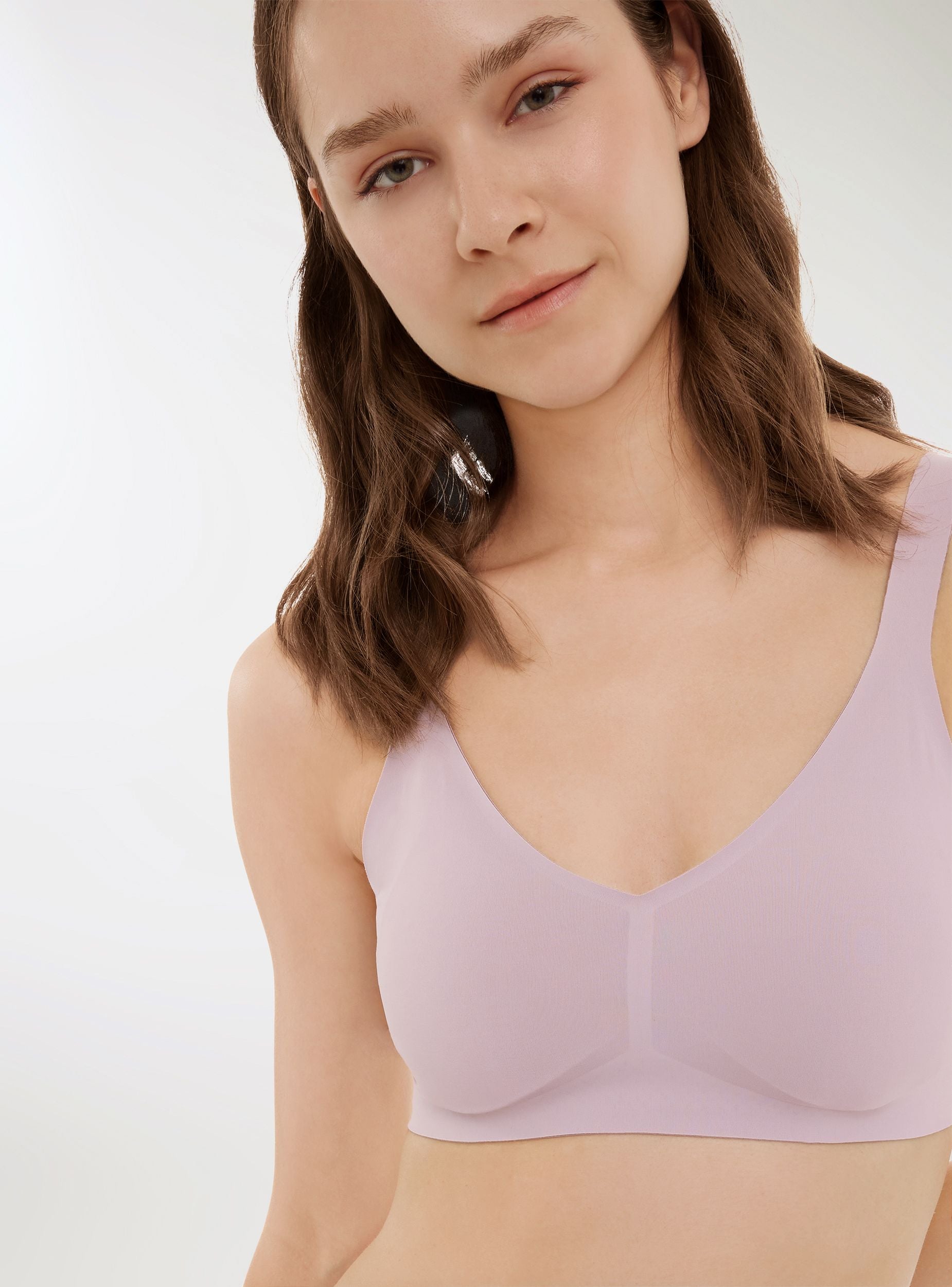 Ženski grudnjak jednostavnog dizajna, idealan za svakodnevnu udobnost. Model bez žice sa širokim naramenicama i ravnim rubom, savršen ispod uskih haljina zahvaljujući nevidljivoj završnoj obradi. Prilagodljiv kroj koji ističe siluetu, idealan za nošenje tokom celog dana. Lako se kombinuje sa uskim gaćicama ili osnovnim komadima za praktičan i diskretan izgled.